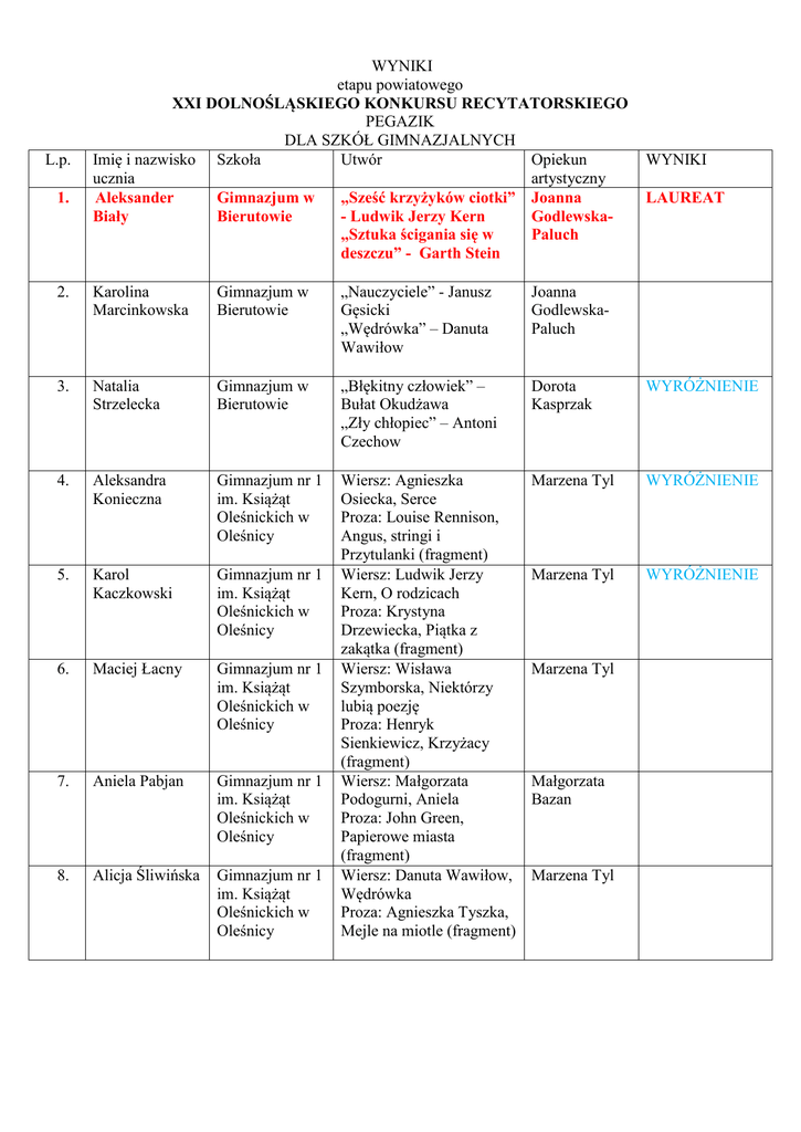 L.p. 1. WYNIKI etapu powiatowego XXI DOLNOŚLĄSKIEGO KONKURSU RECYTATORSKIEGO PEGAZIK DLA SZKÓŁ GIMNAZJALNYCH Imię i nazwisko Szkoła Utwór Opiekun ucznia artystyczny Aleksander Gimnazjum w „Sześć krzyżyków ciotki” Joanna Biały Bierutowie - Ludwik Jerzy Kern Godlewska„Sztuka ścigania się w Paluch deszczu” - Garth Stein WYNIKI LAUREAT 2. Karolina Marcinkowska Gimnazjum w Bierutowie „Nauczyciele” - Janusz Gęsicki „Wędrówka” – Danuta Wawiłow Joanna GodlewskaPaluch 3. Natalia Strzelecka Gimnazjum w Bierutowie „Błękitny człowiek” – Bułat Okudżawa „Zły chłopiec” – Antoni Czechow Dorota Kasprzak WYRÓŻNIENIE 4. Aleksandra Konieczna Gimnazjum nr 1 im. Książąt Oleśnickich w Oleśnicy Marzena Tyl WYRÓŻNIENIE 5. Karol Kaczkowski Gimnazjum nr 1 im. Książąt Oleśnickich w Oleśnicy Marzena Tyl WYRÓŻNIENIE 6. Maciej Łacny Gimnazjum nr 1 im. Książąt Oleśnickich w Oleśnicy 7. Aniela Pabjan Gimnazjum nr 1 im. Książąt Oleśnickich w Oleśnicy 8. Alicja Śliwińska Gimnazjum nr 1 im. Książąt Oleśnickich w Oleśnicy Wiersz: Agnieszka Osiecka, Serce Proza: Louise Rennison, Angus, stringi i Przytulanki (fragment) Wiersz: Ludwik Jerzy Kern, O rodzicach Proza: Krystyna Drzewiecka, Piątka z zakątka (fragment) Wiersz: Wisława Szymborska, Niektórzy lubią poezję Proza: Henryk Sienkiewicz, Krzyżacy (fragment) Wiersz: Małgorzata Podogurni, Aniela Proza: John Green, Papierowe miasta (fragment) Wiersz: Danuta Wawiłow, Wędrówka Proza: Agnieszka Tyszka, Mejle na miotle (fragment) Marzena Tyl Małgorzata Bazan Marzena Tyl Gimnazjum Gminne w Dobroszycach „Odys” Leopold Staff Emanuela Statnik 10. Dominik Sieradzki Zespół Szkół Specjalnych w Twardogórze Jadwiga Wołkowska 11. Kacper Mularczyk Gimnazjum nr 1 im. Polskich Olimpijczyków w Twardogórze 12. Aleksandra Lorek Gimnazjum nr 1 im. Polskich Olimpijczyków w Twardogórze 13. Zuzanna Antonowicz Gimnazjum nr 1 im. Polskich Olimpijczyków w Twardogórze Lech Makowiecki Patriotyzm, " Oskar i Pani Róża" EricEmmanuel Schmitt fragm. "Szanowny Panie Boże" Krzysztof Kamil Baczyński .- Trzeba umieć ludzi pokochać, Aleksander Kamiński .Kamienie na szaniec fragm.. Maria PawlikowskaJasnorzewska .Najpiękniejszy sen, Michaił Bułhakow .Mistrz i Małgorzata fragm.. Ilia Erenburg .- Francja w lecie 1940 fragm., Marta Fox .- Kaśka Podrywaczka fragm.. 14. Nawrot Michalina Gimnazjum im. Jana Pawła II w Sycowie „Wrażenia z teatru” Wisława Szymborska „Mały Książę” Antoine de Saint -Exupery Agata Grzesiak 15. Bilska Martyna Gimnazjum im. Jana Pawła II w Sycowie „Urszula Kochanowska” Bolesław Leśmian „Opium w rosole” Małgorzata Musierowicz Agata Grzesiak 16. Maja Adamus Gimnazjum w Dziadowej Kłodzie Dziewczyna, B. Leśmian Kamienie na szaniec, A. Kamiński Katarzyna Korczak 17. Karolina Gawron Gimnazjum w Dziadowej Kłodzie Miejmy nadzieję, A. Asnyk Wszystko, tylko nie mięta, E. Nowak Zdzisław Nowak 9. Jan Zawadzki WYRÓŻNIENIE Dorota SiemaszkoBabij Dorota SiemaszkoBabij Dorota SiemaszkoBabij LAUREAT