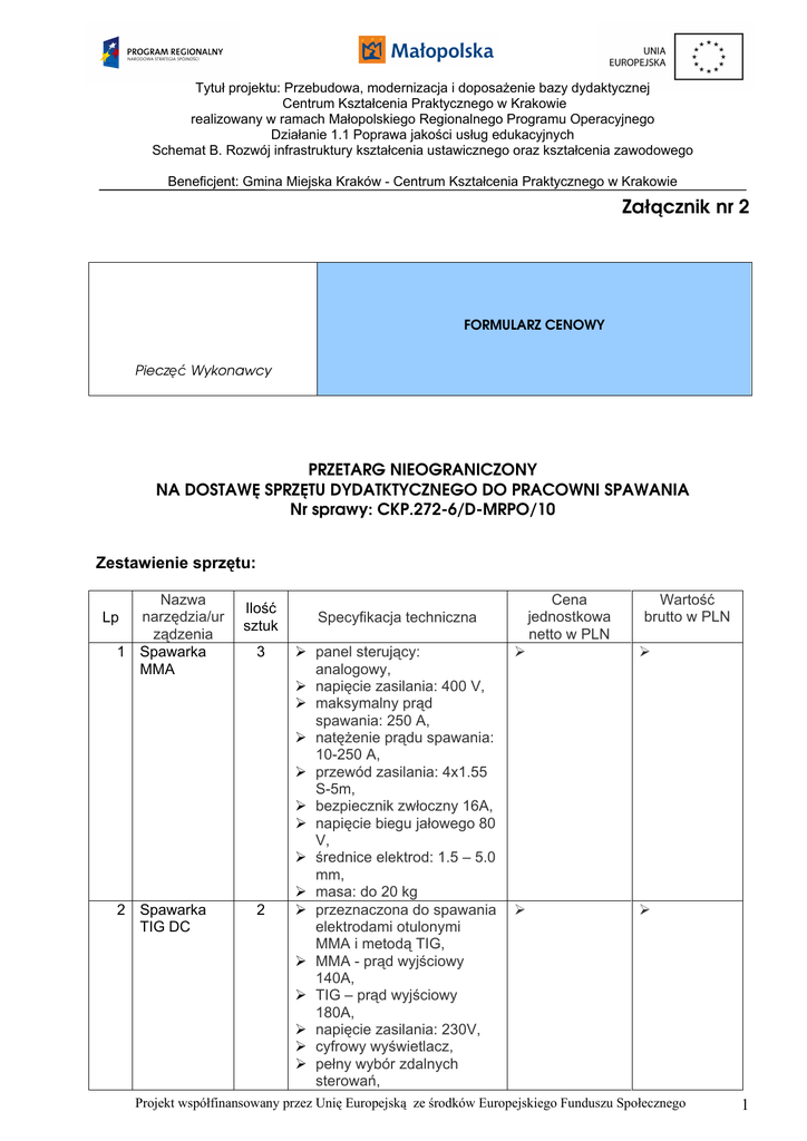 Tytuł projektu: Przebudowa, modernizacja i doposażenie bazy dydaktycznej Centrum Kształcenia Praktycznego w Krakowie realizowany w ramach Małopolskiego Regionalnego Programu Operacyjnego Działanie 1.1 Poprawa jakości usług edukacyjnych Schemat B. Rozwój infrastruktury kształcenia ustawicznego oraz kształcenia zawodowego Beneficjent: Gmina Miejska Kraków - Centrum Kształcenia Praktycznego w Krakowie Załącznik nr 2 FORMULARZ CENOWY Pieczęć Wykonawcy PRZETARG NIEOGRANICZONY NA DOSTAWĘ SPRZĘTU DYDATKTYCZNEGO DO PRACOWNI SPAWANIA Nr sprawy: CKP.272-6/D-MRPO/10 Zestawienie sprzętu: Nazwa narzędzia/ur ządzenia 1 Spawarka MMA Lp 2 Spawarka TIG DC Ilość sztuk 3 2 Cena jednostkowa netto w PLN Specyfikacja techniczna panel sterujący: analogowy, napięcie zasilania: 400 V, maksymalny prąd spawania: 250 A, natężenie prądu spawania: 10-250 A, przewód zasilania: 4x1.55 S-5m, bezpiecznik zwłoczny 16A, napięcie biegu jałowego 80 V, średnice elektrod: 1.5 – 5.0 mm, masa: do 20 kg przeznaczona do spawania elektrodami otulonymi MMA i metodą TIG, MMA - prąd wyjściowy 140A, TIG – prąd wyjściowy 180A, napięcie zasilania: 230V, cyfrowy wyświetlacz, pełny wybór zdalnych sterowań, Wartość brutto w PLN Projekt współfinansowany przez Unię Europejską ze środków Europejskiego Funduszu Społecznego 1 Tytuł projektu: Przebudowa, modernizacja i doposażenie bazy dydaktycznej Centrum Kształcenia Praktycznego w Krakowie realizowany w ramach Małopolskiego Regionalnego Programu Operacyjnego Działanie 1.1 Poprawa jakości usług edukacyjnych Schemat B. Rozwój infrastruktury kształcenia ustawicznego oraz kształcenia zawodowego Beneficjent: Gmina Miejska Kraków - Centrum Kształcenia Praktycznego w Krakowie 3 Spawarka TIG DC 2 4 Spawarka TIG DC 2 5 Spawarka TIG AC/DC 2 6 Spawarka TIG AC/DC 2 7 Półautomat konwencjon alny 10 masa: do 8 kg panel sterujący: podstawowy, napięcie zasilania: 230V, maksymalny prąd spawania: 200A, przewód zasilający: 3x2.55m, bezpiecznik zwłoczny: 16A, zakres prądu spawania: 5200A, średnica elektrod: 1.5-4.0 mm, masa: do 15 kg panel sterujący: z pulsacją, napięcie zasilania: 230V, maksymalny prąd spawania: 200A, przewód zasilający: 3x2.55m, bezpiecznik zwłoczny: 16A, zakres prądu spawania: 5200A, średnica elektrod: 1.5-4.0 mm, masa: do 15 kg chłodzenie gazem, panel sterujący: podstawowy, napięcie zasilania: 230V, maksymalny prąd spawania: 230A w cyklu 40% i 170A w cyklu pracy ciągłej, bezpiecznik zwłoczny: 16A, masa: do 15 kg chłodzenie cieczą, panel sterujący: z pulsacją, napięcie zasilania: 400V, maksymalny prąd spawania: 350A w cyklu 60% i 280A w cyklu pracy ciągłej, zakres prądu spawania: TIG DC – 3 do 350 A, TIG AC – 10 do 350A, MMA – 10 do 350A, bezpiecznik zwłoczny: 20A, masa: do 75 kg chłodzenie uchwytu gazem, napięcie zasilania: 380415V, Projekt współfinansowany przez Unię Europejską ze środków Europejskiego Funduszu Społecznego 2 Tytuł projektu: Przebudowa, modernizacja i doposażenie bazy dydaktycznej Centrum Kształcenia Praktycznego w Krakowie realizowany w ramach Małopolskiego Regionalnego Programu Operacyjnego Działanie 1.1 Poprawa jakości usług edukacyjnych Schemat B. Rozwój infrastruktury kształcenia ustawicznego oraz kształcenia zawodowego Beneficjent: Gmina Miejska Kraków - Centrum Kształcenia Praktycznego w Krakowie MIG/MAG 8 Półautomat inwertorowy MIG/MAG 1 9 Urządzenie do cięcia plazmą powietrzną 1 10 Przecinarka półautomaty czna do cięcia tlenem z napędem elektryczny m (sekator) 2 11 Suszarka do elektrod 1 12 Pojemnik do suchego składowania elektrod 1 obciążalność: 400/34 A/V, ilość stopni zadawania napięcia spawania: 56 stopni, średnica drutu: 0,6 do 1,6 mm, kabel: 4,5m, uchwyt: MIG masa: do 130 kg chłodzenie uchwytu płynem, napięcie zasilania: 400V, prąd wyjściowy 300 A, płynne zadawanie napięcia spawania, podajnik drutu: podstawowy szpula 300 mm, kabel: 3 m, uchwyt: MIG chłodnica płynu, elektroniczna nastawa indukcyjności, sterowanie napięciem i podawaniem drutu podczas spawania. urządzenie inwertorowe do cięcia plazmowego, grubość cięcia 14 mm cięcie aluminium i stali wysokostopowej w komplecie: palnik wózek z prowadnicą szynową cyrkiel zakres grubości cięcia - 3 ÷ 100mm tor jezdny 2x1,2 mb - 1 kpl zasilanie gazem: acetylentlen lub propan-tlen pojemność: do 24 kg temperatura suszenia (ºC) 50-300 napięcie (V) 230 moc grzałki (KW) 0,5 masa do 15 kg pojemność – 9 kg, temperatura składowania 100°C, zasilanie 24 V, Projekt współfinansowany przez Unię Europejską ze środków Europejskiego Funduszu Społecznego 3 Tytuł projektu: Przebudowa, modernizacja i doposażenie bazy dydaktycznej Centrum Kształcenia Praktycznego w Krakowie realizowany w ramach Małopolskiego Regionalnego Programu Operacyjnego Działanie 1.1 Poprawa jakości usług edukacyjnych Schemat B. Rozwój infrastruktury kształcenia ustawicznego oraz kształcenia zawodowego Beneficjent: Gmina Miejska Kraków - Centrum Kształcenia Praktycznego w Krakowie 13 Ostrzałka do elektrod wolframowyc h 1 masa do 6 kg napęd: 220V/50Hz/400W prędkość obrotowa: 3000 obr/min masa: do 12 kg tarcza diamentowa D76 125x19x13mm tarcza ścierna SC80 125x16x13mm zakres średnic elektrod: Ø1,0-4,8 mm zakres długości elektrod: 25-175 mm zakres kątów: 0º - 135º wodny system filtrowania pyłów 14 Piła mechaniczn a 1 napęd hydrauliczny, nacisk brzeszczotu nastawiany płynnie, rozmiar brzeszczotu: 450 mm, 15 Nożyce dźwigniowe do blach 2 skos cięcia do 45°, przekrój cięcia do 280 mm, materiał do cięcia: stal 16 Prasa hydrauliczna 1 17 Szlifierka kątowa 18 Szlifierka stołowa 3 1 19 Stoły ślusarskie 3 okrągła – max 20 mm, stal o profilu kwadratowym – max 18 mm, blacha – max 6 mm, mechanizm utrzymujący ramię w górnym położeniu, długość noży – 175 mm. napęd elektryczny z windą do regulacji wysokości łoża, co najmniej dwie 