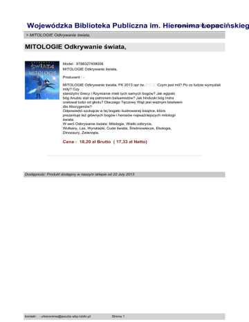 Utworzono : 07Łopacińskieg March 2017 Wojewódzka Biblioteka Publiczna im. Hieronima > MITOLOGIE Odkrywanie świata, MITOLOGIE Odkrywanie świata, Model : 9788327408006 MITOLOGIE Odkrywanie świata, Producent : MITOLOGIE Odkrywanie świata, FK 2013 opr.tw.��� Czym jest mit? Po co ludzie wymyślali mity? Czy starożytni Grecy i Rzymianie mieli tych samych bogów? Jak egipski bóg Anubis stał się patronem balsamistów? Jak hinduski bóg Indra uratował ludzi od głodu? Dlaczego Tęczowy Wąż jest ważnym bóstwem dla Aborygenów? Odpowiedzi szukajcie w tej bogato ilustrowanej książce, która prezentuje też głównych bogów i herosów najważniejszych mitologii świata. W serii Odkrywanie świata: Mitologie, Wielki odkrycia, Wulkany, Las, Wynalazki, Cuda świata, Średniowiecze, Ekologia, Dinozaury, Zwierzęta. Cena : 18,20 zł Brutto ( 17,33 zł Netto) Dostępność: Produkt dostępny w naszym sklepie od 22 July 2013 kontakt : - [email protected] Strona 1