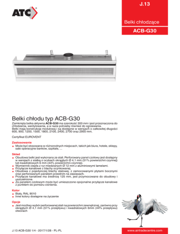 J.13 Belki chłodzące ACB-G30 Belki chłodu typ ACB-G30 Zamknięta belka aktywna ACB-G30 ma szerokość 300 mm i jest przeznaczona do chłodzenia, wentylowania, a w razie potrzeby również do ogrzewania. Belki mają konstrukcję modułową i są dostępne w wersjach o całkowitej długości 600, 900, 1200, 1500, 1800, 2100, 2400, 2700 oraz 2950 mm. Certyfikat EUROVENT Zastosowanie ¾ Może być stosowana w różnorodnych miejscach, takich jak biura, hotele, sklepy, sale operacyjne banków, szpitale, ... Skład ¾ Obudowa belki jest wykonana ze stali. Perforowany panel czołowy jest dostępny w wersjach z siatką o oczkach okrągłych Ø 4,1 mm (51% powierzchni czynnej) lub kwadratowych 6 mm (44% powierzchni czynnej). ¾ Wymiennik ciepła z rur miedzianych Ø 12 mm z aluminiowymi lamelami. ¾ Przyłącze kanałowe z blachy ocynkowanej. ¾ Obudowa z pojedynczej blachy stalowej, z zamocowanymi płytami bocznymi oraz perforowanym panelem przednim na zawiasach. ¾ Przyłącze kanałowe ma średnicę 125 mm, jest przymocowane do obudowy i uszczelnione. ¾ Za panelem czołowym może być umieszczone opcjonalne przyłącze kanałowe z punktem do pomiaru ciśnienia. Kolor ¾ Biały, RAL 9010 ¾ Inne kolory dostępne na życzenie Opcje ¾ Jest możliwy wybór perforowanej stali na powierzchni zewnętrznej, zarówno przy okrągłych Ø 4,1 mm (51% przepływu) i kwadratowych 6mm (44% przepływu) otworach J.13 ACB-G30 1/4 - 2017/1/28 - PL-PL www.airtradecentre.com J.13 Belki chłodzące Wersje ¾ Szerokość wieńca zawsze 300 mm ¾ Długość wymiennika ciepła od 600 do 2950 mm Opis produktu ¾ W celu uzyskania danych technicznych prosimy skontaktować się z firmą Air Trade Centre. Tabele chłodzenia Długość=600 K-30 Chłodzenie Dysza "B" 600mm Dysza "C" 600mm Dysza "D" 600mm Długość=900 K-30 Chłodzenie Dysza "B" 900mm Dysza "C" 900mm Dysza "D" 900mm Długość=1200 K-30 Chłodzenie Dysza "B" 1200mm Dysza "C" 1200mm Dysza "D" 1200mm Długość=1500 K-30 Chodzenie Dysza "B" 1500mm Dysza "C" 1500mm Dysza "D" 1500mm Podstawowa objętość powietrza qv I/s m3/h Ps(Pa) 4.50 16 130 4.80 17 150 5.10 18 170 5.40 19 190 5.70 20 210 6.20 22 250 7 25 130 7.50 27 150 8 29 170 8.50 31 190 8.90 32 210 9.70 35 250 8.60 31 130 9.30 33 150 9.90 36 170 10.50 38 190 11 40 210 12 43 250 Podstawowa objętość powietrza qv I/s m3/h Ps(Pa) 8 29 130 8.50 31 150 9.10 33 170 9.60 35 190 10.10 36 210 11 40 250 12.40 45 130 13.30 48 150 14.10 51 170 14.90 54 190 15.70 57 210 17.10 62 250 15.30 55 130 16.40 59 150 17.40 63 170 18.40 66 190 19.40 70 210 21.20 76 250 Podstawowa objętość powietrza qv I/s m3/h Ps(Pa) 11.10 40 130 11.90 43 150 12.70 46 170 13.40 48 190 14.10 51 210 15.40 55 250 16.90 61 130 18.20 65 150 19.30 70 170 20.40 74 190 21.50 77 210 23.40 84 250 21.40 77 130 23 83 150 24.50 88 170 25.90 93 190 27.20 98 210 29.70 107 250 Podstawowa objętość powietrza qv I/s m3/h Ps(Pa) 14.10 51 130 15.20 55 150 16.20 58 170 17.10 62 190 18 65 210 19.60 71 250 21.60 78 130 23.20 84 150 24.70 89 170 26.20 94 190 27.50 99 210 30 108 250 27.60 99 130 29.70 107 150 31.60 114 170 33.40 120 190 35.10 126 210 38.30 138 250 J.13 ACB-G30 2/4 - 2017/1/28 - PL-PL Lw (NR) <23 23 24 25 27 29 <23 23 24 25 27 29 <23 23 24 25 27 29 8K 42 45 48 51 54 59 67 72 76 81 85 92 82 88 94 99 104 114 Lw (NR) <23 23 24 25 27 29 <23 23 24 25 27 29 <23 23 24 25 27 29 8K 76 81 86 91 96 105 117 126 134 142 149 163 145 156 166 175 184 201 Lw (NR) <23 23 24 25 27 29 <23 23 24 25 27 29 <23 23 24 25 27 29 8K 106 113 121 128 134 146 161 173 184 194 204 223 204 219 233 246 259 282 Lw (NR) <23 23 24 25 27 29 <23 23 24 25 27 29 <23 23 24 25 27 29 8K 134 144 154 162 171 186 206 221 235 249 261 285 262 282 300 317 334 364 Podstawowa zdolność (W) ΔTa = Trm-Tprim 9K 10K 48 53 51 57 54 61 58 64 61 67 66 73 75 83 81 89 86 95 91 101 95 106 104 115 92 103 99 110 106 117 112 124 117 131 128 142 Podstawowa zdolność (W) ΔTa = Trm-Tprim 9K 10K 85 94 91 101 97 108 103 114 108 120 118 131 132 147 142 158 151 168 160 178 168 187 183 204 163 181 175 195 186 207 197 219 207 230 226 251 Podstawowa zdolność (W) ΔTa = Trm-Tprim 9K 10K 119 132 128 142 136 151 144 160 151 168 165 183 181 201 194 216 207 230 219 243 230 255 251 279 229 255 246 273 262 291 277 308 291 324 318 353 Podstawowa zdolność (W) ΔTa = Trm-Tprim 9K 10K 151 168 162 180 173 192 183 203 192 213 210 233 231 257 248 276 265 294 280 311 294 327 321 356 295 328 317 352 338 375 357 397 375 417 409 455 6K 65 68 69 71 72 76 76 80 82 85 87 93 76 79 81 84 87 93 6K 108 110 113 116 119 125 126 129 134 139 144 152 126 130 134 139 143 151 6K 148 152 154 158 164 170 169 175 180 186 192 203 172 176 182 189 195 206 6K 189 194 199 204 210 218 218 225 232 240 248 262 222 228 235 245 253 267 Średnia zdolność (W) ΔT = Trm-Twi qw = 80 l/h ΔPw = 1,4 kPa 7K 8K 9K 76 87 98 79 90 102 81 92 104 83 94 106 84 96 108 88 101 114 89 102 114 93 106 119 95 109 123 99 113 127 102 117 131 108 124 139 89 101 114 93 106 119 95 109 122 98 112 126 102 116 131 108 124 139 Średnia zdolność (W) ΔT = Trm-Twi qw = 80 l/h ΔPw = 1,8 kPa 7K 8K 9K 126 144 162 128 146 164 132 151 170 135 155 174 138 158 178 146 167 188 147 168 189 151 172 194 156 178 200 162 186 209 168 192 216 177 203 228 146 167 188 151 173 195 156 178 201 162 185 208 167 191 215 177 202 227 Średnia zdolność (W) ΔT = Trm-Twi qw = 90 l/h ΔPw = 3 kPa 7K 8K 9K 172 197 221 177 202 227 180 206 231 184 211 237 191 219 246 199 227 256 198 226 254 204 233 262 210 240 271 217 248 279 224 256 288 236 270 304 200 229 257 205 234 264 212 242 273 221 252 284 228 260 293 240 274 309 Średnia zdolność (W) ΔT = Trm-Twi qw = 120 l/h ΔPw = 6,3 kPa 7K 8K 9K 220 252 283 226 259 291 233 266 299 238 272 306 245 280 315 255 291 327 254 291 327 263 300 338 271 309 348 280 320 360 290 331 372 306 349 393 259 296 333 265 303 341 275 314 353 286 327 368 295 337 379 311 355 400 www.airtradecentre.com 10K 109 113 115 118 120 126 127 133 136 141 146 155 127 132 136 140 145 155 