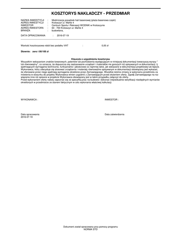 KOSZTORYS NAKŁADCZY - PRZEDMIAR NAZWA INWESTYCJI ADRES INWESTYCJI INWESTOR ADRES INWESTORA BRANŻA : : : : : DATA OPRACOWANIA Modrnizacja posadzek hali basenowej (plaża basenowa część) Krotoszyn ul. Mahle 4 Centrum Sportu i Rekreacji WODNIK w Krotoszynie 63 - 700 Krotoszyn ul. Mahle 4 budowlana, : 2016-07-19 Wartość kosztorysowa robót bez podatku VAT : 0,00 zł Słownie: zero i 00/100 zł Klauzula o uzgodnieniu kosztorysu Wszystkim wskazaniom znaków towarowych, patentów lub pochodzenia występującym w niniejszej dokumentacji towarzyszą wyrazy " lub równoważny", co oznacza, że dopuszcza się zastosowanie urządzeń i materiałów nie gorszych niż opisywanych w dokumentacji, tj. spełniających wymagania techniczne, funkcjonalne i jakościowe co najmniej takie, jak wskazane w dokumentacji projektowej lub lepsze. Wykonawca, który zdecyduje się stosować urządzenia i materiały równoważne opisywanym w dokumentacji obowiązany jest wykazać, że oferowane przez niego spełniają wymagania określone przez Zamawiającego. Wszelkie istotne zmiany w wykonaniu przedmiotu za mówienia w stosunku do projektu Wykonawca winien uzgodnić z Zamawiającym przed złożeniem oferty. Zgodę Zamawiającego na roz wiązania inne niż opisane w projekcie Wykonawca obowiązany jest w takim przypadku załączyć do oferty. Przed wykonaniem oferty należy zapoznać się ze specyfiką prac na budowie i dokonać indywidualnie weryfikacji niezbędnych wymiarów określonych w przedmiarze ze stanem faktycznym w celu wykonania właściwej kalkulacji. WYKONAWCA : INWESTOR : Data opracowania 2016-07-19 Data zatwierdzenia Dokument został opracowany przy pomocy programu NORMA STD OGÓLNA CHARAKTERYSTYKA OBIEKTU Zakres robót objęty opracowaniem: UWAGA: Poprawne wykonanie robót związanych z hydroizolacją i okładzinami ceramicznymi plaż basenowych polega nie tylko na zastosowaniu materiałów o odpowiednich parametrach lecz także przyjęciu poprawnych technicznie rozwiązań. Basen jest obiektem specyficznym, dlatego rozwiązania konstrukcyjne muszą być przemyślane, natomiast podczas wykonywania robót wymagane jest utrzymywanie wysokiego reżimu technologicznego. Należy podkreślić konieczność zachowania bardzo wysokich reżimów technologicznych i stosowania poprawnych technicznie rozwiązań konstrukcyjno-materiałowych. Począwszy od złego przygotowania i naprawy podłoża (obecność środków antyadhezyjnych, zabrudzeniapodłoża, wyrównanie niewłaściwymi materiałami, poprzez błędne obsadzenie elementów po ułożenie płytek na grzebień. Podane warunki dotyczące wykonywania powłok hydroizolacyjnych i okładzin ceramicznych obowiązkowo muszą być przestrzegane. Złe przygotowanie podłoża pod hydroizolację oraz błędy w wykonaniu hydroizolacji mogą skutkować nie tylko przeciekami, lecz także koniecznością ponownego wykonania uszczelnienia i okładziny ceramicznej 1. Skucie (rozebranie) istniejących posadzek z płytek na zaprawie i kleju - ostrożne rozebranie nie powodujące uszkodzeń warstw istniejącego podłoża (wylewki cementowej z ogrzewaniem podłogowym) oraz izolacji; 2. Przygotowanie istniejącego podłoża betonowego poprzez czyszczenie mechaniczne oraz ręczne - odkurzanie, czyszczenie, zmywanie, szorowanie; Do przygotowania podłoża betonowego mogą być stosowane metody: "mechaniczne - czyszczenie mechaniczne, frezowanie, śrutowanie, szlifowanie, piaskowanie, metody hydrodynamiczne (woda pod ciśnieniem - lanca wodna, hydropiaskowanie), oczyszczanie płomieniowe (wypalanie), "ręczne - odkurzanie, czyszczenie, zmywanie, szorowanie. 3. Wykonanie warstwy sczepnej - gruntowanie powierzchni przy uzyciu preparatu BOTAMENT® D11; Braki, wykruszenia i inne ubytki, w zależności od ich wielkości, należy uzupełniać zaprawami stosowanie jako warstwy wyrównujące jastrychów zespolonych klasy przynajmniej CT C25 F4, zgodnych z PN-EN 13813:2003 "Podkłady podłogowe oraz materiały do ich wykonania. Materiały. Właściwości i wymagania" o min. grubości wynoszącej 20 mm i maks. grubości 50 mm, wykonywane na systemowej warstwie sczepnej. W celu zapewnienia odpowiedniej przyczepności konieczne jest wykonanie warstwy sczepnej lub dodanie do wody zarobowej polimerowych modyfikatorów. Wykonanie skutecznej hydroizolacji to nie tylko nałożenie materiału. Istotnym czynnikiem jest odpowiednie obsadzenie słupków itp., uszczelnienie dylatacji (zwłaszcza dylatacji pomiędzy niecką a plażą dylatacji obwodowych), przelewów itp. Te wszystkie czynności mają wpływ na poprawność wykonanych robót. 4. Uzupełnienie ewentualnych wykruszeń i innych ubytków w podłożu zaprawami stosowanie jako warstwy wyrównujące jastrychów zespolonych (w przypadku zaistnienia takowej sytuacji konieczna będzie decyzja inspektora nadzoru co do sposobu wykonania robót i zastosowanych materiałów); Wykonanie wypełnienia ubytków w istniejącym podłożu po skuciu płytek masą wyrównawczą BOTAMENT® M100; Kleje cienkowarstwowe powinny być oznaczone jako kleje klasy C2 (zalecane) lub klasy C1 według normy PN-EN 12004:2007 "Kleje do płytek. Definicje i wymagania techniczne". Oznaczanie odkształcenia poprzecznego cementowych klejów i zapraw do spoinowania" jako S2 (kleje o wysokiej odkształcalności) lub S1 (kleje odkształcalne), ewentualnie innymi metodami odzwierciedlającymi sposób pracy elementu. 5. Wykonanie hydroizolacji, uszczelniającej izolacji poziomej BOTAMENT® MD2 The Blue1 wraz z uszczelnieniem wszelkich przejść poprzez wklejenie wkładki zbrojącej. Uszczelnienie - systemową taśmą uszczelniającą BOTAMENT® SB 78 dylatacji, szczelin i spoin dylatacyjnych, w miejscu połączenia podłogi ze ścianą, przy przelewie oraz wpustów podłogowych przejść instalacyjnych i odpływów posadzkowych, mocowania barierek i drabinek, 6. Uszczelnienia przelewów z uszczelnieniem zespolonym wymagają szczególnej staranności i dokładności wykony