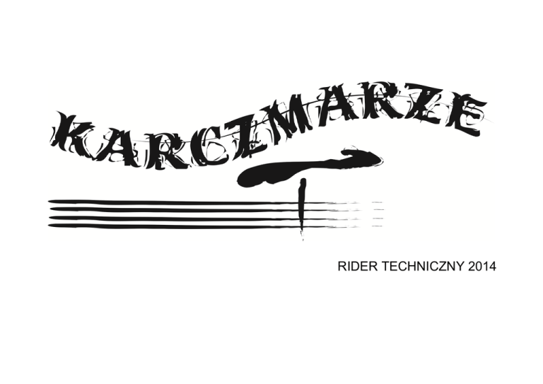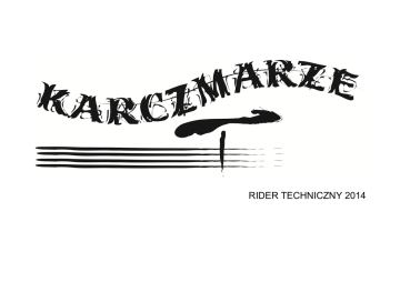 RIDER TECHNICZNY 2014 Stage Plan Input List SOURCE MIC 1 Vocal Violin SM58, Beta58 2 Vocal Accordion SM58, Beta58 3 Vocal Dulcimer/Guitar SM58, Beta58 4 Vocal Contrabass SM58, Beta58 5 Violin ATM350 6 Accordion XLR-wireless 7 Guitar M3, AT2020 8 Dulcimer M3, AT2020 9 Contrabass XLR 1. System nagłośnieniowy powinien być przygotowany przed przyjazdem zespołu i równomiernie pokrywać dźwiękiem cały obszar do nagłośnienia. 2. Konsoleta frontowa renomowanej marki (analogowa lub cyfrowa) np. Allen&Heath, Soundcraft, Yamaha, Midas, DiGiCo. 3. 4 tory monitorowe typu wedge (podłogowe) dwudrożne. 4. Zespół posiada własny system bezprzewodowy do akordeonu – używana częstotliwość 650,100 MHz. 5. Zasilanie dla nagłośnienia musi być niezależne i odrębne od zasilania oświetlenia estradowego, gastronomii i innych tego typu odbiorców. Napięcie energetyczne (230V) powinno być stabilne tzn. nie spadać przy pełnym obciążeniu podczas koncertu. Nie spełnienie tego warunku może uniemożliwić występ zespołu. Zaleca się zasilanie z niezależnego źródła (agregat prądotwórczy). 6. Przed każdą imprezą proszę o kontakt telefoniczny z informacjami na temat systemu nagłośnieniowego oraz ekipy obsługującej koncert. 7. Dopuszcza się możliwość dokonania drobnych zmian po wcześniejszym ich skonsultowaniu i zaakceptowaniu. Tomasz Pisaniak - 0048508109717 http://www.karczmarze.pl/