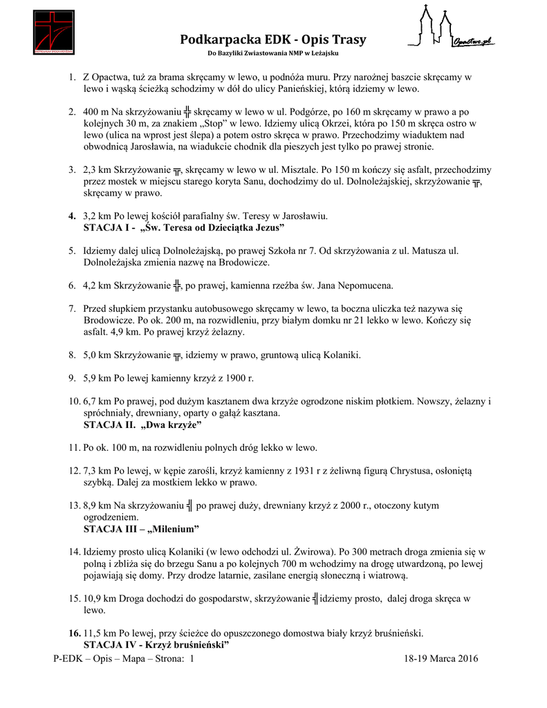 Podkarpacka EDK - Opis Trasy Do Bazyliki Zwiastowania NMP w Leżajsku 1. Z Opactwa, tuż za brama skręcamy w lewo, u podnóża muru. Przy narożnej baszcie skręcamy w lewo i wąską ścieżką schodzimy w dół do ulicy Panieńskiej, którą idziemy w lewo. 2. 400 m Na skrzyżowaniu ╬ skręcamy w lewo w ul. Podgórze, po 160 m skręcamy w prawo a po kolejnych 30 m, za znakiem „Stop” w lewo. Idziemy ulicą Okrzei, która po 150 m skręca ostro w lewo (ulica na wprost jest ślepa) a potem ostro skręca w prawo. Przechodzimy wiaduktem nad obwodnicą Jarosławia, na wiadukcie chodnik dla pieszych jest tylko po prawej stronie. 3. 2,3 km Skrzyżowanie ╦, skręcamy w lewo w ul. Misztale. Po 150 m kończy się asfalt, przechodzimy przez mostek w miejscu starego koryta Sanu, dochodzimy do ul. Dolnoleżajskiej, skrzyżowanie ╦, skręcamy w prawo. 4. 3,2 km Po lewej kościół parafialny św. Teresy w Jarosławiu. STACJA I - „Św. Teresa od Dzieciątka Jezus” 5. Idziemy dalej ulicą Dolnoleżajską, po prawej Szkoła nr 7. Od skrzyżowania z ul. Matusza ul. Dolnoleżajska zmienia nazwę na Brodowicze. 6. 4,2 km Skrzyżowanie ╬, po prawej, kamienna rzeźba św. Jana Nepomucena. 7. Przed słupkiem przystanku autobusowego skręcamy w lewo, ta boczna uliczka też nazywa się Brodowicze. Po ok. 200 m, na rozwidleniu, przy białym domku nr 21 lekko w lewo. Kończy się asfalt. 4,9 km. Po prawej krzyż żelazny. 8. 5,0 km Skrzyżowanie ╦, idziemy w prawo, gruntową ulicą Kolaniki. 9. 5,9 km Po lewej kamienny krzyż z 1900 r. 10. 6,7 km Po prawej, pod dużym kasztanem dwa krzyże ogrodzone niskim płotkiem. Nowszy, żelazny i spróchniały, drewniany, oparty o gałąź kasztana. STACJA II. „Dwa krzyże” 11. Po ok. 100 m, na rozwidleniu polnych dróg lekko w lewo. 12. 7,3 km Po lewej, w kępie zarośli, krzyż kamienny z 1931 r z żeliwną figurą Chrystusa, osłoniętą szybką. Dalej za mostkiem lekko w prawo. 13. 8,9 km Na skrzyżowaniu ╣ po prawej duży, drewniany krzyż z 2000 r., otoczony kutym ogrodzeniem. STACJA III – „Milenium” 14. Idziemy prosto ulicą Kolaniki (w lewo odchodzi ul. Żwirowa). Po 300 metrach droga zmienia się w polną i zbliża się do brzegu Sanu a po kolejnych 700 m wchodzimy na drogę utwardzoną, po lewej pojawiają się domy. Przy drodze latarnie, zasilane energią słoneczną i wiatrową. 15. 10,9 km Droga dochodzi do gospodarstw, skrzyżowanie ╣idziemy prosto, dalej droga skręca w lewo. 16. 11,5 km Po lewej, przy ścieżce do opuszczonego domostwa biały krzyż bruśnieński. STACJA IV - Krzyż bruśnieński” P-EDK – Opis – Mapa – Strona: 1 18-19 Marca 2016 Podkarpacka EDK - Opis Trasy Do Bazyliki Zwiastowania NMP w Leżajsku 17. 12,0 km Skrzyżowanie ╦, po lewej duży krzyż ze stalowych kształtowników, skręcamy w prawo, idziemy do wsi Kostków. 18. 13,8 km STACJA VII. Kościół Dobrego Pasterza w Kostkowie. Idziemy dalej prosto. STACJA V – „Dobrego Pasterza” 19. 15,3 km, Tablica z nazwą wsi Leżachów Osada. Tutaj wchodzimy na teren powiatu przeworskiego. 20. 18,2 km Skrzyżowanie ╦, skręcamy w lewo [droga w prawo po 300 m kończy się ślepo w korycie Sanu]. Przechodzimy przez dwa mostki. Domy po prawej należą do wsi Gorzyce. 21. 18,6 km Skrzyżowanie ╦, skręcamy w prawo, w ulice Sanową [prosto ul. ks. Józefa Świerczka prowadzi do centrum Gorzyc]. Po ok. 1 km po prawej, bardzo blisko drogi koryto Sanu. Potem przerwa w zabudowaniach a po kilometrze pierwsze domy wsi Ubieszyn. 22. 19,3 km Kapliczka nadrzewna po prawej, naprzeciw, po lewej stronie drogi studnia ogrodzona płotkiem. STACJA VI – „Kapliczka na drzewie” 23. 21,6 km - Po dłuższej przerwie w zabudowie dom po lewej. Na terenie posesji kapliczka MB na wysokim postumencie, nakryta bardzo wysokim, strzelistym dachem z blachy. STACJA VII – „Matka Boska Strzelista” 24. 22,0 km Skrzyżowanie ╦, dochodzimy do drogi 835 Sieniawa – Przeworsk. Skręcamy w prawo 25. 22,2 km - Po lewej szkoła podstawowa w Ubieszynie, tuż przy niej kapliczka domkowa MB. STACJA VIII „Matka Boża ucząca” 26. 22,3 km po 100 m od szkoły i kapliczki, przy drogowskazie Tryńcza 2 km – skręcamy w lewo. 27. 23,6 km Wchodzimy na teren miejscowości Tryńcza. 28. 24,3 km Przy skrzyżowaniu, po prawej duża kapliczka ku czci Najśw. Serca Jezusa. z 1914 r. Na bokach postumentu płaskorzeźby św. Rozalii i św. Mateusza, Ewangelisty. STACJA IX – „Święci przy Sercu” 29. Na skrzyżowaniu skręcamy w lewo, idziemy ulicą kard. S. Wyszyńskiego do centrum Tryńczy [ul. Grunwaldzka w prawo kończy się ślepo we wsi Głogowiec, położonej w widłach Sanu i Wisłoka]. 30. 24,7,0 km Skrzyżowanie ╦, jesteśmy w Tryńczy, skręcamy w prawo. Po 300 m most na Wisłoku. Przechodzimy przez most chodnikiem dla pieszych 31. 25,4 km Ok. 300 m za mostem droga główna skręca ostro w prawo. Przed tym zakrętem schodzimy w lewo, w dół na wąską, utwardzona drogę lokalną. 32. 25,8 km Skrzyżowanie ╠ , idziemy prosto odtąd dróżka jest asfaltowa. 33. 26,1 km Skrzyżowanie ╦, dochodzimy do drogi Tryńcza – Chodaczów. Skręcamy w prawo a po 100 m, za ostatnim zabudowaniem po lewej skręcamy w lewo. Idziemy drogą gruntową obok samotnego gospodarstwa po prawej. Na ostatnich 200 m drogi asfalt. P-EDK – Opis – Mapa – Strona: 2 18-19 Marca 2016 Podkarpacka EDK - Opis Trasy Do Bazyliki Zwiastowania NMP w Leżajsku 34. 27,8 km Skrzyżowanie, na którym schodzi się 5 dróg. Dochodzimy to do drogi Tryńcza – Grodzisko Dolne. Skręcamy w lewo, w drugą z kolei, szeroką drogę z chodnikiem prawej stronie jezdni. Po prawej kapliczka na wysokiej, kamiennej podstawie. W małej wnęce figura MB. W zwieńczeniu krzyż z figurą Chrystusa. 35. 28,2 km Przejazd kolejowy na linii Przeworsk – Rozwadów, po prawej przystanek kolejowy (nazywa się Grodzisko Dolne). Tuż za torami, po prawej stary kościół we wsi Chałupki Dębniańskie. 36. 28,4 km Po lewej now