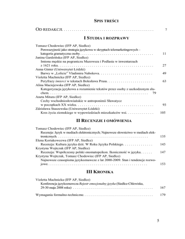 SPIS TREŚCI OD REDAKCJI. . . . . . . . . . . . . . . . . . . . . . . . . . . . . . . . . . . . . . . . . . . . . . 7 I STUDIA I ROZPRAWY Tomasz Chodowiec (IFP AP, Siedlce) Perswazyjność jako strategia językowa w skryptach telemarketingowych – kategoria gramatyczna osoby. . . . . . . . . . . . . . . . . . . . . . . . . . . . . . . . . . . . . Janina Gardzińska (IFP AP, Siedlce) Imiona męskie na pograniczu Mazowsza i Podlasia w inwentarzach z 1621 roku. . . . . . . . . . . . . . . . . . . . . . . . . . . . . . . . . . . . . . . . . . . . . . . . Anna Ginter (Uniwersytet Łódzki) Barwy w „Lolicie” Vladimira Nabokova. . . . . . . . . . . . . . . . . . . . . . . . . . . Violetta Machnicka (IFP AP, Siedlce) Peryfrazy śmierci w tekstach Bolesława Prusa. . . . . . . . . . . . . . . . . . . . . . . Alina Maciejewska (IFP AP, Siedlce) Kategoryzacja językowa a rozumienie tekstów przez osoby z uszkodzonym słuchem. . . . . . . . . . . . . . . . . . . . . . . . . . . . . . . . . . . . . . . . . . . . . . . . . . 79 Aneta Mitura (IFP AP, Siedlce) Cechy wschodniosłowiańskie w antroponimii Sławatycz w początkach XX wieku. . . . . . . . . . . . . . . . . . . . . . . . . . . . . . . . . . . . . . . Zdzisława Staszewska (Uniwersytet Łódzki) Kres życia ziemskiego w wypowiedziach mieszkańców wsi. . . . . . . . . . . . . . 11 27 49 63 93 105 II RECENZJE I OMÓWIENIA Tomasz Chodowiec (IFP AP, Siedlce) Recenzja: Język w mediach elektronicznych; Najnowsze słownictwo w mediach elektronicznych. . . . . . . . . . . . . . . . . . . . . . . . . . . . . . . . . . . . . . . . . . . . . . Elena Koriakowcewa (IFP AP, Siedlce) Recenzja: Kultura języka dziś. W Roku Języka Polskiego. . . . . . . . . . . . . . . Krystyna Wojtczuk (IFP AP, Siedlce) Recenzja: Współczesny polski onomatopeikon. Ikoniczność w języku. . . . . . Krystyna Wojtczuk, Tomasz Chodowiec (IFP AP, Siedlce) Najnowsze czasopisma językoznawcze z lat 2000-2009. Stan i tendencje rozwojowe. . . . . . . . . . . . . . . . . . . . . . . . . . . . . . . . . . . . . . . . . . . . . . . . . . 135 143 147 153 III KRONIKA Violetta Machnicka (IFP AP, Siedlce) Konferencja językoznawcza Rejestr emocjonalny języka (Siedlce-Chlewiska, 29-30 maja 2008 roku) . . . . . . . . . . . . . . . . . . . . . . . . . . . . . . . . . . . . . . . . 167 Wymagania formalno-techniczne. . . . . . . . . . . . . . . . . . . . . . . . . . . . . . . . . . . 179 5 TABLE OF CONTENTS EDITORS’ PREFACE. . . . . . . . . . . . . . . . . . . . . . . . . . . . . . . . . . . . . . . . 7 I STUDIES AND DISSERTATIONS Tomasz Chodowiec (IFP AP, Siedlce) Persuasion as language strategy in telemarketing category grammatical person. . . . . . . . . . . . . . . . . . . . . . . . . . . . . . . . . . . 11 Janina Gardzińska (IFP AP, Siedlce) Men’s names in the bordeland between Mazovia and Podlasie region in the inventories from 1621. . . . . . . . . . . . . . . . . . . . . . . . . . . . . . . . . . . . . . . . . 27 Anna Ginter (Uniwersytet Łódzki) Colours in Lolita by Vladimir Nabokov. . . . . . . . . . . . . . . . . . . . . . . . . . 49 Violetta Machnicka (IFP AP, Siedlce) Periphrastic Structures Connected with Death in Texts by Bolesław Prus . . . . . . . . . . . . . . . . . . . . . . . . . . . . . . . . . . . . . . . . . . . . . 67 Alina Maciejewska (IFP AP, Siedlce) Language categorization and text comprehension 79 by people with damaged hearing . . . . . . . . . . . . . . . . . . . . . . . . . . . . . . . . Aneta Mitura (IFP AP, Siedlce) The features of Eastern-slavonic antrophonymy of Sławatycze in the 93 early XX century . . . . . . . . . . . . . . . . . . . . . . . . . . . . . . . . . . . . . . . . . . . Zdzisława Staszewska (Uniwersytet Łódzki) The end of the earthly life in country dwellers expressions. . . . . . . . . . . . . . 105 II REVIEWS AND COMMENTS Tomasz Chodowiec (IFP AP, Siedlce) Review:Language in electronic media; Newest vocabulary in electronic media . . . . . . . . . . . . . . . . . . . . . . . . . . . . . . . . . . . . . . . . . . . Elena Koriakowcewa (IFP AP, Siedlce) Review: Culture of language in Year of Polish today . . . . . . . . . . . . . . . . . . Krystyna Wojtczuk (IFP AP, Siedlce) Review: Modern polish onomatopeikon. . . . . . . . . . . . . . . . . . . . . . . . . . . . Krystyna Wojtczuk, Tomasz Chodowiec (IFP AP, Siedlce) Newest linguistic magazines from year 2000 to 2009 – condition and development trends. . . . . . . . . . . . . . . . . . . . . . . . . . . . . . . . . . . . . . . . . . . 135 143 147 153 III CHRONICLES Violetta Machnicka (IFP AP, Siedlce) A linguistic conference Register of emotive language (Siedlce-Chlewiska, 29-30 may 2008 year. . . . . . . . . . . . . . . . . . . . . . . . . . . . . . . . . . . . . . . . . . 167 Publishing claims. . . . . . . . . . . . . . . . . . . . . . . . . . . . . . . . . . . . . . . . . . . . . 179 6