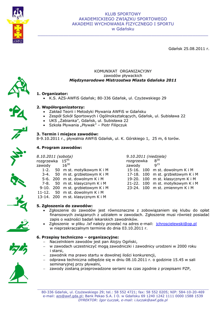 KLUB SPORTOWY AKADEMICKIEGO ZWIĄZKU SPORTOWEGO AKADEMII WYCHOWANIA FIZYCZNEGO I SPORTU w Gdańsku __________________________________________________________________ Gdańsk 25.08.2011 r. KOMUNIKAT ORGANIZACYJNY zawodów pływackich Międzynarodowe Mistrzostwa Miasta Gdańska 2011 1. Organizator: K.S. AZS-AWFiS Gdańsk; 80-336 Gdańsk, ul. Czyżewskiego 29 2. Współorganizatorzy: Zakład Teorii i Metodyki Pływania AWFiS w Gdańsku Zespół Szkół Sportowych i Ogólnokształcących, Gdańsk, ul. Subisława 22 UKS „Żabianka”, Gdańsk, ul. Subisława 22 Szkoła Pływania „Pływak” – Piotr Filipczuk 3. Termin i miejsce zawodów: 8-9.10.2011 r., pływalnia AWFiS Gdańsk, ul. K. Górskiego 1, 25 m, 6 torów. 4. Program zawodów: 8.10.2011 (sobota) rozgrzewka 1545 zawody 1630 1-2. 50 m st. 3-4. 50 m st. 5-6. 200 m st. 7-8. 50 m st. 9-10. 200 m st. 11-12. 50 m st. 13-14. 200 m st. motylkowym K i M grzbietowym K i M dowolnym K i M klasycznym K i M grzbietowym K i M dowolnym K i M klasycznym K i M 9.10.2011 (niedziela) rozgrzewka 830 zawody 915 15-16. 100 m st. dowolnym K i M 17-18. 100 m st. grzbietowym K i M 19-20. 100 m st. klasycznym K i M 21-22. 100 m st. motylkowym K i M 23-24. 100 m st. zmiennym K i M 5. Zgłoszenia do zawodów: Zgłoszenie do zawodów jest równoznaczne z zobowiązaniem się klubu do opłat finansowych związanych z udziałem w zawodach. Zgłoszenie musi również posiadać zapis o ważności badań lekarskich zawodników. Zgłoszenie w pliku .lxf należy przesłać na adres e-mail: [email protected] w nieprzekraczalnym terminie do dnia 03.10.2011 r. 6. Przepisy techniczno – organizacyjne: Naczelnikiem zawodów jest pan Alojzy Ogiński, w zawodach uczestniczyć mogą zawodniczki i zawodnicy urodzeni w 2000 roku i starsi, zawodnik ma prawo startu w dowolnej ilości konkurencji, odprawa techniczna odbędzie się w dniu 08.10.2011 r. o godzinie 15.45 w sali seminaryjnej przy pływalni, zawody zostaną przeprowadzone seriami na czas zgodnie z przepisami PZP, _________________________________________________________________________________ 80-336 Gdańsk, ul. Czyżewskiego 29; tel.: 58 552 4721; fax: 58 552 0205; NIP: 584-10-20-469 e-mail: [email protected]; Bank Pekao S.A. I O. w Gdańsku 69 1240 1242 1111 0000 1588 1539 DYREKTOR: Igor Łuczak, e-mail: [email protected] KLUB SPORTOWY AKADEMICKIEGO ZWIĄZKU SPORTOWEGO AKADEMII WYCHOWANIA FIZYCZNEGO I SPORTU w Gdańsku __________________________________________________________________ w zawodach nagrodzonych zostanie w kategorii OPEN 3 najlepszych zawodników i 3 najlepsze zawodniczki za 2 najwartościowsze wyniki wg tabel wielobojowych, oraz po jednym zawodniku i zawodniczce w kategoriach wiekowych: 95-96, 97-98, 99-00, oraz nagrody dla najlepszej zawodniczki i zawodnika zagranicznego, Puchar Alicji Pęczak dla najlepszej zawodniczki w stylu klasycznym (suma punktów wielobojowych za 50, 100 i 200 m), Opłata startowa wynosi 20 PLN od zgłoszonego zawodnika, opłata za zgłoszenie klubu wynosi 30 PLN – płatne u organizatora przed rozpoczęciem zawodów, Ze względu na warunki organizacyjne możemy przyjąć ograniczoną liczę zawodników – decydować będzie kolejność zgłoszeń, w sprawach nieobjętych komunikatem decyduje sędzia główny w porozumieniu z naczelnikiem zawodów. Za organizatorów Igor Łuczak (tel. 694.668.247) _________________________________________________________________________________ 80-336 Gdańsk, ul. Czyżewskiego 29; tel.: 58 552 4721; fax: 58 552 0205; NIP: 584-10-20-469 e-mail: [email protected]; Bank Pekao S.A. I O. w Gdańsku 69 1240 1242 1111 0000 1588 1539 DYREKTOR: Igor Łuczak, e-mail: [email protected]