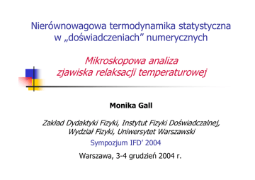 Nierównowagowa termodynamika statystyczna w „doświadczeniach” numerycznych Mikroskopowa analiza zjawiska relaksacji temperaturowej Monika Gall Zakład Dydaktyki Fizyki, Instytut Fizyki Doświadczalnej, Wydział Fizyki, Uniwersytet Warszawski Sympozjum IFD’ 2004 Warszawa, 3-4 grudzień 2004 r. Bibliografia R. Kutner: Susceptibility and transport coefficients in a transient state on a one-dimensional lattice I. Extended linear response and diffusion, Physica A, 224 (1996) 558-588. A. Galant, R. Kutner, A. Majerowski: Heat Transfer, Newton’s Law of Cooling and the Law of Entropy Increase Simulated by the Real-Time Computer Experiment in Java, Lecture Noties in Computer Science 2657 (2003) 45-53. M. Gall, R. Kutner, M. Maciejczyk, A. Majerowski, Cykl wieloodcinkowy pt.: Entropia niejedno ma imię, FwSz: 5 (2003) 23-30; 1 (2004) 15-19; 4 (2004) 86-91; 5 (2004) 17-21. A. Galant, M. Gall, R. Kutner, Prawo wzrostu entropii , w Fizyka i astronomia 3, Nowa Era, w druku (2004/2005). M. Gall, R. Kutner: Molecular mechanisms of heat transfer: Debye relaxation versus power-law, wysłane do druku (Physica A). J. Hurkała, M. Gall, R. Kutner, M. Maciejczyk: Real-Time Numerical Simulation of the Carnot Engine within the Java Applet, Lecture Noties in Computer Science, wysłane do druku. Temperaturowa relaksacja układów termodynamicznych: modele mikroskopowe Przewodnictwo cieplne to jeden z najpowszechniej występujących nieodwracalnych procesów termodynamicznych Relaksacja temperatur: debye’owska (wykładnicza) spowolniona (potęgowa) Analizujemy ten proces na poziomie: dydaktycznym (np. wizualizacja w czasie rzeczywistym) badawczym (np. modele mikroskopowe) Zasadniczy cel Poszukujemy mikroskopowego modelu, w oparciu o „doświadczenie” numeryczne, odpowiedzialnego za relaksację temperatur: wykładniczą potęgową Badamy rolę chaosu molekularnego w relaksacji temperaturowej. „Doświadczenie” numeryczne (symulacja komputerowa) Założenia modelu Gaz doskonały (bardzo rozrzedzony) Atomy gazu oddziałują ze sobą tylko poprzez przegrodę diatermiczną Obowiązuje zasada ekwipartycji energii atomów oddziałujących z przegrodą diatermiczną Rozpatrujemy dwa rodzaje ścianek: Pomiar funkcji relaksacji T (t ) = T∞ + (T − T∞ ) f (t ), J J 0 J = L, P ∆T (t ) f (t ) = ∆T (0) Funkcja relaksacji to zależna od czasu względna różnica temperatur Za pomocą funkcji relaksacji wyznaczamy nie tylko relaksację temperatur, ale np. zależne od czasu entropie (cząstkowe i całkowitą) Porównanie wyników doświadczalnych i teoretycznych Wniosek z „doświadczenia” numerycznego dla t>t* Dla ścianek chropowatych funkcja relaksacji ⎛ t ⎞ f (t ) ~ exp⎜⎜ − ⎟⎟ ⎝ τ0 ⎠ czas relaksacji τ 0 = 142 ± 1[δt ], t* = 270,0 ± 1,5[δt ] Za pomocą tego modelu mikroskopowego możemy odtworzyć prawo ostygania ciał Newtona. Wniosek z „doświadczenia” numerycznego dla t>t* Dla ścianek zwierciadlanych funkcja relaksacji ⎛t⎞ f (t ) = ⎜ ⎟ ⎝τ ' ⎠ −d τ ' = 50 ± 0,5[δt ] , d = 1,0 ± 0,01 t* = 270,0 ± 1,5[δt ] Uwaga dotycząca modelu Uogólniliśmy teorię przewodnictwa cieplnego Fouriera-Onsagera tak, aby uwzględnić oba typy relaksacji. Było to możliwe dzięki wprowadzeniu zależnego od czasu współczynnika przewodnictwa cieplnego. Uwaga: W przypadku relaksacji wykładniczej współczynnik przewodnictwa cieplnego jest stały. W przypadku relaksacji potęgowej jest zależny od czasu. Wniosek ogólny Zaproponowaliśmy model pozwalający badać własności tradycyjnej i egzotycznej termodynamiki statystycznej na poziomie dydaktycznym i profesjonalnym. Przedstawione podejście może być elementem wspomagającym tzw. zdalne nauczanie (distance learning).