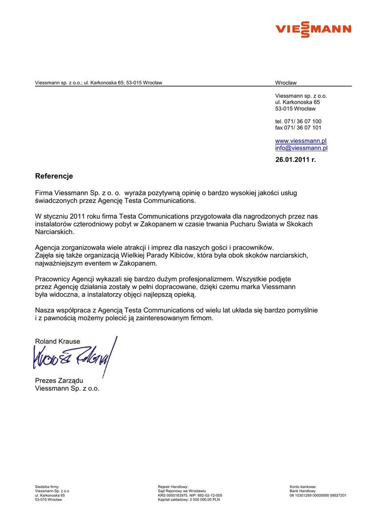 Viessmann sp. z o.o.; ul. Karkonoska 65; 53-015 Wrocław Wrocław Viessmann sp. z o.o. ul. Karkonoska 65 53-015 Wrocław tel. 071/ 36 07 100 fax 071/ 36 07 101 www.viessmann.pl [email protected] 26.01.2011 r. Referencje Firma Viessmann Sp. z o. o. wyraża pozytywną opinię o bardzo wysokiej jakości usług świadczonych przez Agencję Testa Communications. W styczniu 2011 roku firma Testa Communications przygotowała dla nagrodzonych przez nas instalatorów czterodniowy pobyt w Zakopanem w czasie trwania Pucharu Świata w Skokach Narciarskich. Agencja zorganizowała wiele atrakcji i imprez dla naszych gości i pracowników. Zajęła się także organizacją Wielkiej Parady Kibiców, która była obok skoków narciarskich, najważniejszym eventem w Zakopanem. Pracownicy Agencji wykazali się bardzo dużym profesjonalizmem. Wszystkie podjęte przez Agencję działania zostały w pełni dopracowane, dzięki czemu marka Viessmann była widoczna, a instalatorzy objęci najlepszą opieką. Nasza współpraca z Agencją Testa Communications od wielu lat układa się bardzo pomyślnie i z pawnością możemy polecić ją zainteresowanym firmom. Roland Krause Prezes Zarządu Viessmann Sp. z o.o. Siedziba firmy: Viessmann Sp. z o.o ul. Karkonoska 65 53-015 Wrocław Rejestr Handlowy: Sąd Rejonowy we Wrocławiu KRS 0000183975, NIP: 692-02-12-005 Kapitał zakładowy: 2 000 000,00 PLN Konto bankowe: Bank Handlowy 08 10301289 00000000 58527201
