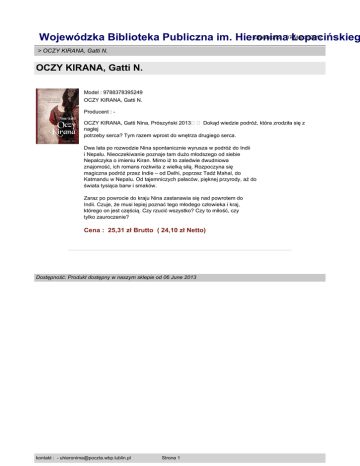Utworzono : 07Łopacińskieg March 2017 Wojewódzka Biblioteka Publiczna im. Hieronima > OCZY KIRANA, Gatti N. OCZY KIRANA, Gatti N. Model : 9788378395249 OCZY KIRANA, Gatti N. Producent : OCZY KIRANA, Gatti Nina, Prószyński 2013�� Dokąd wiedzie podróż, która zrodziła się z nagłej potrzeby serca? Tym razem wprost do wnętrza drugiego serca. Dwa lata po rozwodzie Nina spontanicznie wyrusza w podróż do Indii i Nepalu. Nieoczekiwanie poznaje tam dużo młodszego od siebie Nepalczyka o imieniu Kiran. Mimo iż to zaledwie dwudniowa znajomość, ich romans rozkwita z wielką siłą. Rozpoczyna się magiczna podróż przez Indie – od Delhi, poprzez Tadź Mahal, do Katmandu w Nepalu. Od tajemniczych pałaców, pięknej przyrody, aż do świata tysiąca barw i smaków. Zaraz po powrocie do kraju Nina zastanawia się nad powrotem do Indii. Czuje, że musi lepiej poznać tego młodego człowieka i kraj, którego on jest częścią. Czy rzucić wszystko? Czy to miłość, czy tylko zauroczenie? Cena : 25,31 zł Brutto ( 24,10 zł Netto) Dostępność: Produkt dostępny w naszym sklepie od 06 June 2013 kontakt : - [email protected] Strona 1
