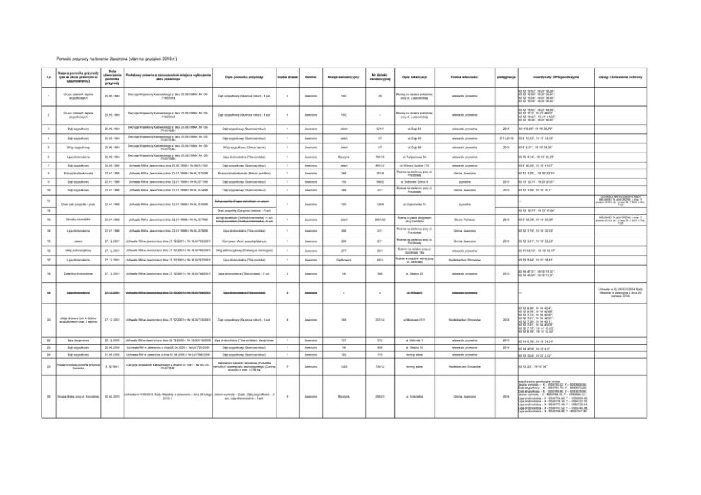Pomniki przyrody na terenie Jaworzna (stan na grudzień 2016 r.) l.p Nazwa pomnika przyrody (jak w akcie prawnym o ustanowieniu) Data utworzenia pomnika przyrody Podstawy prawne z oznaczeniem miejsca ogłoszenia aktu prawnego Opis pomnika przyrody liczba drzew Gmina Obręb ewidencyjny Nr działki ewidencyjnej Opis lokalizacji Forma własności 1 Grupa czterech dębów szypułkowych 25.09.1984 Decyzja Wojewody Katowickiego z dnia 25.09.1984 r. Nr OŚ7140/8/84 Dąb szypułkowy (Quercus robur) - 4 szt. 4 Jaworzno 16C 25 Rosną na działce położonej przy ul. Luszowickiej własność prywatna 50 12' 12,53”, 19 21' 35,28”; 50 12' 12,59”, 19 21' 35,91”; 50 12' 13,08”, 19 21' 36,49”; 50 12' 13,06”, 19 21' 36,62” 2 Grupa czterech dębów szypułkowych 25.09.1984 Decyzja Wojewody Katowickiego z dnia 25.09.1984 r. Nr OŚ7140/9/84 Dąb szypułkowy (Quercus robur) - 4 szt. 4 Jaworzno 16C - Rosną na działce położonej przy ul. Luszowickiej własność prywatna 50 12' 18,93”, 19 21' 43,69”; 50 12' 17,3”, 19 21' 44,02”; 50 12' 18,42”, 19 21' 41,02”; 50 12' 19,36”, 19 21' 40,87” 3 Dąb szypułkowy 25.09.1984 Decyzja Wojewody Katowickiego z dnia 25.09.1984 r. Nr OŚ7140/10/84 Dąb szypułkowy (Quercus robur) 1 Jaworzno Jeleń 521/1 ul. Dąb 64 własność prywatna 2015 50 8' 6,63”, 19 15' 35,79” 4 Dąb szypułkowy 25.09.1984 Decyzja Wojewody Katowickiego z dnia 25.09.1984 r. Nr OŚ7140/11/84 Dąb szypułkowy (Quercus robur) 1 Jaworzno Jeleń 67 ul. Dąb 99 własność prywatna 2015,2016 50 8' 10,53”, 19 15' 34,39” 5 Wiąz szypułkowy 25.09.1984 Decyzja Wojewody Katowickiego z dnia 25.09.1984 r. Nr OŚ7140/12/84 Wiąz szypułkowy (Ulmus laevis) 1 Jaworzno Jeleń 67 ul. Dąb 99 własność prywatna 2015 50 8' 9,97”, 19 15' 34,05” 6 Lipa drobnolistna 25.09.1984 Decyzja Wojewody Katowickiego z dnia 25.09.1984 r. Nr OŚ7140/13/84 Lipa drobnolistna (Tilia cordata) 1 Jaworzno Byczyna 1841/8 ul. Tulipanowa 5A własność prywatna 50 10' 4,14”, 19 18' 28,29” 7 Dąb szypułkowy 25.05.1995 Uchwała RM w Jaworznie z dnia 25.05.1995 r. Nr XII/121/95 Dąb szypułkowy (Quercus robur) 1 Jaworzno Jeleń 4501/2 ul. Wiosny Ludów 178 własność prywatna 50 9' 30,26”, 19 16' 41,07” 8 Brzoza brodawkowata 22.01.1998 Uchwała RM w Jaworznie z dnia 22.01.1998 r. Nr XL/570/98 Brzoza brodawkowata (Betula pendula) 1 Jaworzno 266 281/9 Rośnie na zieleńcu przy ul. Pocztowej Gmina Jaworzno 9 Dąb szypułkowy 22.01.1998 Uchwała RM w Jaworznie z dnia 22.01.1998 r. Nr XL/571/98 Dąb szypułkowy (Quercus robur) 1 Jaworzno 10c 566/2 ul. Bobrowa Górka 6 prywatne 2015 50 13' 12,74”, 19 20' 21,01” 10 Dąb szypułkowy 22.01.1998 Uchwała RM w Jaworznie z dnia 22.01.1998 r. Nr XL/574/98 Dąb szypułkowy (Quercus robur) 1 Jaworzno 266 211 Rośnie na zieleńcu przy ul. Pocztowej Gmina Jaworzno 2015 50 12' 1,09”, 19 16' 30,7” 1 Jaworzno 120 126/4 ul. Dąbrowska 7a prywatne Jarząb szwedzki (Sorbus intermedia) -1 szt. Jarząb szwedzki (Sorbus intermedia) -1 szt. 1 Jaworzno Jeleń 3901/42 Rosną w pasie drogowym ulicy Celników Skarb Państwa 11 pielęgnacja koordynaty GPS/geodezyjne 50 12' 1,95”, 19 16' 33,18” Buk pospolity (Fagus sylvatica) - 2 sztuki --- Dwa buki pospolite i grab 22.01.1998 Uchwała RM w Jaworznie z dnia 22.01.1998 r. Nr XL/576/98 13 Jarząby szwedzkie 22.01.1998 Uchwała RM w Jaworznie z dnia 22.01.1998 r. Nr XL/577/98 14 Lipa drobnolistna 22.01.1998 Uchwała RM w Jaworznie z dnia 22.01.1998 r. Nr XL/578/98 Lipa drobnolistna (Tilia cordata) 1 Jaworzno 266 211 Rośnie na zieleńcu przy ul. Pocztowej Gmina Jaworzno 15 Jawor 27.12.2001 Uchwała RM w Jaworznie z dnia 27.12.2001 r. Nr XLIII/765/2001 Klon jawor (Acer pseudoplatanus) 1 Jaworzno 266 211 Rośnie na zieleńcu przy ul. Pocztowej Gmina Jaworzno 16 Głóg jednoszyjkowy 27.12.2001 Uchwała RM w Jaworznie z dnia 27.12.2001 r. Nr XLIII/766/2001 Głóg jednoszyjkowy (Crataegus monogyna) 1 Jaworzno 277 25/1 Rośnie na działce przy ul. Sportowej 16a własność prywatna 17 Lipa drobnolistna 27.12.2001 Uchwała RM w Jaworznie z dnia 27.12.2001 r. Nr XLIII/767/2001 Lipa drobnolistna (Tilia cordata) 1 Jaworzno Ciężkowice 65/3 Rośnie w osadzie leśnej przy ul. Jodłowej Nadleśnictwo Chrzanów 18 Dwie lipy drobnolistne 27.12.2001 Uchwała RM w Jaworznie z dnia 27.12.2001 r. Nr XLIII/768/2001 Lipa drobnolistna (Tilia cordata) - 2 szt. 2 Jaworzno 54 398 ul. Skalna 25 własność prywatna 19 Lipa drobnolistna 27.12.2001 Uchwała RM w Jaworznie z dnia 27.12.2001 r. Nr XLIII/769/2001 Lipa drobnolistna (Tilia cordata) 0 Jaworzno - - ul. Wilcza 1 własność prywatna 20 Aleja drzew w tym 6 dębów szypułkowych oraz 2 jesiony 27.12.2001 Uchwała RM w Jaworznie z dnia 27.12.2001 r. Nr XLIII/770/2001 Dąb szypułkowy (Quercus robur) - 6 szt. 6 Jaworzno 165 301/14 ul Moniuszki 101 Nadleśnictwo Chrzanów 2016 50 12' 8,59”, 19 14' 42,4”; 50 12' 8,59”, 19 14' 42,68”; 50 12' 7,73”, 19 14' 42,97”; 50 12' 7,61”, 19 14' 42,91”; 50 12' 7,38”, 19 14' 43,1”; 50 12' 7,81”, 19 14' 43,08”; 50 12' 7,15”, 19 14' 43,03”; 50 12' 6,79”, 19 14' 42,82” 22 Lipa dwupniowa 22.12.2005 Uchwała RM w Jaworznie z dnia 22.12.2005 r. Nr XLIX/616/2005 Lipa drobnolistna (Tilia cordata) - dwupniowa 1 Jaworzno 107 312 ul. Ustronie 3 własność prywatna 2015 50 14' 6,76”, 19 15' 34,34” 23 Dąb szypułkowy 26.06.2006 Uchwała RM w Jaworznie z dnia 26.06.2006 r. Nr LV/720/2006 Dąb szypułkowy (Quercus robur) 1 Jaworzno 54 408 ul. Skalna 10 własność prywatna 2016 24 Dąb szypułkowy 31.08.2006 Uchwała RM w Jaworznie z dnia 31.08.2006 r. Nr LVI/768/2006 Dąb szypułkowy (Quercus robur) 1 Jaworzno 12c 118 tereny leśne własność prywatna 25 Powierzchniowy pomnik przyrody Sasanka 9.12.1981 Decyzja Wojewody Katowickiego z dnia 9.12.1981 r. Nr RL-VII7140/35/81 stanowisko sasanki wiosennej (Pulsatilla vernalis) i dziewięćsiła bezłodygowego (Carlina acaulis) o pow. 13,56 ha 0 Jaworzno 1023 130/12 tereny leśne Na