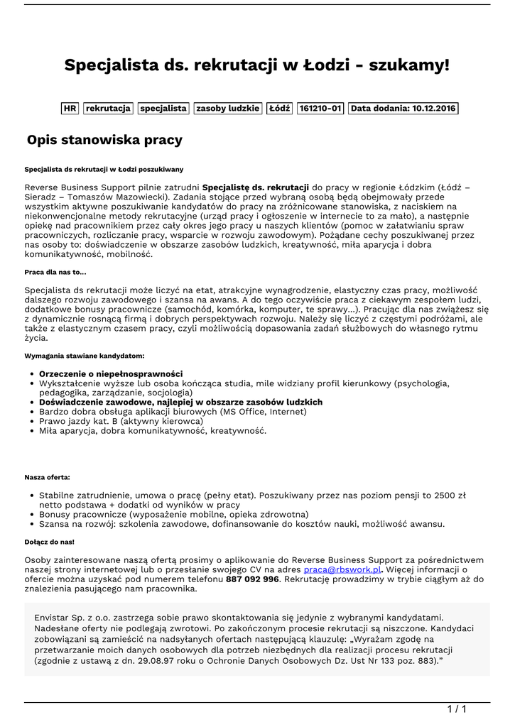 Specjalista ds. rekrutacji w Łodzi - szukamy! HR rekrutacja specjalista zasoby ludzkie Łódź 161210-01 Data dodania: 10.12.2016 Opis stanowiska pracy Specjalista ds rekrutacji w Łodzi poszukiwany Reverse Business Support pilnie zatrudni Specjalistę ds. rekrutacji do pracy w regionie Łódzkim (Łódź – Sieradz – Tomaszów Mazowiecki). Zadania stojące przed wybraną osobą będą obejmowały przede wszystkim aktywne poszukiwanie kandydatów do pracy na zróżnicowane stanowiska, z naciskiem na niekonwencjonalne metody rekrutacyjne (urząd pracy i ogłoszenie w internecie to za mało), a następnie opiekę nad pracownikiem przez cały okres jego pracy u naszych klientów (pomoc w załatwianiu spraw pracowniczych, rozliczanie pracy, wsparcie w rozwoju zawodowym). Pożądane cechy poszukiwanej przez nas osoby to: doświadczenie w obszarze zasobów ludzkich, kreatywność, miła aparycja i dobra komunikatywność, mobilność. Praca dla nas to… Specjalista ds rekrutacji może liczyć na etat, atrakcyjne wynagrodzenie, elastyczny czas pracy, możliwość dalszego rozwoju zawodowego i szansa na awans. A do tego oczywiście praca z ciekawym zespołem ludzi, dodatkowe bonusy pracownicze (samochód, komórka, komputer, te sprawy…). Pracując dla nas zwiążesz się z dynamicznie rosnącą firmą i dobrych perspektywach rozwoju. Należy się liczyć z częstymi podróżami, ale także z elastycznym czasem pracy, czyli możliwością dopasowania zadań służbowych do własnego rytmu życia. Wymagania stawiane kandydatom: Orzeczenie o niepełnosprawności Wykształcenie wyższe lub osoba kończąca studia, mile widziany profil kierunkowy (psychologia, pedagogika, zarządzanie, socjologia) Doświadczenie zawodowe, najlepiej w obszarze zasobów ludzkich Bardzo dobra obsługa aplikacji biurowych (MS Office, Internet) Prawo jazdy kat. B (aktywny kierowca) Miła aparycja, dobra komunikatywność, kreatywność. Nasza oferta: Stabilne zatrudnienie, umowa o pracę (pełny etat). Poszukiwany przez nas poziom pensji to 2500 zł netto podstawa + dodatki od wyników w pracy Bonusy pracownicze (wyposażenie mobilne, opieka zdrowotna) Szansa na rozwój: szkolenia zawodowe, dofinansowanie do kosztów nauki, możliwość awansu. Dołącz do nas! Osoby zainteresowane naszą ofertą prosimy o aplikowanie do Reverse Business Support za pośrednictwem naszej strony internetowej lub o przesłanie swojego CV na adres [email protected]. Więcej informacji o ofercie można uzyskać pod numerem telefonu 887 092 996. Rekrutację prowadzimy w trybie ciągłym aż do znalezienia pasującego nam pracownika. Envistar Sp. z o.o. zastrzega sobie prawo skontaktowania się jedynie z wybranymi kandydatami. Nadesłane oferty nie podlegają zwrotowi. Po zakończonym procesie rekrutacji są niszczone. Kandydaci zobowiązani są zamieścić na nadsyłanych ofertach następującą klauzulę: „Wyrażam zgodę na przetwarzanie moich danych osobowych dla potrzeb niezbędnych dla realizacji procesu rekrutacji (zgodnie z ustawą z dn. 29.08.97 roku o Ochronie Danych Osobowych Dz. Ust Nr 133 poz. 883).” 1/1 Powered by TCPDF (www.tcpdf.org)