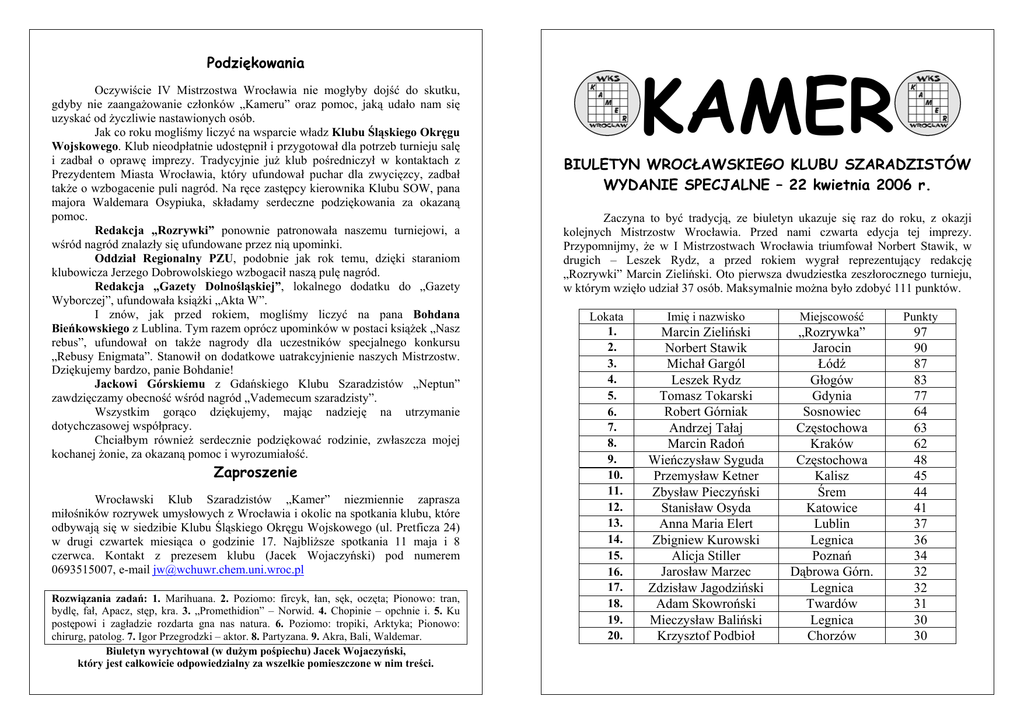 KAMER Podziękowania Oczywiście IV Mistrzostwa Wrocławia nie mogłyby dojść do skutku, gdyby nie zaangażowanie członków „Kameru” oraz pomoc, jaką udało nam się uzyskać od życzliwie nastawionych osób. Jak co roku mogliśmy liczyć na wsparcie władz Klubu Śląskiego Okręgu Wojskowego. Klub nieodpłatnie udostępnił i przygotował dla potrzeb turnieju salę i zadbał o oprawę imprezy. Tradycyjnie już klub pośredniczył w kontaktach z Prezydentem Miasta Wrocławia, który ufundował puchar dla zwycięzcy, zadbał także o wzbogacenie puli nagród. Na ręce zastępcy kierownika Klubu SOW, pana majora Waldemara Osypiuka, składamy serdeczne podziękowania za okazaną pomoc. Redakcja „Rozrywki” ponownie patronowała naszemu turniejowi, a wśród nagród znalazły się ufundowane przez nią upominki. Oddział Regionalny PZU, podobnie jak rok temu, dzięki staraniom klubowicza Jerzego Dobrowolskiego wzbogacił naszą pulę nagród. Redakcja „Gazety Dolnośląskiej”, lokalnego dodatku do „Gazety Wyborczej”, ufundowała książki „Akta W”. I znów, jak przed rokiem, mogliśmy liczyć na pana Bohdana Bieńkowskiego z Lublina. Tym razem oprócz upominków w postaci książek „Nasz rebus”, ufundował on także nagrody dla uczestników specjalnego konkursu „Rebusy Enigmata”. Stanowił on dodatkowe uatrakcyjnienie naszych Mistrzostw. Dziękujemy bardzo, panie Bohdanie! Jackowi Górskiemu z Gdańskiego Klubu Szaradzistów „Neptun” zawdzięczamy obecność wśród nagród „Vademecum szaradzisty”. Wszystkim gorąco dziękujemy, mając nadzieję na utrzymanie dotychczasowej współpracy. Chciałbym również serdecznie podziękować rodzinie, zwłaszcza mojej kochanej żonie, za okazaną pomoc i wyrozumiałość. Zaproszenie Wrocławski Klub Szaradzistów „Kamer” niezmiennie zaprasza miłośników rozrywek umysłowych z Wrocławia i okolic na spotkania klubu, które odbywają się w siedzibie Klubu Śląskiego Okręgu Wojskowego (ul. Pretficza 24) w drugi czwartek miesiąca o godzinie 17. Najbliższe spotkania 11 maja i 8 czerwca. Kontakt z prezesem klubu (Jacek Wojaczyński) pod numerem 0693515007, e-mail [email protected] Rozwiązania zadań: 1. Marihuana. 2. Poziomo: fircyk, łan, sęk, oczęta; Pionowo: tran, bydlę, fał, Apacz, stęp, kra. 3. „Promethidion” – Norwid. 4. Chopinie – opchnie i. 5. Ku postępowi i zagładzie rozdarta gna nas natura. 6. Poziomo: tropiki, Arktyka; Pionowo: chirurg, patolog. 7. Igor Przegrodzki – aktor. 8. Partyzana. 9. Akra, Bali, Waldemar. Biuletyn wyrychtował (w dużym pośpiechu) Jacek Wojaczyński, który jest całkowicie odpowiedzialny za wszelkie pomieszczone w nim treści. BIULETYN WROCŁAWSKIEGO KLUBU SZARADZISTÓW WYDANIE SPECJALNE – 22 kwietnia 2006 r. Zaczyna to być tradycją, ze biuletyn ukazuje się raz do roku, z okazji kolejnych Mistrzostw Wrocławia. Przed nami czwarta edycja tej imprezy. Przypomnijmy, że w I Mistrzostwach Wrocławia triumfował Norbert Stawik, w drugich – Leszek Rydz, a przed rokiem wygrał reprezentujący redakcję „Rozrywki” Marcin Zieliński. Oto pierwsza dwudziestka zeszłorocznego turnieju, w którym wzięło udział 37 osób. Maksymalnie można było zdobyć 111 punktów. Lokata 1. 2. 3. 4. 5. 6. 7. 8. 9. 10. 11. 12. 13. 14. 15. 16. 17. 18. 19. 20. Imię i nazwisko Miejscowość Punkty Marcin Zieliński Norbert Stawik Michał Gargól Leszek Rydz Tomasz Tokarski Robert Górniak Andrzej Tałaj Marcin Radoń Wieńczysław Syguda Przemysław Ketner Zbysław Pieczyński Stanisław Osyda Anna Maria Elert Zbigniew Kurowski Alicja Stiller Jarosław Marzec Zdzisław Jagodziński Adam Skowroński Mieczysław Baliński Krzysztof Podbioł „Rozrywka” Jarocin Łódź Głogów Gdynia Sosnowiec Częstochowa Kraków Częstochowa Kalisz Śrem Katowice Lublin Legnica Poznań Dąbrowa Górn. Legnica Twardów Legnica Chorzów 97 90 87 83 77 64 63 62 48 45 44 41 37 36 34 32 32 31 30 30 Klub „Kamer” w sezonie 2005 Członkowie naszego klubu są ludźmi szalenie zajętymi. Sprawy rodzinne i zawodowe absorbują nas do tego stopnia, że z trudem udaje się znaleźć jeszcze trochę czasu na szaradziarstwo. To, że udało nam się mimo tych trudności i wobec – nie da się ukryć – szczupłości zasobów ludzkich zorganizować III Mistrzostwa Wrocławia, możemy sobie poczytywać za pewnego rodzaju osiągnięcie. W innych imprezach braliśmy już udział jedynie jako uczestnicy. Tym razem w rankingu Pucharu Neptuna za rok 2005 można odnaleźć nazwiska dwóch członków „Kamera”. Mariusz Góralski wystartował w czterech turniejach: zajął trzecie miejsce w Mistrzostwach Żar, piąte w XXXI Turnieju Kompozycji Krzyżówki (rozegranym w nieodległym Głogowie), siódme zaś w Mistrzostwach Głogowa. Jego największym jednak osiągnięciem było spektakularne zwycięstwo w toruńskim Gigancie. Po raz pierwszy w ośmioletniej historii tej imprezy zdarzyło się, że triumfator ukończył ją z kompletem punktów, a więc odgadł bezbłędnie 861 słów wpisywanych do diagramu Gigantycznej (Gigantowej) krzyżówki. W klasyfikacji Pucharu Neptuna Mariusz zajął 13 pozycję, gromadząc 240 punktów. Drugim z Kamerowiczów, odnotowanym w tym rankingu, jest Ryszard Kotomski ze Strzelina. Tym razem jego zdobycz punktowa to 14 oczek zdobytych w Żarach, co dało miejsce 99-101 w końcowej klasyfikacji. Tomkowi Tokarskiemu z Gdyni zawdzięczamy coroczny ranking autorów zadań szaradziarskich, który można odnaleźć na stronie internetowej Gdańskiego Klubu Szaradzistów „Neptun” (www.neptun-gdansk.w.interia.plT). Tym razem podstawą zestawienia była łączna liczba zadań opublikowanych w periodykach Spółdzielni „Rozrywka” oraz wydawnictwach „Technopolu” w roku 2005 (nie uwzględniono przy tym wydawnictw poświęconych prawie wyłącznie krzyżówkom panoramicznym). W pierwszej setce tej klasyfikacji znaleźli się trzej członkowie „Kamera”: Antoni Maz