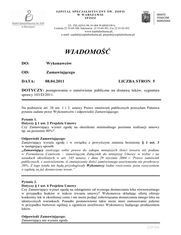 S ZP I TA L SP E CJ A L IS TY C ZN Y ŚW . ZO F I I W WA RS ZA W I E SP ZO Z UL. śELAZNA 90, 01-004 WARSZAWA, Centrala 22 53-69-300, Sekretariat 22 53-69-301, Fax 22 83-82-452 www.szpitalzelazna.pl, e-mail: [email protected], [email protected] WIADOMOŚĆ DO: Wykonawców OD: Zamawiającego DATA: 08.04.2011 LICZBA STRON: 5 DOTYCZY: postępowania o zamówienie publiczne na dostawę leków, sygnatura sprawy 103/D/2011. Na podstawie art. 38 ust. 1 i 2. ustawy Prawo zamówień publicznych przesyłam Państwu pytania zadane przez Wykonawców i odpowiedzi Zamawiającego: Pytanie 1. Dotyczy § 1 ust. 2 Projektu Umowy Czy Zamawiający wyrazi zgodę na określenie minimalnego poziomu realizacji umowy np. na poziomie 80%? Odpowiedź Zamawiającego: Zamawiający wyraŜa zgodę i w związku z powyŜszym zmienia brzmienie § 1 ust. 3 w następujący sposób: „Zamawiający zastrzega sobie prawo do zakupu mniejszych ilości towaru niŜ podane w Formularzu Cenowym – stanowiącym Załącznik do niniejszej Umowy w trybie i na zasadach określonych w art. 145 ustawy z dnia 29 stycznia 2004 r. Prawo zamówień publicznych, z zastrzeŜeniem, iŜ zmniejszenie ilości zamówionego asortymentu nie przekroczy 20%. Z tego tytułu nie będą przysługiwały Wykonawcy Ŝadne roszczenia, poza roszczeniem o zapłatę za juŜ dostarczony towar.” Pytanie 2. Dotyczy § 1 ust. 6 Projektu Umowy Czy Zamawiający wyrazi zgodę na odstąpienie od wymogu dostarczania leku równowaŜnego w przypadku braków w trakcie trwania umowy? Wykonawca składając ofertę oferuje konkretny lek w określonej cenie i nie moŜe podjąć zobowiązania dostarczania innego leku na identycznych warunkach. Ponadto postanowienie takie moŜe mieć zastosowanie jedynie w przypadku hurtowni ogólnej a ogranicza moŜliwości Wykonawcy będącego producentem leków. Odpowiedź Zamawiającego: Zamawiający nie wyraŜa zgody. ZZP/MS Pytanie 3. Dotyczy § 2 ust. 4 lit. b) Projektu Umowy Czy Zamawiający potwierdza, Ŝe w przypadku zmiany stawki podatku VAT zmianie ulegnie cena brutto, uwzględniająca nową stawkę – cena netto pozostanie niezmieniona? Odpowiedź Zamawiającego: Zamawiający udziela negatywnej odpowiedzi. Dopuszczenie moŜliwości zmiany ceny w przypadku zmiany stawek podatku VAT nie wyklucza moŜliwości negocjacji ceny netto. Zamawiający wydatkuje środki publiczne, w związku z czym ma obowiązek kierować się zasadą racjonalności, zgodnie z którą wydatkowanie środków powinno następować w sposób oszczędny. Pytanie 4. Dotyczy § 4 ust. 1 Projektu Umowy Czy Zamawiający wyrazi zgodę na wprowadzenie obowiązku potwierdzania faxem zamówień składanych telefonicznie? Dostarczenie towaru niezgodnie z zamówieniem pociąga za sobą negatywne konsekwencje dla wykonawcy. Obowiązek potwierdzania zamówień faxem pozwoli uniknąć sporów na tym tle. Odpowiedź Zamawiającego: Zamawiający nie wyraŜa zgody. Pytanie 5. Dotyczy § 4 ust. 1 Projektu Umowy Czy Zamawiający wyrazi zgodę na wydłuŜenie podstawowego terminu dostawy do 2 dni? Odpowiedź Zamawiającego: Zamawiający nie wyraŜa zgody. Pytanie 6. Dotyczy § 4 ust. 1 Projektu Umowy Czy Zamawiający wyrazi zgodę na wydłuŜenie terminu dostawy „w razie natychmiastowej potrzeby” do 24 godzin? Wykonawca mający siedzibę w innej miejscowości niŜ Zamawiający nie moŜe podjąć się dostarczania takiego zamówienia w przeciągu 2-3 godzin. Takie postanowienie ogranicza moŜliwość dochowania terminów jedynie do lokalnych dostawców co raŜąco narusza art. 7 ust. 1 ustawy prawo zamówień publicznych. Odpowiedź Zamawiającego: Zamawiający nie wyraŜa zgody. Ideą dostawy i podania leku „w razie natychmiastowej potrzeby” jest właśnie podanie go w jak najkrótszym czasie. Zamawiający ma obowiązek dbać o zdrowie i bezpieczeństwo swoich pacjentów, w tym równieŜ w sytuacjach nagłych i nieprzewidzianych zapewnić im wszelkie konieczne środki lecznicze, zwłaszcza takie, które słuŜą ratowaniu Ŝycia. Pytanie 7. Dotyczy § 6 ust. 3 Projektu Umowy Czy Zamawiający wyrazi zgodę na wydłuŜenie terminu do załatwienia reklamacji ilościowej do 3 dni? ZZP/MS Odpowiedź Zamawiającego: Zamawiający nie wyraŜa zgody. Pytanie 8. Dotyczy § 10 ust. 1 Projektu Umowy Czy Zamawiający wyrazi zgodę na usunięcie tego postanowienia, ewentualnie na uzupełnienie o następujące sformułowanie: „przy czym Zamawiający nie moŜe odmówić zgody na cesję wierzytelności bez uzasadnionej przyczyny”? Zwracamy uwagę, Ŝe dokonując dostawy i odraczając termin płatności wykonawca w pewnym zakresie kredytuje Zamawiającego. W przypadku nie zrealizowania przez Zamawiającego jego zobowiązań w zakresie zapłaty Wykonawca powinien mieć prawo do odzyskania naleŜnego mu wynagrodzenia m.in. przez przeniesienie wierzytelności na osobę trzecią. Wskazane postanowienie ogranicza w praktyce prawa Wykonawcy do dochodzenia swoich naleŜności wyłącznie na drodze sądowej. Odpowiedź Zamawiającego: Zamawiający uznaje, iŜ dotychczasowy zapis dla obu stron umowy jest równie korzystny, umoŜliwia osiągnięcie porozumienia bez angaŜowania osób trzecich i sądu. Zamawiający nie widzi uzasadnienia dla wyłączenia zakazu dokonywania przelewu wierzytelności przysługujących Wykonawcy wobec Zamawiającego na rzecz podmiotów trzecich. W razie nieziszczenia naleŜności przez Zamawiającego wykonawcy przysługuje prawo dochodzenia ich na drodze sądowej, co niewątpliwie zabezpiecza w sposób wystarczający jego interesy. Wykonawcy w razie opóźnienia się przez Zamawiającego z zapłatą naleŜności przysługują takŜe, na podstawie art. 481 § 1 Kodeksu cywilnego w zw. z art. 139 ust. 1 Ustawy – Prawo zamówień publicznych, odsetki ustawowe. Natomiast uzaleŜnienie moŜliwości dokonania cesji wierzytelności od wyraŜenia zgody przez dłuŜnika (tu: Zamawiającego) dopuszczalne jest z mocy art. 509 §1 Kodeksu cywilnego w zw. z art. 139 ust. 1 Ustawy