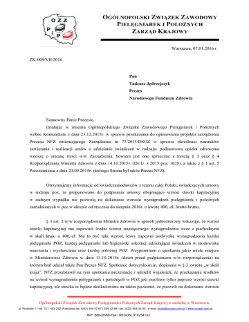 OGÓLNOPOLSKI ZWIĄZEK ZAWODOWY PIELĘGNIAREK I POŁOŻNYCH ZARZĄD KRAJOWY Warszawa, 07.01.2016 r. ZK-009/VII/2016 Pan Tadeusz Jędrzejczyk Prezes Narodowego Funduszu Zdrowia Szanowny Panie Prezesie, działając w imieniu Ogólnopolskiego Związku Zawodowego Pielęgniarek i Położnych wobec Komunikatu z dnia 23.12.2015r. w sprawie przekazania do opiniowania projektu zarządzenia Prezesa NFZ zmieniającego Zarządzenie nr 77/2015/DSOZ w sprawie określenia warunków zawierania i realizacji umów o udzielanie świadczeń w rodzaju: podstawowa opieka zdrowotna wnoszę o zmianę treści w/w Zarządzenia, bowiem jest ono sprzeczne z treścią § 3 oraz § 4 Rozporządzenia Ministra Zdrowia z dnia 14.10.2015r. (Dz.U. z 2015 poz. 1628), a także z § 1 ust. 5 Porozumienia z dnia 23.09.2015r. (którego Stroną był także Prezes NFZ). Otrzymujemy informacje od świadczeniodawców z terenu całej Polski, świadczących umowy w rodzaju poz, że proponowane do podpisania umowy obejmujące wzrost stawki kapitacyjnej w żadnym wypadku nie pozwolą na dokonanie wzrostu wynagrodzeń pielęgniarek i położnych zatrudnionych w poz w okresie od stycznia do sierpnia 2016r. o kwotę 400,-zł. brutto brutto. § 3 ust. 2 w/w rozporządzenia Ministra Zdrowia w sposób jednoznaczny wskazuje, że wzrost stawki kapitacyjnej ma zapewnić średni wzrost miesięcznego wynagrodzenia wraz z pochodnymi w skali kraju o 400,-zł. Ma to być taki wzrost, który zapewni podwyżkę wynagrodzenia każdej pielęgniarki POZ, każdej pielęgniarki lub higienistki szkolnej udzielającej świadczeń w środowisku nauczania i wychowania oraz każdej położnej POZ. Przypominam o spotkaniu jakie miało miejsce w Ministerstwie Zdrowia w dniu 13.10.2015r. (dzień przed podpisaniem w/w rozporządzenia) na którym brał udział także Pan Prezes NFZ. Spotkanie dotyczyło m.in. dopisania w § 3 zwrotu „w skali kraju”. NFZ przedstawił na tym spotkaniu prezentację i udzielił wyjaśnień, że przekazanie środków na wzrost wynagrodzenia pielęgniarek i położnych w POZ jest możliwe tylko poprzez wzrost stawki kapitacyjnej, ale stawka ta będzie skalkulowana na takim poziomie, że pozwoli na dokonanie wzrostu Ogólnopolski Związek Zawodowy Pielęgniarek i Położnych Zarząd Krajowy z siedzibą w Warszawie ul. Podwale 11 lok. 311 | 00–252 Warszawa tel. (022) 504 42 67 | 504 42 69 | fax. (022) 504 42 54 | e-mail: [email protected] | www.ozzpip.com.pl NIP: 888-20-68-724 | REGON: 910234133 przeciętnie po 400,-zł. miesięcznie brutto brutto nie tylko pielęgniarkom i położnym POZ do których zapisani są pacjenci, ale wszystkim pielęgniarkom i położnym POZ. W informacji przekazano nam jedynie, że na potrzeby zwrotu „w skali kraju” została obliczona tzw. uśredniona liczba statystyczna pacjentów np. dla pielęgniarki POZ miała to być liczba 1.730 pacjentów i w takim wypadku stawka kapitacyjna miała wzrosnąć o kwotę co najmniej 400,-zł. Z propozycji Zarządzenia Prezesa NFZ (§ 11 ust. 2 pkt. 1 lit a/) wynika natomiast, że stawka wzrasta tylko o kwotę 0,19zł. co daje łącznie kwotę 328,70zł. w przypadku uśrednionej liczby pacjentów. Analogiczne uwagi dotyczą położnej POZ i pielęgniarki lub higienistki szkolnej. Jest to niezgodne z treścią Rozporządzenia MZ, z treścią porozumienia z dnia 23-09-2015r. oraz z treścią dodatkowych negocjacji i ustaleń w dniu 13-10-2015r. Oczekujemy pilnej zmiany (podwyższenia) zaproponowanych wzrostów stawki kapitacyjnej. Dodatkowo oczekujemy rozwiązania podwyżki wynagrodzeń w zakresie kontraktowania świadczeń w ramach opieki nocnej i świątecznej. W ramach tych rodzajów świadczeń pielęgniarki i położne wykonują pracę u świadczeniodawców posiadających zawarty kontrakt z NFZ i dla których jest to jedyne miejsce świadczenia pracy. W naszej ocenie opieka nocna i świąteczna jest oddzielnym rodzajem kontraktowania świadczeń (nie jest rozliczana stawką kapitacyjną, tylko stawką ryczałtową) i w konsekwencji powinna być objęta wzrostem wynagrodzeń od 01.09.2015r. Wnosimy o pilne spotkanie w Ministerstwie Zdrowia celem udzielenia wyjaśnień o przyczynach tak dużych rozbieżności pomiędzy treścią wydanego przez Prezesa NFZ Zarządzenia wykonawczego do Rozporządzenia Ministra Zdrowia. Jednocześnie proszę Pana Ministra o możliwie pilne zorganizowanie takiego spotkania. Z poważaniem Do wiadomości: 1. Dr Konstanty Radziwiłł – Minister Zdrowia 2. Dr Grażyna Rogala-Pawelczyk – Prezes Naczelnej Rady Pielęgniarek i Położnych Ogólnopolski Związek Zawodowy Pielęgniarek i Położnych Zarząd Krajowy z siedzibą w Warszawie ul. Podwale 11 lok. 311 | 00–252 Warszawa tel. (022) 504 42 67 | 504 42 69 | fax. (022) 504 42 54 | e-mail: [email protected] | www.ozzpip.com.pl NIP: 888-20-68-724 | REGON: 910234133