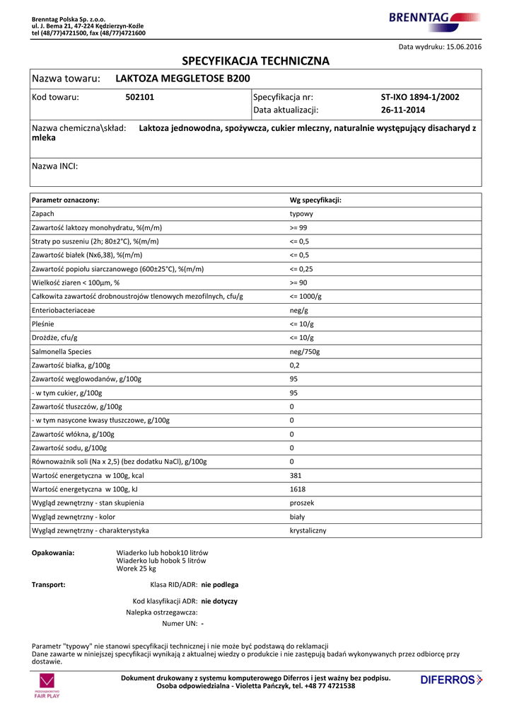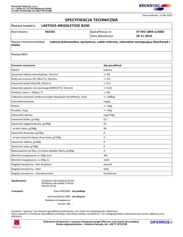 Brenntag Polska Sp. z.o.o. ul. J. Bema 21, 47-224 Kędzierzyn-Koźle tel (48/77)4721500, fax (48/77)4721600 Data wydruku: 15.06.2016 SPECYFIKACJA TECHNICZNA Nazwa towaru: LAKTOZA MEGGLETOSE B200 Kod towaru: 502101 Nazwa chemiczna\skład: mleka Specyfikacja nr: Data aktualizacji: ST-IXO 1894-1/2002 26-11-2014 Laktoza jednowodna, spożywcza, cukier mleczny, naturalnie występujący disacharyd z Nazwa INCI: Parametr oznaczony: Wg specyfikacji: Zapach typowy Zawartość laktozy monohydratu, %(m/m) >= 99 Straty po suszeniu (2h; 80±2°C), %(m/m) <= 0,5 Zawartość białek (Nx6,38), %(m/m) <= 0,5 Zawartość popiołu siarczanowego (600±25°C), %(m/m) <= 0,25 Wielkość ziaren < 100µm, % >= 90 Całkowita zawartość drobnoustrojów tlenowych mezofilnych, cfu/g <= 1000/g Enteriobacteriaceae neg/g Pleśnie <= 10/g Drożdże, cfu/g <= 10/g Salmonella Species neg/750g Zawartość białka, g/100g 0,2 Zawartość węglowodanów, g/100g 95 - w tym cukier, g/100g 95 Zawartość tłuszczów, g/100g 0 - w tym nasycone kwasy tłuszczowe, g/100g 0 Zawartość włókna, g/100g 0 Zawartość sodu, g/100g 0 Równoważnik soli (Na x 2,5) (bez dodatku NaCl), g/100g 0 Wartość energetyczna w 100g, kcal 381 Wartość energetyczna w 100g, kJ 1618 Wygląd zewnętrzny - stan skupienia proszek Wygląd zewnętrzny - kolor biały Wygląd zewnętrzny - charakterystyka krystaliczny Opakowania: Transport: Wiaderko lub hobok10 litrów Wiaderko lub hobok 5 litrów Worek 25 kg Klasa RID/ADR: nie podlega Kod klasyfikacji ADR: nie dotyczy Nalepka ostrzegawcza: Numer UN: - Parametr "typowy" nie stanowi specyfikacji technicznej i nie może być podstawą do reklamacji Dane zawarte w niniejszej specyfikacji wynikają z aktualnej wiedzy o produkcie i nie zastępują badań wykonywanych przez odbiorcę przy dostawie. Dokument drukowany z systemu komputerowego Diferros i jest ważny bez podpisu. Osoba odpowiedzialna - Violetta Pańczyk, tel. +48 77 4721538 Brenntag Polska Sp. z.o.o. ul. J. Bema 21, 47-224 Kędzierzyn-Koźle tel (48/77)4721500, fax (48/77)4721600 Przechowywanie: Składować w magazynie środków - dodatków do żywności, w oryginalnych opakowaniach, w suchym pomieszczeniu, w temperaturze pokojowej. Przechowywać z dala od substancji o intensywnym zapachu. Unikać wzniecania pyłu i kurzu. Zachować należytą staranność i ostrożność. Okres ważności: 1095 dni Uwagi: Produkt firmy Meggle. Parametr "typowy" nie stanowi specyfikacji technicznej i nie może być podstawą do reklamacji Dane zawarte w niniejszej specyfikacji wynikają z aktualnej wiedzy o produkcie i nie zastępują badań wykonywanych przez odbiorcę przy dostawie. Dokument drukowany z systemu komputerowego Diferros i jest ważny bez podpisu. Osoba odpowiedzialna - Violetta Pańczyk, tel. +48 77 4721538
