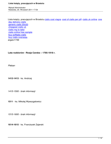 Lista księży, pracujączch w Brześciu Wpisał Administrator Niedziela, 25. Wrzesień 2011 17:54 Lista księży, pracujączch w Brześciu cialis cost viagra cost of cialis per pill cialis uk online one day delivery cialis generic cialis 20x20 cheapest cialis uk cialis mg to take cialis online free sample buy softtabs cialis buy cialis overseas argaiv1749 Lata rozbiorów - Rosja Carska – 1795-1918 r. Pleban 1412-1413 - ks. Andrzej 1415-1500 - brak informacji 1511 - ks. Mikołaj Wyeszgalowicz 1515-1600 - brak informacji 1614-1615 - ks. Franciszek Zajerski 1 / 16 Lista księży, pracujączch w Brześciu Wpisał Administrator Niedziela, 25. Wrzesień 2011 17:54 1615-1623 - jako wikarzy proboszcza OO. Jezuici 1610-1680 - brak informacji 1683-1684 - ks. Pachocki 1690 - ks. Franciszek Kowalewski 1695-1720 - brak informacji 1725-1766 - ks. Piotr Szpannenberg 1775-1778 - o. Jan Benisławski (ex SJ) Rektor Szkoły 1780 - ks. Ludwik Skłodowski 1785 - ks. Puciłowski 1788-1789 - ks. Wojciech Kossakowski (w) Lata rozbiorów - Rosja Carska – 1795-1918 r. 2 / 16 Lista księży, pracujączch w Brześciu Wpisał Administrator Niedziela, 25. Wrzesień 2011 17:54 Proboszcz i wikary 1795-1820 - ks. Wojciech Kossakowski 1795-1813 - ks. Jakub Masiukiewicz (w) 1804-1810 - ks. Piotr Bobiński (w) 1810-1820 - ks. Franciszek Klimaszewski (w, pref.) 1812-1820 - ks. Kazimierz Sakowicz (w, pref.) 1810-1820 - ks. Grzegorz Zeleszkiewicz (w) 1820-1822 - ks. Karol Blumski 1820 - ks. Wojciech Kossakowski (ex p) 1820-1822 - ks. Jakub Godlewski (w) ok. 1820 - ks. Grzegorz Żeleszkiewicz (w) 3 / 16 Lista księży, pracujączch w Brześciu Wpisał Administrator Niedziela, 25. Wrzesień 2011 17:54 ok. 1820 - ks. Franciszek Klimaszewski (pref.) ok. 1820 - ks. Kazimierz Sakowicz (pref.) ok. 1820 - ks. Jakub Masiulewicz (kap. sióstr) 1822-1836 - ks. Kazimierz Sakowicz 1822-1823 - ks. Jakub Godlewski (w) 1821-1822 - ks. Sylwester Pętkowski (w) 1825-1828 - ks. Jan Malecki (w) 1835-1836 - ks. Piotr Dzierzkowski (pref.) 1835-1836 - ks. Marceli Podgórski (w) 1835-1836 - o. Kalikst Tyszkowski OCD (w) 1842 - ks. Jan Malewski (dziekan) 4 / 16 Lista księży, pracujączch w Brześciu Wpisał Administrator Niedziela, 25. Wrzesień 2011 17:54 1839 - ks. Wincenty Dziemianowicz (pref.) 1855-1869 - ks. Wincenty Dziemianowicz (pref.) 1870-1871 - ks. Justyn Ścipurzycki (p) 1855-1856 - ks. Stanisław Jastrzębski 1855-1856 - ks. Tomasz Szymkowicz (w) 1859-1862 - ks. Walenty Jabłonowski MIC (w) 1855-1856 - ks. Franciszek Sidorowicz (kap. szk.) 1859-1860 - ks. Onufry Czajkowski (w) 1855-1862 - ks. Jakub Godlewski (m) 1859-1862 - ks. Wiktor Snigurski (pref.) 1862-1864 - ks. Jan Niewiarowski MIC (w) 5 / 16 Lista księży, pracujączch w Brześciu Wpisał Administrator Niedziela, 25. Wrzesień 2011 17:54 1855-1860 - ks. Adam Koźmian (kapel. wojsk.) 1866-1869 - ks. Jan Niewiarowski (w) 1866-1867 - ks. Wiktor Śnigurski (pref.) 1866-1869 - ks. Jerzy Żeleszkiewicz (m) 1866-1867 - ks. Sylwester Pentkowski (m) 1871-1875 - ks. Hipolit Głowacki 1866-1872 - o. Jan Niewiarowski (w) 1866-1872 - ks. Grzegorz Żeleszkiewicz (m) 1875-1877 - ks. Konstanty Biernikowicz 1877-1886 - ks. Hipolit Głowacki 1881 - ks. Antoni Razulewicz (w) 6 / 16 Lista księży, pracujączch w Brześciu Wpisał Administrator Niedziela, 25. Wrzesień 2011 17:54 1881-1882 - ks. Bolesław Lipiński (w) 1884-1885x - ks. Jan Sadowski (w) 1886-1892 - ks. Ignacy Miernikowicz 1888-1889 - ks. Jan Sacharko (w) 1889-1890 - ks. Jan Sadowski (w) 1892 - ks. Antoni Songaiło (w) 1892-1893 - ks. Joachim Raczkowski (w) 1884 - ks. Stanisław Maciejewicz (w, pref.) 1897-1898 - ks. Jan Zachowski 1897-1898 - ks. Antoni Saletycki (w) 1898-1906 - ks. Paweł Staniewicz 7 / 16 Lista księży, pracujączch w Brześciu Wpisał Administrator Niedziela, 25. Wrzesień 2011 17:54 1904 - vacat. 1904-1907 - ks. Zenon Zielonko (pref.) 1905-1906 - ks. Stanisław Siwicki (w) 1906-1907 - ks. Ignacy Rosołowski 1906-1907 - ks. Józef Farbotko (w) 1907-1918 - ks. Paweł Staniewicz 1908-1910 - ks. Jan Matulewicz (w) 1909-1910 - ks. Józef Sochoń (w) 1909-1912 - ks. Witold Kuźmicki (w, pref.) 1910-1911 - ks. Adolf Romecki (w) 1911-1917 - ks. Fabian Szczerbicki (w) 8 / 16 Lista księży, pracujączch w Brześciu Wpisał Administrator Niedziela, 25. Wrzesień 2011 17:54 1907-1917 - ks. Zeno Zielonko (pref.) 1912 - ks. Jan Żochowski 1912-1920 - ks. Antoni Rudziuk (w) 1914-1917 - ks. Jakub Zdanowicz (w) 1911-1912 - ks. Julian Jakubowski II Rzeczpospolita Polska – 1918-1939 r. Proboszcz i wikary 1918-1920 - ks. Antoni Songajło 1919-1920x - ks. Ignacy Wierobiej (w) 1918-1919 - ks. Fabian Szczerbicki (pref.) 1919 - ks. Ignacy Rosołowski 9 / 16 Lista księży, pracujączch w Brześciu Wpisał Administrator Niedziela, 25. Wrzesień 2011 17:54 1920-1928 - ks. Nikodem Tarasiewicz x1920-1928 - ks. Ignacy Wierobiej (w) 1919-1931 - ks. Jan Szot 1919-1925x - ks. Fabian Szczerbicki (kat.) 1922-1928 - ks. Jan Kizimierz Borysiuk 1924-1925 - ks. Emilian Pietranik 1926-1928 - ks. Leopold Mackiewicz 1927-1928x - ks. Tomasz Lipecki (w) 1928-1932 - ks. Kazimierz Bukraba 1928-1934 - ks. Tomasz Lipecki (w) 1928-1939 - ks. Jan Borysiuk (pref.) 10 / 16 Lista księży, pracujączch w Brześciu Wpisał Administrator Niedziela, 25. Wrzesień 2011 17:54 1925-1939 - ks. Fabian Szczerbicki (kat.) 1929-1930 - ks. Bolesław Małecki (pref.) 1929-1930 - ks. Jan Urbanowicz (pref.) 1929-1934 - ks. Marek Symonowicz (pref.) 1932-1936 - ks. Stanisław Kopij (w, pref.) ok. 1930 - ks. Jan Wierzbicki 1932 - ks. Czesław Wojtyniak 1928-1929 - ks. Nikodem Tarasiewicz (a) 1930-1933 - ks. Józef Moniuszko (p) 1933-1937 - ks. Witold Iwicki 1933-1934 - ks. Józef Maciejak (w) 1930-1936 - ks. Tadeusz Grzesiak (w) 11 / 16 Lista księży, pracujączch w Brześciu Wpisał Administrator Niedziela, 25. Wrzesień 2011 17:54 1933-1934 - ks. Mieczysław Kubik (w) 1933-1936 - ks. Stanisław Kopij (w) 1935-1936 - ks. Wiesław Piątkowski (pref.) 1935-1936 - ks. And