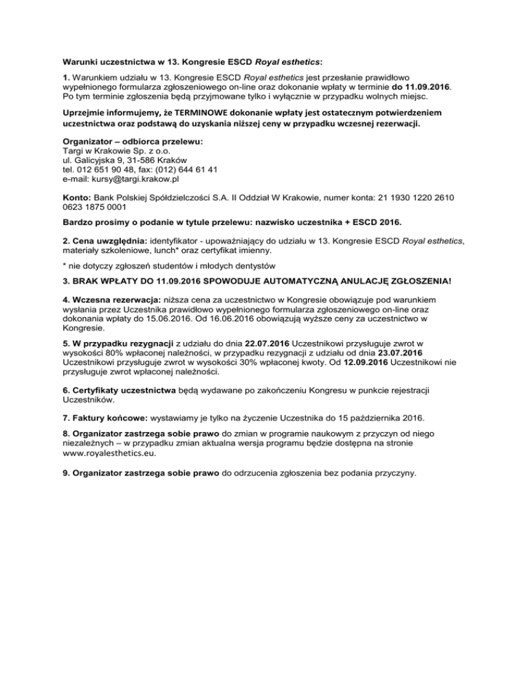 Warunki uczestnictwa w 13. Kongresie ESCD Royal esthetics: 1. Warunkiem udziału w 13. Kongresie ESCD Royal esthetics jest przesłanie prawidłowo wypełnionego formularza zgłoszeniowego on-line oraz dokonanie wpłaty w terminie do 11.09.2016. Po tym terminie zgłoszenia będą przyjmowane tylko i wyłącznie w przypadku wolnych miejsc. Uprzejmie informujemy, że TERMINOWE dokonanie wpłaty jest ostatecznym potwierdzeniem uczestnictwa oraz podstawą do uzyskania niższej ceny w przypadku wczesnej rezerwacji. Organizator – odbiorca przelewu: Targi w Krakowie Sp. z o.o. ul. Galicyjska 9, 31-586 Kraków tel. 012 651 90 48, fax: (012) 644 61 41 e-mail: [email protected] Konto: Bank Polskiej Spółdzielczości S.A. II Oddział W Krakowie, numer konta: 21 1930 1220 2610 0623 1875 0001 Bardzo prosimy o podanie w tytule przelewu: nazwisko uczestnika + ESCD 2016. 2. Cena uwzględnia: identyfikator - upoważniający do udziału w 13. Kongresie ESCD Royal esthetics, materiały szkoleniowe, lunch* oraz certyfikat imienny. * nie dotyczy zgłoszeń studentów i młodych dentystów 3. BRAK WPŁATY DO 11.09.2016 SPOWODUJE AUTOMATYCZNĄ ANULACJĘ ZGŁOSZENIA! 4. Wczesna rezerwacja: niższa cena za uczestnictwo w Kongresie obowiązuje pod warunkiem wysłania przez Uczestnika prawidłowo wypełnionego formularza zgłoszeniowego on-line oraz dokonania wpłaty do 15.06.2016. Od 16.06.2016 obowiązują wyższe ceny za uczestnictwo w Kongresie. 5. W przypadku rezygnacji z udziału do dnia 22.07.2016 Uczestnikowi przysługuje zwrot w wysokości 80% wpłaconej należności, w przypadku rezygnacji z udziału od dnia 23.07.2016 Uczestnikowi przysługuje zwrot w wysokości 30% wpłaconej kwoty. Od 12.09.2016 Uczestnikowi nie przysługuje zwrot wpłaconej należności. 6. Certyfikaty uczestnictwa będą wydawane po zakończeniu Kongresu w punkcie rejestracji Uczestników. 7. Faktury końcowe: wystawiamy je tylko na życzenie Uczestnika do 15 października 2016. 8. Organizator zastrzega sobie prawo do zmian w programie naukowym z przyczyn od niego niezależnych – w przypadku zmian aktualna wersja programu będzie dostępna na stronie www.royalesthetics.eu. 9. Organizator zastrzega sobie prawo do odrzucenia zgłoszenia bez podania przyczyny.