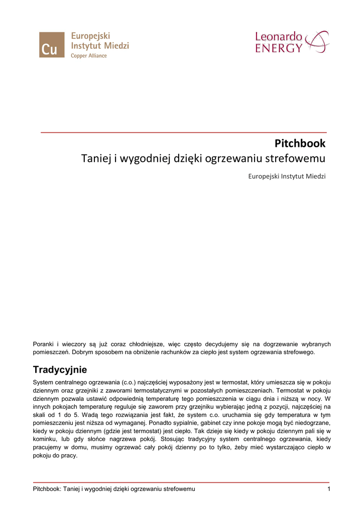 Pitchbook Taniej i wygodniej dzięki ogrzewaniu strefowemu Europejski Instytut Miedzi Poranki i wieczory są już coraz chłodniejsze, więc często decydujemy się na dogrzewanie wybranych pomieszczeń. Dobrym sposobem na obniżenie rachunków za ciepło jest system ogrzewania strefowego. Tradycyjnie System centralnego ogrzewania (c.o.) najczęściej wyposażony jest w termostat, który umieszcza się w pokoju dziennym oraz grzejniki z zaworami termostatycznymi w pozostałych pomieszczeniach. Termostat w pokoju dziennym pozwala ustawić odpowiednią temperaturę tego pomieszczenia w ciągu dnia i niższą w nocy. W innych pokojach temperaturę reguluje się zaworem przy grzejniku wybierając jedną z pozycji, najczęściej na skali od 1 do 5. Wadą tego rozwiązania jest fakt, że system c.o. uruchamia się gdy temperatura w tym pomieszczeniu jest niższa od wymaganej. Ponadto sypialnie, gabinet czy inne pokoje mogą być niedogrzane, kiedy w pokoju dziennym (gdzie jest termostat) jest ciepło. Tak dzieje się kiedy w pokoju dziennym pali się w kominku, lub gdy słońce nagrzewa pokój. Stosując tradycyjny system centralnego ogrzewania, kiedy pracujemy w domu, musimy ogrzewać cały pokój dzienny po to tylko, żeby mieć wystarczająco ciepło w pokoju do pracy. Pitchbook: Taniej i wygodniej dzięki ogrzewaniu strefowemu 1 Strefowo Zaletą ogrzewania strefowego jest to, że każdy pokój ma swój własny obwód grzewczy, sterowany elektronicznym zaworem i zasilany małą pompą. – W takich instalacjach warto postawić na miedź. Rury wykonane z miedzi łatwo się instaluje, są bardzo trwałe, a ponad to estetyczne – mówi Michał Ramczykowski, prezes Europejskiego Instytutu Miedzi. W ogrzewaniu strefowym każdy pokój jest wyposażony we własny czujnik ciepła i przyciski (zwykle na panelu sterującym z wyświetlaczem), które umożliwiają sterowanie temperaturą. Każdy z domowników może ustawić odpowiednią temperaturę w konkretnym pomieszczeniu, niezależnie od tego czy w innych pokojach ogrzewanie jest potrzebne, czy też nie. Osoby pracujące w domu mogą ogrzewać wyłącznie swój gabinet bez konieczności ogrzewania reszty domu. Takie rozwiązanie sprawia, że rachunki za ogrzewanie są dużo niższe. Dodatkowe możliwości System strefowy daje też inne udogodnienia. Szczególnie jeśli połączymy go ze zintegrowanym systemem automatyki domowej, sterującym sprzętem elektrycznym (pozwala on na połączenie w jedną sieć sprzętu elektrycznego, takiego jak oświetlenie, termostaty, alarmy, komputery, telefony, klimatyzacja itd.). Zainstalowanie panelu sterowania z wyświetlaczem w pokoju dziennym pozwala sprawdzać aktualną i oczekiwaną temperaturę pomieszczenia. Centralny panel sterowania umożliwia także zdalne podwyższanie lub obniżanie temperatury w każdym pokoju. Jest to wygodne, jeżeli np. zamierzamy za jakiś czas korzystać z łazienki, gdyż nie musimy wcześniej do niej iść, aby włączyć miejscowe ogrzewanie. System daje również możliwość skoordynowanego sterowania. Po naciśnięciu przycisku "wyłącz wszystko", zgaśnie nie tylko światło, ale także ogrzewanie zostanie ustawione na niższą temperaturę w trybie "nieobecność". Co ciekawe, gdy chcemy wrócić do domu wcześniej niż zwykle, dzięki smartfonowi lub tabletowi można z wyprzedzeniem zdalnie włączyć ogrzewanie w wybranym pomieszczeniu. Pokoje dziecinne Pokoje dziecinne służą nie tylko do spania, ale także, jako pomieszczenia , gdzie dzieci bawią się lub uczą. Dzięki ogrzewaniu strefowemu pokoje te mogą być ogrzewane niezależnie od innych pomieszczeń. W tradycyjnym systemie ogrzewania centralnego z termostatyczną regulacją grzejników, trzeba przejść przez cały dom, żeby ręcznie ustawić każdy grzejnik na odpowiednią temperaturę lub „ogrzewanie nocne” (szczególnie istotne przy małych dzieciach). Inaczej jest w przypadku ogrzewania strefowego, połączonego ze zintegrowanym systemem automatyki, które pozwala za pomocą smartfona obniżyć temperaturę w pokoju dzieci bez konieczności odrywania się od oglądania ulubionego serialu. Rys.1. W każdej strefie ogrzewania temperaturę można ustawiać za a pomocą smartfona, tabela lub ekranu dotykowego na ścianie (Fot. EIM). Pitchbook: Taniej i wygodniej dzięki ogrzewaniu strefowemu 2 Informacje dodatkowe: Europejski Instytut Miedzi (EIM) www.instytutmiedzi.pl działa w ramach światowej organizacji Copper Alliance, której celem jest tworzenie warunków na rynku dla zwiększenia zastosowań produktów z miedzi i jej stopów w wielu dziedzinach gospodarki takich jak energetyka, telekomunikacja, budownictwo, architektura, ochrona środowiska i medycyna. Realizowane przez EIM projekty są koordynowane i współfinansowane przez International Copper Association (ICA) z siedzibą w Nowym Jorku. Działalność EIM oparta jest na przekonaniu, iż miedź posiada wyjątkowe właściwości i parametry techniczne, których wykorzystanie pozwala na tworzenie rozwiązań wpływających na poprawę jakości życia. Osoby kontaktowe: Iza Strączek [email protected] Michał Ramczykowski [email protected] Pitchbook: Taniej i wygodniej dzięki ogrzewaniu strefowemu 3