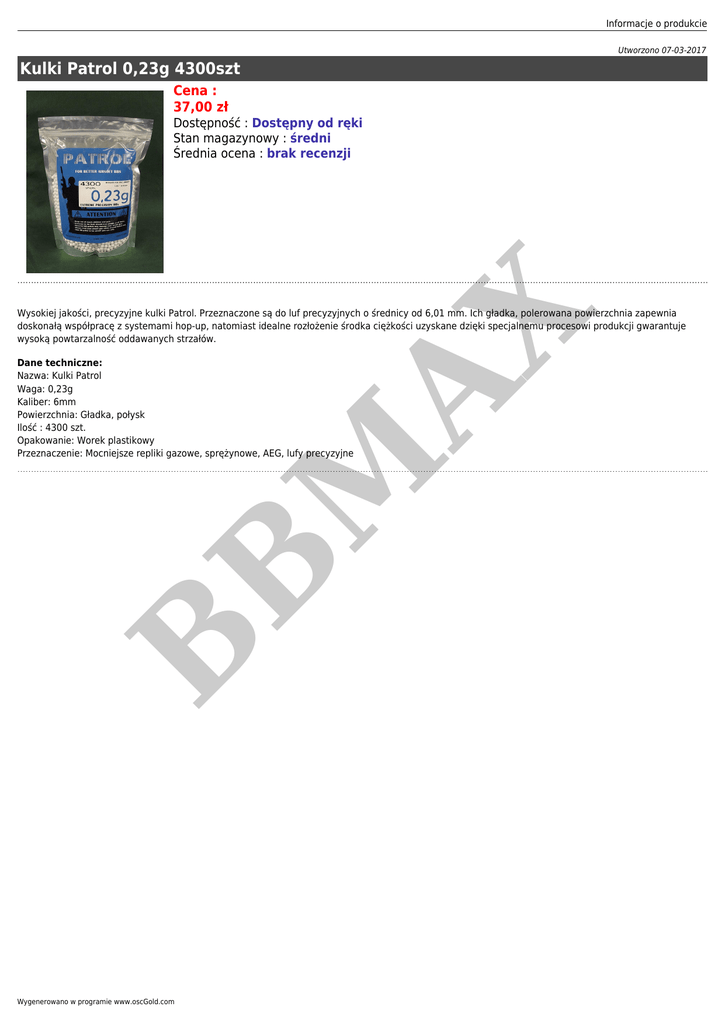 Informacje o produkcie Utworzono 07-03-2017 Kulki Patrol 0,23g 4300szt Cena : 37,00 zł Dostępność : Dostępny od ręki Stan magazynowy : średni Średnia ocena : brak recenzji M AX Wysokiej jakości, precyzyjne kulki Patrol. Przeznaczone są do luf precyzyjnych o średnicy od 6,01 mm. Ich gładka, polerowana powierzchnia zapewnia doskonałą współpracę z systemami hop-up, natomiast idealne rozłożenie środka ciężkości uzyskane dzięki specjalnemu procesowi produkcji gwarantuje wysoką powtarzalność oddawanych strzałów. B B Dane techniczne: Nazwa: Kulki Patrol Waga: 0,23g Kaliber: 6mm Powierzchnia: Gładka, połysk Ilość : 4300 szt. Opakowanie: Worek plastikowy Przeznaczenie: Mocniejsze repliki gazowe, sprężynowe, AEG, lufy precyzyjne Wygenerowano w programie www.oscGold.com
