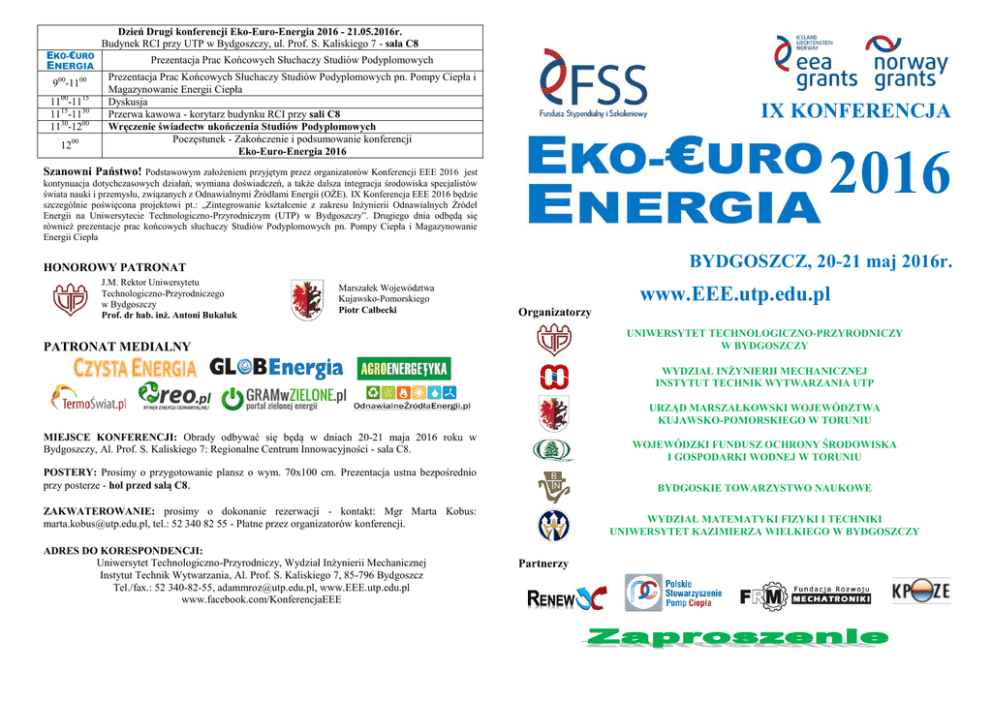 Dzień Drugi konferencji Eko-Euro-Energia 2016 - 21.05.2016r. Budynek RCI przy UTP w Bydgoszczy, ul. Prof. S. Kaliskiego 7 - sala C8 Prezentacja Prac Końcowych Słuchaczy Studiów Podyplomowych 900-1100 1100-1115 1115-1130 1130-1200 1200 Prezentacja Prac Końcowych Słuchaczy Studiów Podyplomowych pn. Pompy Ciepła i Magazynowanie Energii Ciepła Dyskusja Przerwa kawowa - korytarz budynku RCI przy sali C8 Wręczenie świadectw ukończenia Studiów Podyplomowych Poczęstunek - Zakończenie i podsumowanie konferencji Eko-Euro-Energia 2016 IX KONFERENCJA 2016 Szanowni Państwo! Podstawowym założeniem przyjętym przez organizatorów Konferencji EEE 2016 jest kontynuacja dotychczasowych działań, wymiana doświadczeń, a także dalsza integracja środowiska specjalistów świata nauki i przemysłu, związanych z Odnawialnymi Źródłami Energii (OŹE). IX Konferencja EEE 2016 będzie szczególnie poświęcona projektowi pt.: „Zintegrowanie kształcenie z zakresu Inżynierii Odnawialnych Źródeł Energii na Uniwersytecie Technologiczno-Przyrodniczym (UTP) w Bydgoszczy”. Drugiego dnia odbędą się również prezentacje prac końcowych słuchaczy Studiów Podyplomowych pn. Pompy Ciepła i Magazynowanie Energii Ciepła BYDGOSZCZ, 20-21 maj 2016r. HONOROWY PATRONAT J.M. Rektor Uniwersytetu Technologiczno-Przyrodniczego w Bydgoszczy Prof. dr hab. inż. Antoni Bukaluk Marszałek Województwa Kujawsko-Pomorskiego Piotr Całbecki www.EEE.utp.edu.pl Organizatorzy UNIWERSYTET TECHNOLOGICZNO-PRZYRODNICZY W BYDGOSZCZY PATRONAT MEDIALNY WYDZIAŁ INŻYNIERII MECHANICZNEJ INSTYTUT TECHNIK WYTWARZANIA UTP URZĄD MARSZAŁKOWSKI WOJEWÓDZTWA KUJAWSKO-POMORSKIEGO W TORUNIU MIEJSCE KONFERENCJI: Obrady odbywać się będą w dniach 20-21 maja 2016 roku w Bydgoszczy, Al. Prof. S. Kaliskiego 7: Regionalne Centrum Innowacyjności - sala C8. WOJEWÓDZKI FUNDUSZ OCHRONY ŚRODOWISKA I GOSPODARKI WODNEJ W TORUNIU POSTERY: Prosimy o przygotowanie plansz o wym. 70x100 cm. Prezentacja ustna bezpośrednio przy posterze - hol przed salą C8. BYDGOSKIE TOWARZYSTWO NAUKOWE ZAKWATEROWANIE: prosimy o dokonanie rezerwacji - kontakt: Mgr Marta Kobus: [email protected], tel.: 52 340 82 55 - Płatne przez organizatorów konferencji. ADRES DO KORESPONDENCJI: Uniwersytet Technologiczno-Przyrodniczy, Wydział Inżynierii Mechanicznej Instytut Technik Wytwarzania, Al. Prof. S. Kaliskiego 7, 85-796 Bydgoszcz Tel./fax.: 52 340-82-55, [email protected], www.EEE.utp.edu.pl www.facebook.com/KonferencjaEEE WYDZIAŁ MATEMATYKI FIZYKI I TECHNIKI UNIWERSYTET KAZIMIERZA WIELKIEGO W BYDGOSZCZY Partnerzy Dzień pierwszy - 20.05.2016r. Budynek RCI przy UTP w Bydgoszczy, ul. Prof. S. Kaliskiego 7 - sala C8 Sesja I - sala C8 - Przewodniczący: Dr hab. inż. Marek Macko 900-910 910-925 925-940 940-955 55 9 -10 10 1010-1025 1025-1040 1040-1055 1055-1105 1105-1120 Dr hab. inż. Dariusz Boroński - Prorektor ds. Nauki - UTP - Otwarcie Konferencji E€E 2016 Zintegrowanie kształcenie z zakresu Inżynierii OŹE na Dr inż. Adam Mroziński UTP w Bydgoszczy - podsumowanie Czynne monitorowanie procesu rozdrabniania biomasy Prof. dr hab. inż. Józef Flizikowski uziarnionej Analiza możliwości praktycznego wykorzystania OZE w Mgr inż. Tomasz Mania wybranym budynku WIM UTP w Bydgoszczy Dr hab. inż. Mariusz Chalamoński, Mgr inż. Magdalena Nakielska, Mgr inż. Analiza komina słonecznego w okresie jesiennym Marek Szymczak Dr hab. inż. Marek Macko, Dr Grzegorz Monitorowanie zapotrzebowania energetycznego w Śmigielski rozdrabniaczu fotowoltaicznym Rynek pomp ciepła w 2015 rok i Warunki techniczne w Dr inż. Adolf Mirowski 2017 - wpływ na rozwój rynku OZE Alternatywne źródła energii w obwodzie Сhmielnickim: Dr inż. Oлег Полищук stan i perspektywy rozwoju Dyskusja Przerwa kawowa - hol budynku RCI przy sali C8 Sesja II - sala C8 - Przewodniczący: Prof. dr hab. Józef Flizikowski Dr hab. inż. Zbigniew Podkówka Energia odnawialna ze słomy 1135-1150 Mgr inż. Wojciech Pratkowski, Mgr inż. Henryk Biernat, Dr inż. Bogdan Noga Możliwości wykorzystania wód termalnych udostępnionych w rejonie miejscowości Celejów Przykłady inwestycji w systemy pomp ciepła w województwie kujawsko-pomorskim Wielkopowierzchniowa instalacja solarna - analiza wybranego przykładu Dobre praktyki w pozyskiwaniu funduszy unijnych na inwestycje w OZE - wybrane przykłady 11 -12 05 Mgr inż. Adam Koniszewski 1205-1220 Mgr inż. Wojciech Wójcik 1220-1235 Dr Tadeusz Trocikowski Mgr inż. Marek Szymczak Wykorzystanie energetyczne biomasy 1250-1305 Mgr inż. Beata Dolata Paulownia - clon in vitro 112 1305-1320 Dr inż. Izabela Piasecka Analiza ekologiczno-energetyczna instalacji fotowoltaicznej 35 12 -12 20 13 -13 50 35 1335-1350 50 00 13 -14 1400-1500 cyklu istnienia Dr inż Sylwester Borowski, Dr inż. Logistyka dostaw surowca wybranej biogazowni rolniczej Jerzy Kaszkowiak Jerzy Kaszkowiak, Marietta Wpływ dodatku etanolu do benzyny na głośność pracy Markiewicz-Patalon silnika spalinowego Dyskusja Obiad - Restauracja Akademicka - ul. gen. W. Andersa 1 15 15 -15 30 Mgr inż. Michał Szczepański Piotr Leszek 1530-1545 Mgr Joanna Kawa 1545-1600 Mgr inż. Łukasz Trzeciak 00 16 -16 15 Inż. Weronika Kruszelnicka 15 30 Dyskusja 16 -16 Andrii Полищук P2 inż. Mateusz Buza, inż. Ola Madej, inż. Weronika Kruszelnicka P3 inż. Mateusz Buza, inż. Ola Madej, inż. Weronika Kruszelnicka P4 inż. Monika Lampart, inż. Paulina Lemieszko, inż. Izabela Liniewska P5 P6 P7 P8 P9 P10 P11 P13 P14 P15 P16 P17 P18 P19 Sesja III - sala C8 - Przewodniczący: Dr inż Adam Mroziński 1500-1515 P1 P12 1120-1135 50 Sesja IV: 1630-1715 - Sesja posterowa - Przewodniczący: Dr hab. inż. Andrzej Tomporowski Rozwój klastrów OZE w Polsce Komputerowe wspomaganie projektowania instalacji solarnych Kierunki rozwoju energetyki prosumenckiej w Polsce i Norwegii Fotowoltaika w trwającej rewolucji energetycznej – najnowsze trendy i zastosowania Analiza efektywności hybryd