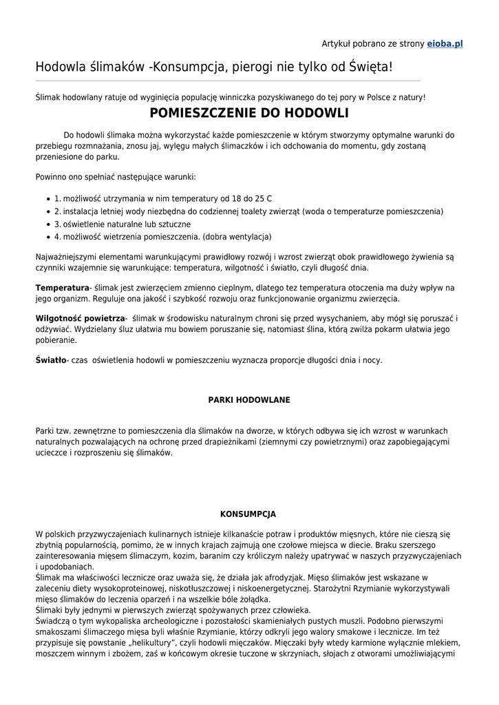 Artykuł pobrano ze strony eioba.pl Hodowla ślimaków -Konsumpcja, pierogi nie tylko od Święta! Ślimak hodowlany ratuje od wyginięcia populację winniczka pozyskiwanego do tej pory w Polsce z natury! POMIESZCZENIE DO HODOWLI Do hodowli ślimaka można wykorzystać każde pomieszczenie w którym stworzymy optymalne warunki do przebiegu rozmnażania, znosu jaj, wylęgu małych ślimaczków i ich odchowania do momentu, gdy zostaną przeniesione do parku. Powinno ono spełniać następujące warunki: 1. możliwość utrzymania w nim temperatury od 18 do 25 C 2. instalacja letniej wody niezbędna do codziennej toalety zwierząt (woda o temperaturze pomieszczenia) 3. oświetlenie naturalne lub sztuczne 4. możliwość wietrzenia pomieszczenia. (dobra wentylacja) Najważniejszymi elementami warunkującymi prawidłowy rozwój i wzrost zwierząt obok prawidłowego żywienia są czynniki wzajemnie się warunkujące: temperatura, wilgotność i światło, czyli długość dnia. Temperatura- ślimak jest zwierzęciem zmienno cieplnym, dlatego tez temperatura otoczenia ma duży wpływ na jego organizm. Reguluje ona jakość i szybkość rozwoju oraz funkcjonowanie organizmu zwierzęcia. Wilgotność powietrza- ślimak w środowisku naturalnym chroni się przed wysychaniem, aby mógł się poruszać i odżywiać. Wydzielany śluz ułatwia mu bowiem poruszanie się, natomiast ślina, którą zwilża pokarm ułatwia jego pobieranie. Światło- czas oświetlenia hodowli w pomieszczeniu wyznacza proporcje długości dnia i nocy. PARKI HODOWLANE Parki tzw. zewnętrzne to pomieszczenia dla ślimaków na dworze, w których odbywa się ich wzrost w warunkach naturalnych pozwalających na ochronę przed drapieżnikami (ziemnymi czy powietrznymi) oraz zapobiegającymi ucieczce i rozproszeniu się ślimaków. KONSUMPCJA W polskich przyzwyczajeniach kulinarnych istnieje kilkanaście potraw i produktów mięsnych, które nie cieszą się zbytnią popularnością, pomimo, że w innych krajach zajmują one czołowe miejsca w diecie. Braku szerszego zainteresowania mięsem ślimaczym, kozim, baranim czy króliczym należy upatrywać w naszych przyzwyczajeniach i upodobaniach. Ślimak ma właściwości lecznicze oraz uważa się, że działa jak afrodyzjak. Mięso ślimaków jest wskazane w zaleceniu diety wysokoproteinowej, niskotłuszczowej i niskoenergetycznej. Starożytni Rzymianie wykorzystywali mięso ślimaków do leczenia oparzeń i na wszelkie bóle żołądka. Ślimaki były jednymi w pierwszych zwierząt spożywanych przez człowieka. Świadczą o tym wykopaliska archeologiczne i pozostałości skamieniałych pustych muszli. Podobno pierwszymi smakoszami ślimaczego mięsa byli właśnie Rzymianie, którzy odkryli jego walory smakowe i lecznicze. Im też przypisuje się powstanie „helikultury”, czyli hodowli mięczaków. Mięczaki były wtedy karmione wyłącznie mlekiem, moszczem winnym i zbożem, zaś w końcowym okresie tuczone w skrzyniach, słojach z otworami umożliwiającymi dostęp powietrza, ale nie pozwalającymi na ucieczkę. Gdy ślimak był tak tłusty, że nie mieścił się na powrót do muszelki, uznawano, że nadaje się do konsumpcji. W czasach średniowiecza mięczak rozpowszechniony został przez zakonników jako źródło taniego pożywienia, dozwolonego również w okresach postu, a już w XV wieku escargot -ślimak stał się popularnym daniem na licznych francuskich stołach. Do Polski trafiły za sprawą franciszkanów i dominikanów którzy zajmowali się ich hodowlą, a także docenili ślimaki jako wartościowy dodatek do postnego jadłospisu. Walory zdrowotne mięsa od dawna są przedmiotem kontrowersyjnych poglądów wśród ludzi. Jedni widzą w mięsie znakomite źródło niezbędnych składników odżywczych, inni natomiast przypisują odpowiedzialność za występowanie chorób cywilizacyjnych. Mięso ślimaków jest natomiast dobrym źródłem licznych niezbędnych składników odżywczych. Wartości odżywcze mięsa ślimaczego: 100 gramów mięsa zawiera 25 g białka, a przy tym tylko 2 g tłuszczy i 5 g węglowodanów. Bardzo wysoka jest zawartość sodu – 990 mg, fosforu – 180 mg i magnezu – 35 mg. Żelazo występuje w ilości 8 mg, a bardzo istotny w procesach enzymatycznych cynk około 2 mg. Wartość energetyczna to około 80 kcal na 100g produktu. Czy ślimaki mają szansę zagościć na polskich stołach ? Jest taka szansa, gdyż zyskują ostatnio coraz szerszą rzeszę zwolenników… Na pewno są alternatywą dla mięsa drobiowego, a omówione walory mięsa ślimaczego zdecydowanie przemawiają za rozpowszechnieniem konsumpcji tego mięsa w Polsce, co stało się już w krajach Unii Europejskiej. Wzrost konsumpcji będzie związany ze zmianą tradycji żywieniowych rodaków i naszą otwartością na nowe sposoby żywienia. Przepis na Święta Pierogi ze ślimakami po polsku Trzeba znajść ślimaka dorodnego, gabarytu orzecha włoskiego. Należy go tak długo topić, by szlam z niego w dużej mierze wypłoszyć. W kamionkę je wszystkie ułożyć, by obficie grubą solą przełożyć. Denkiem je przykrywając by musiały zawracać uciekając. Pozostawić je przez czas długi, pozbywając się szlamu z tuszek dużych. Wypłukać je kilkakrotnie obficie by szlam ściągnąć całkowicie. Sparzyć w garze należycie pamiętając by były w muszlach skryte całkowicie. Zlać przez sito odcedzając wodę, spłukać ostudzając. Wyciągnąć poza domostwa progi i obmyć bo przecież brudne miały nogi. Ziela trochę ze dwa liście, trzy goździki, sól w zamyśle, jedną dymkę oczywiście, zalać wodą zagotować by ślimaki móc gotować. Czas wysadki dwie godziny, ślimak będzie już zjadliwy. składniki (6 porcji): pierogi: - ślimaki gotowane 200 g - śmietana 30% 50 g - bułka tarta 50 g - masło 50 g - czosnek 5 ząbków - natka pietruszki 1/2 pęczka - cytryna 1/2 sztuki - sól, pieprz biały - ciasto pierogowe sos: - śmietana 30% 300 g - cebu