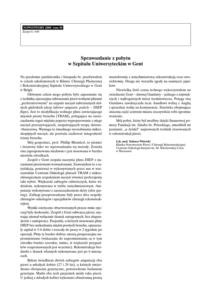 NOWOTWORY 2000 / tom 50 Zeszyt 6 / 649 Sprawozdanie z pobytu w Szpitalu Uniwersyteckim w Gent Na prze∏omie paêdziernika i listopada br. przebywa∏em w celach szkoleniowych w Klinice Chirurgii Plastycznej i Rekonstrukcyjnej Szpitala Uniwersyteckiego w Gent w Belgii. G∏ównym celem mego pobytu by∏o zapoznanie si´ z technikà operacyjnà odtwarzania piersi wolnymi p∏atami „perforatorowymi” na szypule naczyƒ nabrzusznych dolnych g∏´bokich (deep inferior epigastric pedicle – DIEP flaps). Jest to modyfikacja wolnego p∏ata zawierajàcego mi´sieƒ prosty brzucha (TRAM), polegajàca na zaoszcz´dzeniu tego˝ mi´Ênia poprzez wypreparowanie z niego naczyƒ przeszywajàcych, zaopatrujàcych wysp´ skórno-t∏uszczowà. Wymaga to ˝mudnego wyosobniania mikroskopijnych naczyƒ, ale pozwala zachowaç integralnoÊç Êciany brzucha. Mój gospodarz, prof. Phillip Blondeel, to pionier i Êwiatowy lider we wprowadzaniu tej metody. Zosta∏a ona zaproponowana niedawno i jest stosowana w bardzo niewielu oÊrodkach. Zespó∏ z Gent zespala naczynia p∏ata DIEP z naczyniami piersiowymi wewn´trznymi. Zauwa˝y∏em to z satysfakcjà, poniewa˝ w wykonywanych przez nas w warszawskim Centrum Onkologii p∏atach TRAM z mikrochirurgicznym zespalaniem naczyƒ równie˝ preferujemy taki wybór. Wi´kszoÊç zabiegów odtwórczych, które widzia∏em, wykonywano w trybie natychmiastowym. Amputacje wykonywano z zaoszcz´dzeniem skóry (skin sparing). Zabiegi przeprowadzane by∏y przez dwa zespo∏y: chirurgów onkologów i specjalistów chirurgii rekonstrukcyjnej. Wyniki estetyczne obserwowanych przeze mnie operacji by∏y doskona∏e. Zespó∏ z Gent odtwarza piersi, u˝ywajàc niemal wy∏àcznie tkanek autogennych, bez ekspanderów i endoprotez. Pacjentki, u których stosowano p∏aty DIEP bez uszkadzania mi´Êni prostych brzucha, opuszcza∏y szpital w 5-6 dobie i wraca∏y do pracy w 2 tygodnie po operacji. P∏aty te bardzo dobrze znoszà pooperacyjne napromienianie (wskazania do napromieniania sà w tym oÊrodku bardzo szerokie, mimo, i˝ wi´kszoÊç przypadków rozpoznawanych jest wczeÊnie). Rekonstrukcja brodawki z tkanek w∏asnych wykonywana jest po 6 miesiàcach. By∏em Êwiadkiem dwóch zabiegów amputacji obu piersi u m∏odych kobiet (27 i 29 lat), u których stwierdzono obcià˝enia genetyczne, potwierdzone badaniem genotypu. Matki obu tych pacjentek mia∏y raka piersi. U jednej z m∏odych kobiet wykonano obustronnà prostà mastektomi´ z natychmiastowà rekonstrukcjà oraz owariektomi´. Druga nie wyrazi∏a zgody na usuni´cie jajników. Niewielkà iloÊç czasu wolnego wykorzysta∏em na zwiedzenie Gent – dawnej Gandawy – jednego z najwi´kszych i najbogatszych miast Êredniowiecza. Pot´g´ swà Gandawa zawdzi´cza∏a m.in. handlowi we∏nà z Anglià i sprzeda˝y we∏ny na kontynencie. Starówka obejmujàca znacznà cz´Êç centrum miasta rzeczywiÊcie robi ogromne wra˝enie. Mój pobyt, który by∏ mo˝liwy dzi´ki finansowej pomocy Fundacji im. Jakuba hr. Potockiego, umo˝liwi∏ mi poznanie „u êróde∏” najnowszych technik stosowanych w rekonstrukcji piersi. Lek. med. Tadeusz Witwicki Klinika Nowotworów Piersi i Chirurgii Rekonstrukcyjnej Centrum Onkologii-Instytut im. M. Sk∏odowskiej Curie w Warszawie