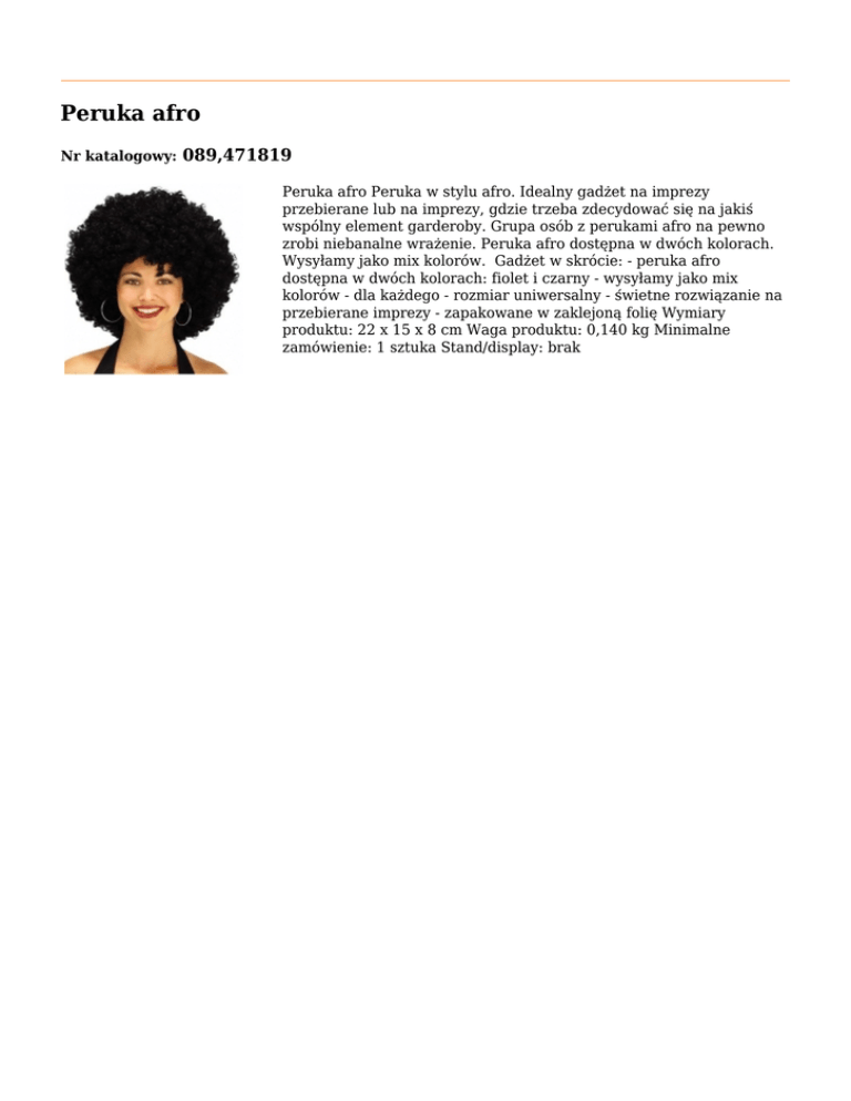 Peruka afro Nr katalogowy: 089,471819 Peruka afro Peruka w stylu afro. Idealny gadżet na imprezy przebierane lub na imprezy, gdzie trzeba zdecydować się na jakiś wspólny element garderoby. Grupa osób z perukami afro na pewno zrobi niebanalne wrażenie. Peruka afro dostępna w dwóch kolorach. Wysyłamy jako mix kolorów. Gadżet w skrócie: - peruka afro dostępna w dwóch kolorach: fiolet i czarny - wysyłamy jako mix kolorów - dla każdego - rozmiar uniwersalny - świetne rozwiązanie na przebierane imprezy - zapakowane w zaklejoną folię Wymiary produktu: 22 x 15 x 8 cm Waga produktu: 0,140 kg Minimalne zamówienie: 1 sztuka Stand/display: brak