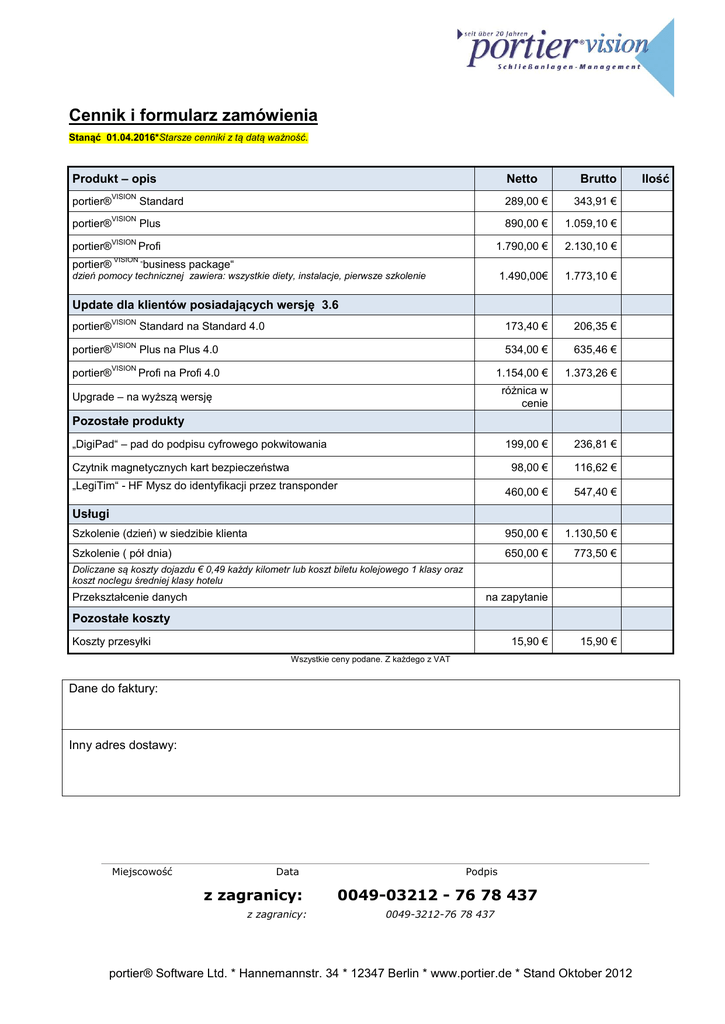 Cennik i formularz zamówienia Stanąć 01.04.2016*Starsze cenniki z tą datą ważność. Produkt – opis Netto Brutto portier® VISION Standard 289,00 € 343,91 € portier® VISION Plus 890,00 € 1.059,10 € portier® VISION Profi 1.790,00 € 2.130,10 € 1.490,00€ 1.773,10 € portier® VISION „ business package“ dzień pomocy technicznej zawiera: wszystkie diety, instalacje, pierwsze szkolenie Update dla klientów posiadających wersję 3.6 portier® VISION Standard na Standard 4.0 173,40 € 206,35 € portier® VISION Plus na Plus 4.0 534,00 € 635,46 € portier® VISION Profi na Profi 4.0 1.154,00 € 1.373,26 € różnica w cenie Upgrade – na wyższą wersję Pozostałe produkty „DigiPad“ – pad do podpisu cyfrowego pokwitowania 199,00 € 236,81 € 98,00 € 116,62 € 460,00 € 547,40 € Szkolenie (dzień) w siedzibie klienta 950,00 € 1.130,50 € Szkolenie ( pół dnia) 650,00 € 773,50 € Czytnik magnetycznych kart bezpieczeństwa „LegiTim“ - HF Mysz do identyfikacji przez transponder Usługi Doliczane są koszty dojazdu € 0,49 każdy kilometr lub koszt biletu kolejowego 1 klasy oraz koszt noclegu średniej klasy hotelu Przekształcenie danych na zapytanie Pozostałe koszty Koszty przesyłki 15,90 € 15,90 € Wszystkie ceny podane. Z każdego z VAT Dane do faktury: Inny adres dostawy: Miejscowość Data z zagranicy: z zagranicy: Podpis 0049-03212 - 76 78 437 0049-3212-76 78 437 portier® Software Ltd. * Hannemannstr. 34 * 12347 Berlin * www.portier.de * Stand Oktober 2012 Ilość