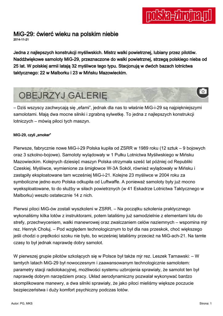 MiG-29: ćwierć wieku na polskim niebie 2014-11-21 Jedna z najlepszych konstrukcji myśliwskich. Mistrz walki powietrznej, lubiany przez pilotów. Naddźwiękowe samoloty MiG-29, przeznaczone do walki powietrznej, strzegą polskiego nieba od 25 lat. W polskiej armii latają 32 myśliwce tego typu. Stacjonują w dwóch bazach lotnictwa taktycznego: 22 w Malborku i 23 w Mińsku Mazowieckim. – Dziś wszyscy zachwycają się „efami”, jednak dla nas to właśnie MiG-i-29 są najpiękniejszymi samolotami. Mają dwa mocne silniki i zgrabną sylwetkę. To jedna z najlepszych konstrukcji lotniczych – mówią piloci tych maszyn. MiG-29, czyli „smoker” Pierwsze, fabrycznie nowe MiG-i-29 Polska kupiła od ZSRR w 1989 roku (12 sztuk – 9 bojowych oraz 3 szkolno-bojowe). Samoloty wylądowały w 1 Pułku Lotnictwa Myśliwskiego w Mińsku Mazowieckim. Kolejnych dziesięć maszyn Polska otrzymała sześć lat później od Republiki Czeskiej. Myśliwce, wymienione za śmigłowce W-3A Sokół, również wylądowały w Mińsku i zastąpiły eksploatowane tam wcześniej MiG-i-21. Kolejne 23 myśliwce w 2004 roku za symboliczne jedno euro Polska odkupiła od Luftwaffe. A ponieważ samoloty były już mocno wyeksploatowane, to do służby w siłach powietrznych (w 41 Eskadrze Lotnictwa Taktycznego w Malborku) weszło ostatecznie 14 z nich. Pierwsi piloci MiG-ów zostali wyszkoleni w ZSRR. – Na początku szkolenia praktycznego wykonaliśmy kilka lotów z instruktorami, potem lataliśmy już samodzielnie z elementami lotu do strefy, przechwyceniem, walki manewrowej oraz zwalczaniem celów naziemnych – wspomina mjr rez. Henryk Chołuj. – Pod względem technologicznym to był dla nas przeskok, choć większego jeśli chodzi o prędkości szoku nie było, bo wcześniej lataliśmy przecież na MiG-ach-21. Na tamte czasy to był jednak naprawdę dobry samolot. W pierwszej grupie pilotów szkolących się w Polsce był także mjr rez. Leszek Tarnawski: – W tamtych latach MiG-29 był nowoczesnym i zaawansowanym technologicznie samolotem: parametry stacji radiolokacyjnej, możliwości systemu uzbrojenia sprawiały, że samolot ten był naprawdę dobrym narzędziem pracy. Układ aerodynamiczny pozwalał wykonywać bardzo skomplikowane manewry, a dwa silniki sprawiały, że jako piloci mieliśmy większe poczucie bezpieczeństwa i duży komfort psychiczny podczas lotów. Autor: PG, MKS Strona: 1 Cechą charakterystyczną są znaczące niebo smugi czarnego dymu, które wydobywają się z silników. To dzięki nim, obok natowskiego oznaczenia kodowego „Fulcrum”, MiG-29 zyskał na Zachodzie przydomek „smoker”. Na straży nieba Dziś myśliwce służą nie tylko w kraju, ale i zagranicą. Od 2009 roku uczestniczą w kursie Tactical Leadership Programme (TLP) w Hiszpanii. Podczas szkoleń piloci myśliwców współpracowali w powietrzu z Francuzami pilotującymi samoloty Alfa Jet i Brytyjczykami w myśliwcach Hawk. Trenowali też z greckimi F-16 i brytyjskimi samolotami Eurofighter. Jednym z podstawowych zadań MiG-ów-29 jest pełnienie dyżurów bojowych w ramach natowskiej misji Baltic Air Policing, trwającej nieprzerwanie od 2004 roku. Głównym zadaniem Polaków jest nadzorowanie przestrzeni powietrznej nad krajami bałtyckimi. Piloci latają czterema myśliwcami MiG-29, pełnią zwykle całodobowe dyżury bojowe, prowadzą też rozpoznanie i w sytuacjach awaryjnych udzielają pomocy załogom wojskowych i cywilnych samolotów. Film: Combat Camera / DO RSZ Żołnierze z jednostek w Mińsku Mazowieckim i Malborku uczestniczyli w misji BAP już pięć razy. Po raz pierwszy w 2006 roku. Łącznie spędzili w powietrzu przeszło 1000 godzin. Ostatnią, piątą zmianę PKW „Orlik” wystawiła jednostka z Malborka. 90 żołnierzy pod dowództwem ppłk. pil. Krzysztofa Stobieckiego służyło na Litwie od maja do końca sierpnia 2014 roku. Do szóstej zmiany „Orlika” szykuje się już kolejna grupa pilotów z 23 Bazy. Liczącym 120 osób polskim kontyngentem dowodził będzie ppłk pil. Artur Piskorz. Dyżur potrwa od 12 stycznia do 30 kwietnia 2015 r. Po liftingu Decyzja o unowocześnieniu samolotów MiG-29 zapadła w 2011 roku. Z czasem bowiem MiG-i-29, choć młodsze od F-16, zaczęły odstawać od czołówki najlepszych myśliwców. Dlatego Inspektorat Uzbrojenia i Wojskowe Zakłady Lotnicze w Bydgoszczy podpisały umowę, która zakładała, że szesnaście myśliwców zostanie wyposażonych w awionikę nowej generacji. Plan został wykonany: lifting przeszło 13 jednomiejscowych maszyn bojowych i trzy dwumiejscowe szkolnobojowe. Autor: PG, MKS Strona: 2 Samoloty dostosowano do natowskich standardów, tak by odpowiadały wymogom współczesnego pola walki. Zamiast urządzeń analogowych zamontowano cyfrowe. Myśliwce wyposażone zostały w nowej generacji komputer danych aerodynamicznych ADC (Air Data Computer). Unowocześniono także ich kokpit. Na kolorowym, ciekłokrystalicznym wyświetlaczu pilot może obserwować całą trasę lotu. Poprawiono także możliwości komunikacji pilotów i zamontowano nowe radiostacje. Zmodernizowane samoloty wyposażono w stację planowania misji (Mission Planning Station – MPS), dzięki czemu przygotowanie myśliwca do lotu jest prostsze i zajmuje mniej czasu. Pilot może zaplanować w szczegółach cały lot. Na nośniku danych może umieścić na przykład informacje o lotniskach, strefach zastrzeżonych lub niebezpiecznych, o punktach orientacyjnych, a także o alertach: minimalnej i maksymalnej wysokości, przeciążeniu czy ilości paliwa. Wszystkie te dane wyświetlają się na monitorze i w każdej chwili można je korygować. MiG-i malowane – Już w szkole oficerskiej marzyłem o lataniu na MiG-ach. To dobry samolot pod względem pilotażowym, a pod względem aerodynamicznym jest jednym z najlepszych na świecie – mówi por. pil. Ireneusz Krajewski z 22 Bazy w Malborku, który za sterami MiG-a spędził 350 godzin. – Ma wytrzymałą ko