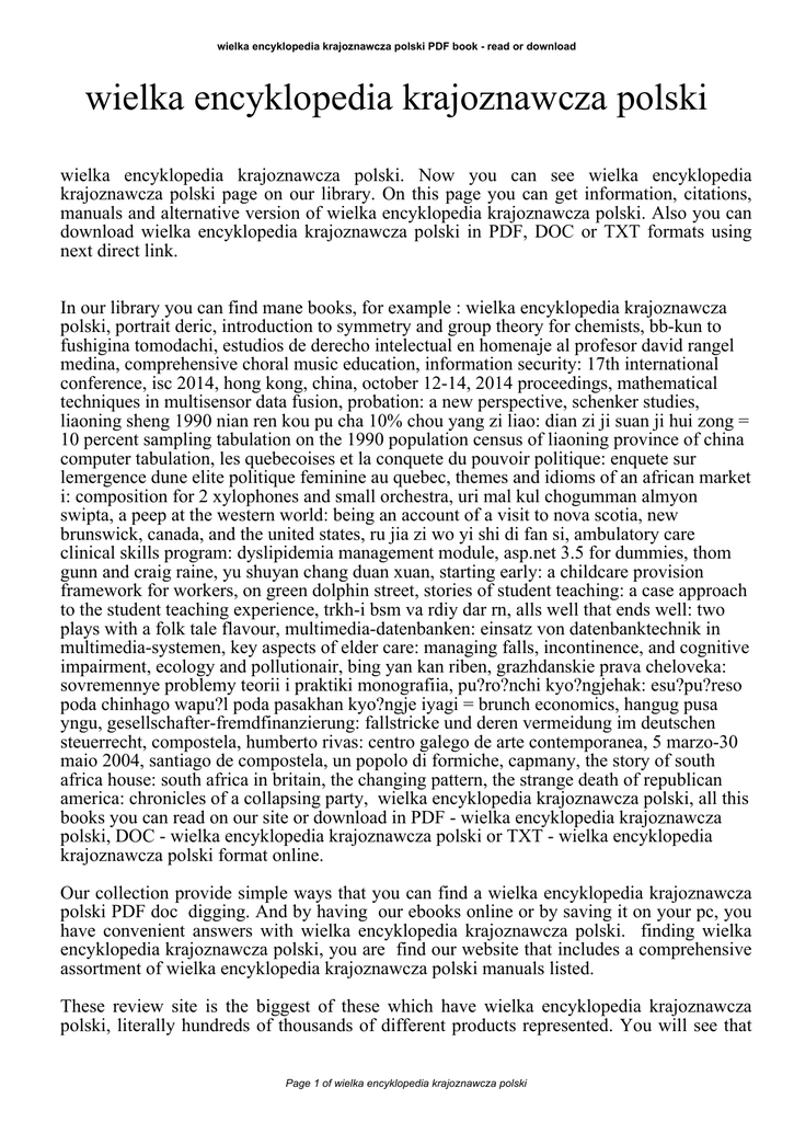 wielka encyklopedia krajoznawcza polski PDF book - read or download wielka encyklopedia krajoznawcza polski wielka encyklopedia krajoznawcza polski. Now you can see wielka encyklopedia krajoznawcza polski page on our library. On this page you can get information, citations, manuals and alternative version of wielka encyklopedia krajoznawcza polski. Also you can download wielka encyklopedia krajoznawcza polski in PDF, DOC or TXT formats using next direct link. In our library you can find mane books, for example : wielka encyklopedia krajoznawcza polski, portrait deric, introduction to symmetry and group theory for chemists, bb-kun to fushigina tomodachi, estudios de derecho intelectual en homenaje al profesor david rangel medina, comprehensive choral music education, information security: 17th international conference, isc 2014, hong kong, china, october 12-14, 2014 proceedings, mathematical techniques in multisensor data fusion, probation: a new perspective, schenker studies, liaoning sheng 1990 nian ren kou pu cha 10% chou yang zi liao: dian zi ji suan ji hui zong = 10 percent sampling tabulation on the 1990 population census of liaoning province of china computer tabulation, les quebecoises et la conquete du pouvoir politique: enquete sur lemergence dune elite politique feminine au quebec, themes and idioms of an african market i: composition for 2 xylophones and small orchestra, uri mal kul chogumman almyon swipta, a peep at the western world: being an account of a visit to nova scotia, new brunswick, canada, and the united states, ru jia zi wo yi shi di fan si, ambulatory care clinical skills program: dyslipidemia management module, asp.net 3.5 for dummies, thom gunn and craig raine, yu shuyan chang duan xuan, starting early: a childcare provision framework for workers, on green dolphin street, stories of student teaching: a case approach to the student teaching experience, trkh-i bsm va rdiy dar rn, alls well that ends well: two plays with a folk tale flavour, multimedia-datenbanken: einsatz von datenbanktechnik in multimedia-systemen, key aspects of elder care: managing falls, incontinence, and cognitive impairment, ecology and pollutionair, bing yan kan riben, grazhdanskie prava cheloveka: sovremennye problemy teorii i praktiki monografiia, pu?ro?nchi kyo?ngjehak: esu?pu?reso poda chinhago wapu?l poda pasakhan kyo?ngje iyagi = brunch economics, hangug pusa yngu, gesellschafter-fremdfinanzierung: fallstricke und deren vermeidung im deutschen steuerrecht, compostela, humberto rivas: centro galego de arte contemporanea, 5 marzo-30 maio 2004, santiago de compostela, un popolo di formiche, capmany, the story of south africa house: south africa in britain, the changing pattern, the strange death of republican america: chronicles of a collapsing party, wielka encyklopedia krajoznawcza polski, all this books you can read on our site or download in PDF - wielka encyklopedia krajoznawcza polski, DOC - wielka encyklopedia krajoznawcza polski or TXT - wielka encyklopedia krajoznawcza polski format online. Our collection provide simple ways that you can find a wielka encyklopedia krajoznawcza polski PDF doc digging. And by having our ebooks online or by saving it on your pc, you have convenient answers with wielka encyklopedia krajoznawcza polski. finding wielka encyklopedia krajoznawcza polski, you are find our website that includes a comprehensive assortment of wielka encyklopedia krajoznawcza polski manuals listed. These review site is the biggest of these which have wielka encyklopedia krajoznawcza polski, literally hundreds of thousands of different products represented. You will see that Page 1 of wielka encyklopedia krajoznawcza polski wielka encyklopedia krajoznawcza polski PDF book - read or download there are specific sites catered to different product also categories or types, brands or niches related with wielka encyklopedia krajoznawcza polski. So depending on what exactly you are searching, you shall be in a position to choose ebooks wielka encyklopedia krajoznawcza polski to fit your own needs, wielka encyklopedia krajoznawcza polski. Page 2 of wielka encyklopedia krajoznawcza polski