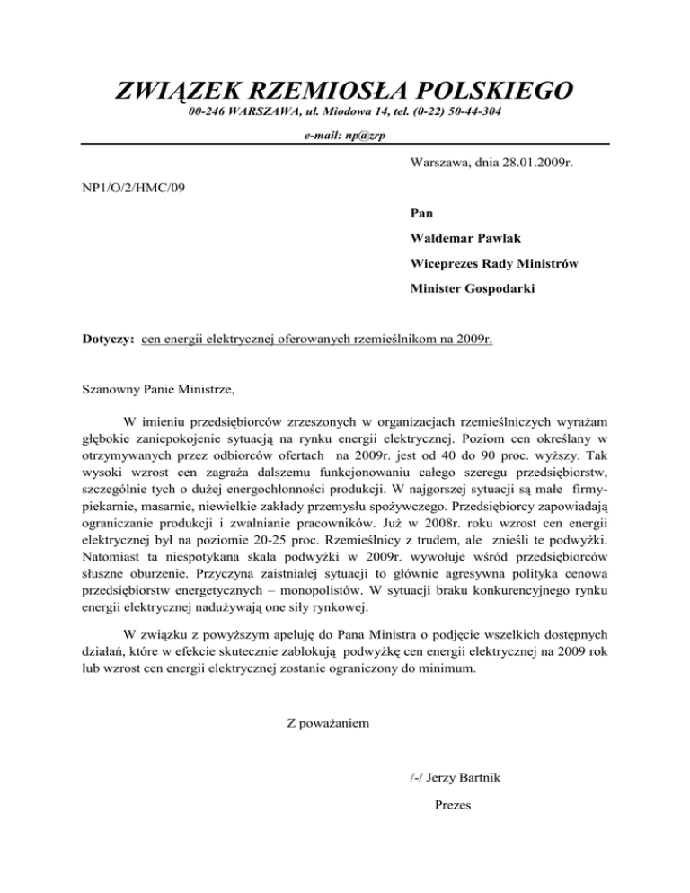ZWIĄZEK RZEMIOSŁA POLSKIEGO 00-246 WARSZAWA, ul. Miodowa 14, tel. (0-22) 50-44-304 e-mail: np@zrp Warszawa, dnia 28.01.2009r. NP1/O/2/HMC/09 Pan Waldemar Pawlak Wiceprezes Rady Ministrów Minister Gospodarki Dotyczy: cen energii elektrycznej oferowanych rzemieślnikom na 2009r. Szanowny Panie Ministrze, W imieniu przedsiębiorców zrzeszonych w organizacjach rzemieślniczych wyraŜam głębokie zaniepokojenie sytuacją na rynku energii elektrycznej. Poziom cen określany w otrzymywanych przez odbiorców ofertach na 2009r. jest od 40 do 90 proc. wyŜszy. Tak wysoki wzrost cen zagraŜa dalszemu funkcjonowaniu całego szeregu przedsiębiorstw, szczególnie tych o duŜej energochłonności produkcji. W najgorszej sytuacji są małe firmypiekarnie, masarnie, niewielkie zakłady przemysłu spoŜywczego. Przedsiębiorcy zapowiadają ograniczanie produkcji i zwalnianie pracowników. JuŜ w 2008r. roku wzrost cen energii elektrycznej był na poziomie 20-25 proc. Rzemieślnicy z trudem, ale znieśli te podwyŜki. Natomiast ta niespotykana skala podwyŜki w 2009r. wywołuje wśród przedsiębiorców słuszne oburzenie. Przyczyna zaistniałej sytuacji to głównie agresywna polityka cenowa przedsiębiorstw energetycznych – monopolistów. W sytuacji braku konkurencyjnego rynku energii elektrycznej naduŜywają one siły rynkowej. W związku z powyŜszym apeluję do Pana Ministra o podjęcie wszelkich dostępnych działań, które w efekcie skutecznie zablokują podwyŜkę cen energii elektrycznej na 2009 rok lub wzrost cen energii elektrycznej zostanie ograniczony do minimum. Z powaŜaniem /-/ Jerzy Bartnik Prezes