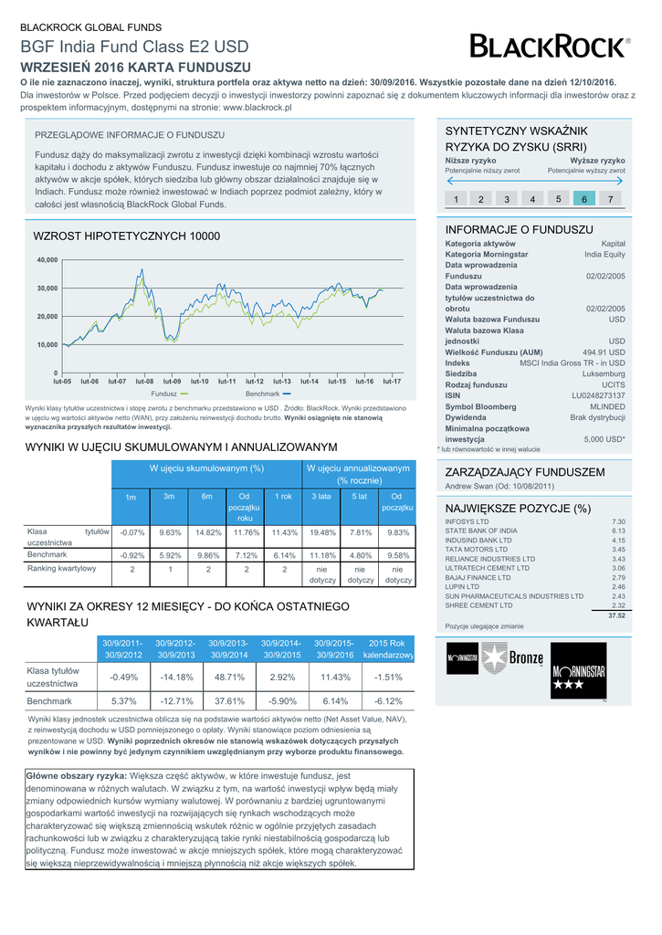 BLACKROCK GLOBAL FUNDS BGF India Fund Class E2 USD WRZESIEŃ 2016 KARTA FUNDUSZU O ile nie zaznaczono inaczej, wyniki, struktura portfela oraz aktywa netto na dzień: 30/09/2016. Wszystkie pozostałe dane na dzień 12/10/2016. Dla inwestorów w Polsce. Przed podjęciem decyzji o inwestycji inwestorzy powinni zapoznać się z dokumentem kluczowych informacji dla inwestorów oraz z prospektem informacyjnym, dostępnymi na stronie: www.blackrock.pl SYNTETYCZNY WSKAŹNIK RYZYKA DO ZYSKU (SRRI) PRZEGLĄDOWE INFORMACJE O FUNDUSZU Fundusz dąży do maksymalizacji zwrotu z inwestycji dzięki kombinacji wzrostu wartości kapitału i dochodu z aktywów Funduszu. Fundusz inwestuje co najmniej 70% łącznych aktywów w akcje spółek, których siedziba lub główny obszar działalności znajduje się w Indiach. Fundusz może również inwestować w Indiach poprzez podmiot zależny, który w całości jest własnością BlackRock Global Funds. Niższe ryzyko 1 Fundusz Benchmark Wyniki klasy tytułów uczestnictwa i stopę zwrotu z benchmarku przedstawiono w USD . Źródło: BlackRock. Wyniki przedstawiono w ujęciu wg wartości aktywów netto (WAN), przy założeniu reinwestycji dochodu brutto. Wyniki osiągnięte nie stanowią wyznacznika przyszłych rezultatów inwestycji. WYNIKI W UJĘCIU SKUMULOWANYM I ANNUALIZOWANYM W ujęciu skumulowanym (%) Klasa uczestnictwa tytułów Benchmark Ranking kwartylowy 3m 6m 2 3 Potencjalnie wyższy zwrot 4 5 6 7 INFORMACJE O FUNDUSZU WZROST HIPOTETYCZNYCH 10000 1m Wyższe ryzyko Potencjalnie niższy zwrot Od początku roku * lub równowartość w innej walucie W ujęciu annualizowanym (% rocznie) 1 rok Kategoria aktywów Kapitał Kategoria Morningstar India Equity Data wprowadzenia Funduszu 02/02/2005 Data wprowadzenia tytułów uczestnictwa do obrotu 02/02/2005 Waluta bazowa Funduszu USD Waluta bazowa Klasa jednostki USD Wielkość Funduszu (AUM) 494.91 USD Indeks MSCI India Gross TR - in USD Siedziba Luksemburg Rodzaj funduszu UCITS ISIN LU0248273137 Symbol Bloomberg MLINDED Dywidenda Brak dystrybucji Minimalna początkowa inwestycja 5,000 USD* 3 lata 5 lat Od początku -0.07% 9.63% 14.82% 11.76% 11.43% 19.48% 7.81% 9.83% -0.92% 5.92% 9.86% 7.12% 6.14% 11.18% 4.80% 9.58% 2 1 2 2 2 nie dotyczy nie dotyczy nie dotyczy WYNIKI ZA OKRESY 12 MIESIĘCY - DO KOŃCA OSTATNIEGO KWARTAŁU ZARZĄDZAJĄCY FUNDUSZEM Andrew Swan (Od: 10/08/2011) NAJWIĘKSZE POZYCJE (%) INFOSYS LTD STATE BANK OF INDIA INDUSIND BANK LTD TATA MOTORS LTD RELIANCE INDUSTRIES LTD ULTRATECH CEMENT LTD BAJAJ FINANCE LTD LUPIN LTD SUN PHARMACEUTICALS INDUSTRIES LTD SHREE CEMENT LTD 7.30 6.13 4.15 3.45 3.43 3.06 2.79 2.46 2.43 2.32 37.52 Pozycje ulegające zmianie 30/9/201130/9/2012 30/9/201230/9/2013 30/9/201330/9/2014 30/9/201430/9/2015 30/9/201530/9/2016 2015 Rok kalendarzowy Klasa tytułów uczestnictwa -0.49% -14.18% 48.71% 2.92% 11.43% -1.51% Benchmark 5.37% -12.71% 37.61% -5.90% 6.14% -6.12% Wyniki klasy jednostek uczestnictwa oblicza się na podstawie wartości aktywów netto (Net Asset Value, NAV), z reinwestycją dochodu w USD pomniejszonego o opłaty. Wyniki stanowiące poziom odniesienia są prezentowane w USD. Wyniki poprzednich okresów nie stanowią wskazówek dotyczących przyszłych wyników i nie powinny być jedynym czynnikiem uwzględnianym przy wyborze produktu finansowego. Główne obszary ryzyka: Większa część aktywów, w które inwestuje fundusz, jest denominowana w różnych walutach. W związku z tym, na wartość inwestycji wpływ będą miały zmiany odpowiednich kursów wymiany walutowej. W porównaniu z bardziej ugruntowanymi gospodarkami wartość inwestycji na rozwijających się rynkach wschodzących może charakteryzować się większą zmiennością wskutek różnic w ogólnie przyjętych zasadach rachunkowości lub w związku z charakteryzującą takie rynki niestabilnością gospodarczą lub polityczną. Fundusz może inwestować w akcje mniejszych spółek, które mogą charakteryzować się większą nieprzewidywalnością i mniejszą płynnością niż akcje większych spółek. pobrano z mojeFundusze.pl PODZIAŁ WG SEKTORÓW (%) Sektor finansowy Informatyka I Technologia Dobra Luksusowe Materiały Przemysł Energia Opieka Zdrowotna Dobra Podstawowe Gotówka Usługi Komunalne Telekomunikacja Fundusz 26.94 11.61 10.64 10.31 9.05 8.33 8.22 6.72 4.66 3.53 0.00 KAPITALIZACJA RYNKOWA (%) Benchmark 21.67 16.93 14.29 7.31 6.10 9.11 10.37 9.58 0.00 1.94 2.70 +/5.26 -5.32 -3.66 3.00 2.95 -0.78 -2.14 -2.87 4.66 1.59 -2.70 Ujemne wagi mogą wynikać ze szczególnych okoliczności (w tym różnic czasowych między datami transakcji a datami rozliczenia papierów wartościowych nabywanych przez fundusze) i/lub zastosowania pewnych instrumentów finansowych, w tym finansowych instrumentów pochodnych, które mogą być wykorzystywane w celu zwiększenia lub zmniejszenia ekspozycji rynkowej i/lub w celu zarządzania ryzykiem. Alokacja inwestycji może ulegać zmianie. Od dnia 1 września 2016 r. GIC wzrośnie z 10 do 11 sektorów. Papiery wartościowe sektora nieruchomości, wcześniej klasyfikowane wraz z usługami finansowymi, będą wykazywane jako nowy sektor – nieruchomości– Benchmark DANE TRANSAKCYJNE Rozliczenie Częstotliwość transakcji STRUKTURA OPŁAT I KOSZTÓW Maksymalna opłata za subskrypcję Opłata za umorzenie Opłaty bieżące Opłata za wyniki Fundusz 3.00% 0.00% 2.47% 0.00% Data zawarcia transakcji + 3 dni Codziennie, na podstawie wyceny forward Inwestorzy mogą podlegać zobowiązaniom podatkowym od inwestycji w zależności od ich osobistej sytuacji. Poziomy i podstawa opodatkowania może ulec zmianie od czasu do czasu. Proszę zapoznać się z prospektem funduszy BGF w celu uzyskania dodatkowych informacji. Szczegóły w prospekcie, który znajduje się na stronie internetowej www.blackrock.pl SŁOWNIK Kapitalizacja rynkowa: stanowi sumę wartości akcji wyemitowanych przez spółkę notowaną na giełdzie papierów wartościowych. Opłaty bież