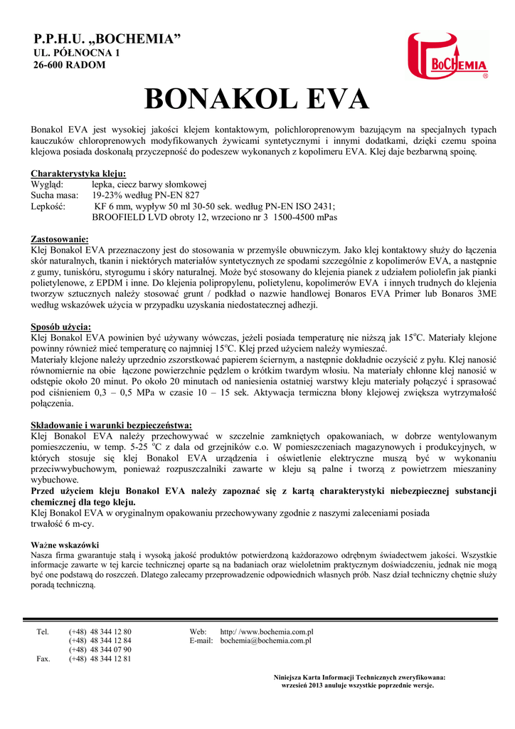 P.P.H.U. „BOCHEMIA” UL. PÓŁNOCNA 1 26-600 RADOM BONAKOL EVA Bonakol EVA jest wysokiej jakości klejem kontaktowym, polichloroprenowym bazującym na specjalnych typach kauczuków chloroprenowych modyfikowanych żywicami syntetycznymi i innymi dodatkami, dzięki czemu spoina klejowa posiada doskonałą przyczepność do podeszew wykonanych z kopolimeru EVA. Klej daje bezbarwną spoinę. Charakterystyka kleju: Wygląd: lepka, ciecz barwy słomkowej Sucha masa: 19-23% według PN-EN 827 Lepkość: KF 6 mm, wypływ 50 ml 30-50 sek. według PN-EN ISO 2431; BROOFIELD LVD obroty 12, wrzeciono nr 3 1500-4500 mPas Zastosowanie: Klej Bonakol EVA przeznaczony jest do stosowania w przemyśle obuwniczym. Jako klej kontaktowy służy do łączenia skór naturalnych, tkanin i niektórych materiałów syntetycznych ze spodami szczególnie z kopolimerów EVA, a następnie z gumy, tuniskóru, styrogumu i skóry naturalnej. Może być stosowany do klejenia pianek z udziałem poliolefin jak pianki polietylenowe, z EPDM i inne. Do klejenia polipropylenu, polietylenu, kopolimerów EVA i innych trudnych do klejenia tworzyw sztucznych należy stosować grunt / podkład o nazwie handlowej Bonaros EVA Primer lub Bonaros 3ME według wskazówek użycia w przypadku uzyskania niedostatecznej adhezji. Sposób użycia: Klej Bonakol EVA powinien być używany wówczas, jeżeli posiada temperaturę nie niższą jak 15oC. Materiały klejone powinny również mieć temperaturę co najmniej 15 oC. Klej przed użyciem należy wymieszać. Materiały klejone należy uprzednio zszorstkować papierem ściernym, a następnie dokładnie oczyścić z pyłu. Klej nanosić równomiernie na obie łączone powierzchnie pędzlem o krótkim twardym włosiu. Na materiały chłonne klej nanosić w odstępie około 20 minut. Po około 20 minutach od naniesienia ostatniej warstwy kleju materiały połączyć i sprasować pod ciśnieniem 0,3 – 0,5 MPa w czasie 10 – 15 sek. Aktywacja termiczna błony klejowej zwiększa wytrzymałość połączenia. Składowanie i warunki bezpieczeństwa: Klej Bonakol EVA należy przechowywać w szczelnie zamkniętych opakowaniach, w dobrze wentylowanym pomieszczeniu, w temp. 5-25 oC z dala od grzejników c.o. W pomieszczeniach magazynowych i produkcyjnych, w których stosuje się klej Bonakol EVA urządzenia i oświetlenie elektryczne muszą być w wykonaniu przeciwwybuchowym, ponieważ rozpuszczalniki zawarte w kleju są palne i tworzą z powietrzem mieszaniny wybuchowe. Przed użyciem kleju Bonakol EVA należy zapoznać się z kartą charakterystyki niebezpiecznej substancji chemicznej dla tego kleju. Klej Bonakol EVA w oryginalnym opakowaniu przechowywany zgodnie z naszymi zaleceniami posiada trwałość 6 m-cy. Ważne wskazówki Nasza firma gwarantuje stałą i wysoką jakość produktów potwierdzoną każdorazowo odrębnym świadectwem jakości. Wszystkie informacje zawarte w tej karcie technicznej oparte są na badaniach oraz wieloletnim praktycznym doświadczeniu, jednak nie mogą być one podstawą do roszczeń. Dlatego zalecamy przeprowadzenie odpowiednich własnych prób. Nasz dział techniczny chętnie służy poradą techniczną. Tel. Fax. (+48) (+48) (+48) (+48) 48 344 12 80 48 344 12 84 48 344 07 90 48 344 12 81 Web: http:/ /www.bochemia.com.pl E-mail: [email protected] Niniejsza Karta Informacji Technicznych zweryfikowana: wrzesień 2013 anuluje wszystkie poprzednie wersje.