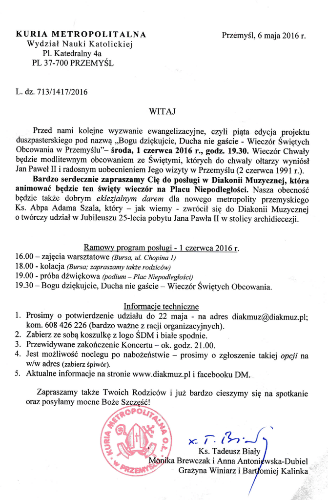 KURIA M E T R O P O L I T A L N A Wydzial Nauki Katolickiej PI. Katedralny 4a PL 37-700 PRZEMYSL Przemysl, 6 maja 2016 r. L.dz. 713/1417/2016 WITAJ Przed nami kolejne wyzwanie ewangelizacyjne, czyli pi^ta edycja projektu duszpasterskiego pod nazw^ „Bogu dzi^kujcie, Ducha nie gascie - Wieczor Swi^tych Obcowania w Przemyslu"- sroda, 1 czerwca 2016 r., godz. 19.30. Wieczor Chwaly bedzie modlitewnym obcowaniem ze Swi^tymi, ktorych do chwaly oltarzy wyniosi Jan Pawel II i radosnym uobecnieniem Jego wizyty w Przemyslu (2 czerwca 1991 r.). Bardzo serdecznie zapraszamy Ci^ do poslugi w Diakonii Muzycznej, ktora animowac bedzie ten swiety wieczor na Placu Niepodleglosci. Nasza obecnosc bedzie takze dobrym eklezjalnym darem dla nowego metropolity przemyskiego Ks. Abpa Adama Szala, ktory - jak wiemy - zwrocil si^ do Diakonii Muzycznej 0 tworczy udzial w Jubileuszu 25-lecia pobytu Jana Pawla II w stolicy archidiecezji. RamowY program poslugi - 1 czerwca 2016 r. 16.00 - zaj^cia warsztatowe (Bursa, ul Chopina I) 18.00 - kolacja (Bursa; zapraszamy takze rodzicow) 19.00 - proba dzwi^kowa (podium - Plac Niepodlegiosci) 19.30 - Bogu dzi^kujcie, Ducha nie gascie - Wieczor Swi^tych Obcowania. 1. 2. 3. 4. 5. Informacie techniczne Prosimy o potwierdzenie udzialu do 22 maja - na adres [email protected]; kom. 608 426 226 (bardzo wazne z racji organizacyjnych). Zabierz ze sob^ koszulk^ z logo SDM i biale spodnie. Przewidywane zakonczenie Koncertu - ok. godz. 21.00. Jest mozliwosc noclegu po nabozenstwie ~ prosimy o zgloszenie takiej opcji na w/w adres (zabierz spiwor). Aktualne informacje na stronie www.diakmuz.pl i facebooku DM. Zapraszamy takze Twoich Rodzicow i juz bardzo cieszymy si^ na spotkanie oraz posylamy mocne Boze Szc^gsc! Ks. Tadeusz Bialy / Monika Brewczak i Anna Antonirwska-Dubiel Grazyna Winiarz i BarU'omiej K a l i n k a ^