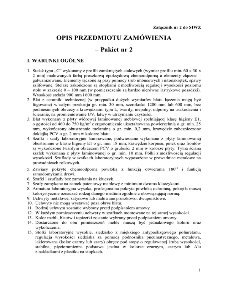 Załącznik nr 2 do SIWZ OPIS PRZEDMIOTU ZAMÓWIENIA – Pakiet nr 2 I. WARUNKI OGÓLNE 1. Stelaż typu „C” wykonany z profili zamkniętych stalowych (wymiar profilu min. 60 x 30 x 2 mm) malowanych farbą proszkową epoksydową chemoodporną a elementy złączne – galwanizowane. Elementy łączone są przy pomocy śrub imbusowych i nitonakrętek, spawy szlifowane. Stelaże zakończone są stopkami z możliwością regulacji wysokości poziomu stołu w zakresie 0 – 100 mm (w pomieszczeniu są bardzo nierówne lastrykowe posadzki). Wysokość stelaża 900 mm i 600 mm. 2. Blat z ceramiki technicznej (w przypadku dużych wymiarów blatu łączenia mogą być fugowane) w całym przekroju gr. min. 30 mm, szerokości 1200 mm lub 600 mm, bez podniesionych obrzeży z krawędziami typu L, twardy, niepalny, odporny na uszkodzenia i ścieranie, na promieniowanie UV, łatwy w utrzymaniu czystości. 3. Blat wykonany z płyty wiórowej laminowanej meblowej spełniającej klasę higieny E1, o gęstości od 460 do 750 kg/m3 z ergonomicznie ukształtowaną powierzchnią o gr. min. 25 mm, wykończony obustronnie melaminą o gr. min. 0,2 mm, krawędzie zabezpieczone doklejką PCV o gr. 2 mm w kolorze blatu. 4. Szafki i szafy laboratoryjne laminowane, podwieszane wykonane z płyty laminowanej obustronnie w klasie higieny E1 o gr. min. 18 mm, krawędzie korpusu, półek oraz frontów są wykończone twardym obrzeżem PCV o grubości 2 mm w kolorze płyty. Tylna ściana szafek wykonana z płyty laminowanej o gr. min. 10 mm. Półki z możliwością regulacji wysokości. Szuflady w szafkach laboratoryjnych wyposażone w prowadnice metalowe na prowadnicach rolkowych. 5. Zawiasy pokryte chemoodporną powłoką z funkcją otwierania 180o i funkcją samodomykania drzwi. 6. Szafki i szuflady bez zamykania na kluczyk. 7. Szafy zamykane na zamek patentowy meblowy z minimum dwoma kluczykami. 8. Armatura laboratoryjna wysoka, profesjonalna pokryta powłoką ochronną, pokrętła muszą kolorystycznie oznaczać rodzaj danego medium zgodnie z obowiązującą normą. 9. Uchwyty metalowe, satynowe lub malowane proszkowo, dwupunktowe. 10. Uchwyty nie mogą wystawać poza obrys blatu. 11. Rodzaj uchwytu zostanie wybrany przed podpisaniem umowy. 12. W każdym pomieszczeniu uchwyty w szafkach montowane na tej samej wysokości. 13. Kolor mebli, blatów i tapicerki zostanie wybrany przed podpisaniem umowy. 14. Dostarczone do obu pomieszczeń meble muszą być jednakowego koloru oraz wykończenia. 15. Stołki laboratoryjne wysokie, siedzisko z miękkiego antypoślizgowego poliuretanu, regulacja wysokości siedziska za pomocą podnośnika pneumatycznego, metalowa, lakierowana (kolor czarny lub szary) obręcz pod stopy o regulowanej śrubą wysokości, stabilna, pięcioramienna podstawa jezdna w kolorze czarnym, szarym lub Alu z nakładkami z plastiku na stopkach. 1 16. Krzesła laboratoryjne, miękkie siedzisko i oparcie z antypoślizgowego poliuretanu, regulacja wysokości siedziska za pomocą podnośnika pneumatycznego, metalowa, stabilna, pięcioramienna podstawa jezdna w kolorze czarnym, szarym lub Alu z samohamowalnymi kółkami. Wszystkie wymiary mebli zostały podane w milimetrach. Meble - szerokość x głębokość x wysokość (mm) II. POMIESZCZENIA W CHŁODNI Pakownia 1 – 34,45 m2 1. Stół roboczy wyspowy 2400 x 1200, wys. 900 - szt. 1 Blat z ceramiki, obciążenie blatu ok. 300 kg, szer. 120 Stelaż typu „C”. 2. Stół roboczy przyścienny ze ściętym narożnikiem 3400, wys. 900 - szt. 1 Blat z ceramiki, szer. 600 Stelaż typu „C” Szafki z płyty laminowanej Wyposażenie: a) szafka podwieszana 600 narożna jednodrzwiowa z jedną półką – szt. 1 b) szafka podwieszana 600 z szufladą i jednodrzwiową szafką z jedną półką w szafce – szt. 1 c) szafka podwieszana 600 pod zlewozmywak jednokomorowy – szt. 1 d) miska zlewowa z ceramiki do wbudowania na szafkę szerokości 600 mm – szt. 1 e) wysoka bateria c/z woda jednokolumnowa, chemoodporna nablatowa – szt. 1 f) szafka podwieszana 800 dwudrzwiowa z jedną półką (dwie przestrzenie) – szt. 2. 3. Szafa ubraniowa dwudrzwiowa zamykana 800 x 600 x 1800-2000 z płyty laminowanej z drążkiem na wieszaki i półką u góry. Szafa wyposażona w 5 szt. drewnianych wieszaków. Na szafie nadstawka dwudrzwiowa z płyty laminowanej 800 x 600 x 600-650 z jedną półką – szt. 1. 4. Szafka wisząca dwudrzwiowa (na segregatory) z płyty laminowanej z jedną półką (dwie przestrzenie) 800 x 350-400 x 750-800 - szt. 2. 5. Szafka wisząca jednodrzwiowa (na segregatory) z płyty laminowanej z jedną półką 600 x 350-400 x 750-800 - szt. 2. 6. Stół roboczy przyścienny 1600, wys. 750 - szt. 1 Blat z płyty laminowanej, szer. 600 Stelaż typu „C” 2 Szafki z płyty laminowanej a) kontener przejezdny 600 na kółkach (podłoga z gresu) z czterema szufladami – szt. 1 b) półka na prowadnicach metalowych na klawiaturę i mysz, podwieszona od spodu blatu – szt. 1. 7. Szafka wisząca otwarta z płyty laminowanej na segregatory, 1000 x 350-400 x 350-400 szt. 1. 8. Stół roboczy wzmocniony, przyścienny pod wagę 1000 x 600, wys. 600 - szt. 1 Blat z ceramiki płytkowej, szer. 600 Stelaż typu „C”. 9. Stołki – szt. 4. 10. Krzesła – szt. 1. Pakownia 2 – 34,16 m2 1. Stół roboczy wyspowy 2400 x 1200, wys. 900 - szt. 1 Blat z ceramiki, obciążenie blatu ok. 300 kg, szer. 1200 Stelaż typu „C”. 2. Stół roboczy przyścienny 3600, wys. 900 - szt. 1 Blat z ceramiki, szer. 600 Stelaż typu „C” Szafki z płyty laminowanej Wyposażenie: a) szafka podwieszana 800 z szufladą i dwudrzwiowa szafka z jedną półką w szafce – szt. 1 b) szafka podwieszana 600 pod zlewozmywak jednokomorowy – szt. 1 c) miska zlewowa z ceramiki do wbudowania na szafkę o szerokości 600 mm – szt. 1 d) wysoka bateria c/z woda jednokolumnowa chemoodporna – szt. 1 e) szafka podwieszana 800 dwudrzwiowa z jedną półką (2 przestrzenie) – szt. 2. 3. S