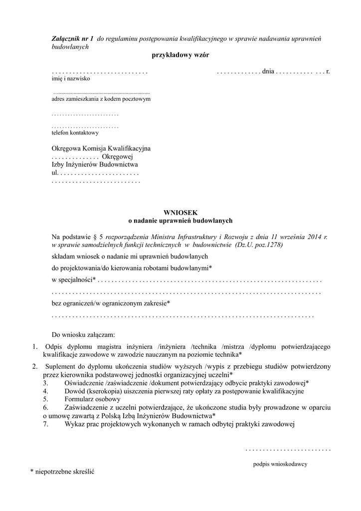 Załącznik nr 1 do regulaminu postępowania kwalifikacyjnego w sprawie nadawania uprawnień budowlanych przykładowy wzór ............................ . . . . . . . . . . . . . dnia . . . . . . . . . . . . . . r. imię i nazwisko …................................................................... adres zamieszkania z kodem pocztowym ......................... ......................... telefon kontaktowy Okręgowa Komisja Kwalifikacyjna . . . . . . . . . . . . . . Okręgowej Izby Inżynierów Budownictwa ul. . . . . . . . . . . . . . . . . . . . . . . . .......................... WNIOSEK o nadanie uprawnień budowlanych Na podstawie § 5 rozporządzenia Ministra Infrastruktury i Rozwoju z dnia 11 września 2014 r. w sprawie samodzielnych funkcji technicznych w budownictwie (Dz.U. poz.1278) składam wniosek o nadanie mi uprawnień budowlanych do projektowania/do kierowania robotami budowlanymi* w specjalności* . . . . . . . . . . . . . . . . . . . . . . . . . . . . . . . . . . . . . . . . . . . . . . . . . . . . . . . . . . . . . . . . . .............................................................................. bez ograniczeń/w ograniczonym zakresie* ............................................................................ Do wniosku załączam: 1. Odpis dyplomu magistra inżyniera /inżyniera /technika /mistrza /dyplomu potwierdzającego kwalifikacje zawodowe w zawodzie nauczanym na poziomie technika* 2. Suplement do dyplomu ukończenia studiów wyższych / wypis z przebiegu studiów potwierdzony przez kierownika podstawowej jednostki organizacyjnej uczelni* 3. Oświadczenie /zaświadczenie /dokument potwierdzający odbycie praktyki zawodowej* 4. Dowód (kserokopia) uiszczenia pierwszej raty opłaty za postępowanie kwalifikacyjne 5. Formularz osobowy 6. Zaświadczenie z uczelni potwierdzające, że ukończone studia były prowadzone w oparciu o umowę zawartą z Polską Izbą Inżynierów Budownictwa* 7. Wykaz prac projektowych wykonanych w ramach odbytej praktyki zawodowej ......................... podpis wnioskodawcy * niepotrzebne skreślić