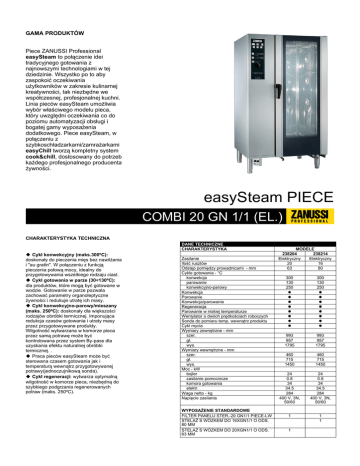 GAMA PRODUKTÓW Piece ZANUSSI Professional easySteam to połączenie idei tradycyjnego gotowania z najnowszymi technologiami w tej dziedzinie. Wszystko po to aby zaspokoić oczekiwania użytkowników w zakresie kulinarnej kreatywności, tak niezbędne we współczesnej, profesjonalnej kuchni. Linia pieców easySteam umożliwia wybór właściwego modelu pieca, który uwzględni oczekiwania co do poziomu automatyzacji obsługi i bogatej gamy wyposażenia dodatkowego. Piece easySteam, w połączeniu z szybkoschładzarkami/zamrażarkami easyChill tworzą kompletny system cook&chill, dostosowany do potrzeb każdego profesjonalnego producenta żywności. easySteam PIECE COMBI 20 GN 1/1 (EL.) ZANUSSI PROF E SSIONA L CHARAKTERYSTYKA TECHNICZNA DANE TECHNICZNE CHARAKTERYSTYKA � Cykl konwekcyjny (maks.300ºC): doskonały do pieczenia mięs bez nawilżania i "au gratin". W połączeniu z funkcją pieczenia połową mocy, idealny do przygotowywania wszelkiego rodzaju ciast. � Cykl gotowania w parze (30÷130ºC): dla produktów, które mogą być gotowane w wodzie. Gotowanie w parze pozwala zachować parametry organoleptyczne żywności i redukuje utratę ich masy. � Cykl konwekcyjno-parowy/mieszany (maks. 250ºC): doskonały dla większości rodzajów obróbki termicznej. Imponująca redukcja czasów gotowania i utraty masy przez przygotowywane produkty. Wilgotność wytwarzana w komorze pieca przez samą potrawę może być kontrolowana przez system By-pass dla uzyskania efektu naturalnej obróbki termicznej. . � Praca pieców easySteam może być sterowana czasem gotowania jak i temperaturą wewnątrz przygotowywanej potrawy(jednoczujnikową sonda). � Cykl regeneracji: wytwarza optymalną wilgotność w komorze pieca, niezbędną do szybkiego podgrzania regenerowanych potraw (maks. 250ºC). Zasilanie Ilość rusztów Odstęp pomiędzy prowadnicami - mm Cykle gotowania - °C konwekcja parowanie konwekcyjno-parowy Konwekcja Parowanie Konwekcja/parowanie Regeneracja Parowanie w niskiej temperaturze Wentylator o dwóch prędkościach roboczych Sonda do pomiaru temp. wewnątrz produktu Cykl mycia Wymiary zewnętrzne - mm szer. gł. wys. Wymiary wewnętrzne - mm szer. gł. wys. Moc - kW bojler zasilanie pomocnicze komora gotowania elektr. Waga netto - kg Napięcie zasilania WYPOSAŻENIE STANDARDOWE FILTER PANELU STER.-20 GN1/1 PIECE-LW STELAŻ S WÓZKEM DO 16XGN1/1 O ODS. 80 MM STELAŻ S WÓZKEM DO 20XGN1/1 O ODS. 63 MM MODELE 238204 238214 Elektryczny Elektryczny 20 16 63 80 300 130 250 l l l l l l l l 300 130 250 l l l l l l l l 993 957 1795 993 957 1795 460 715 1450 460 715 1450 24 0.8 34 34.5 284 400 V, 3N, 50/60 24 0.8 34 34.5 284 400 V, 3N, 50/60 1 1 1 1 COMBI 20 GN 1/1 (EL.) easySteam PIECE � Prędkości obrotowa wentylatora: pełna, 50% (do delikatnego pieczenia np. ciast). Po zastosowaniu funkcji "HOLD utility", dostępna jest trzecia prędkość pracy wentylatora. Wówczas wentylator działa impulsowo, co jest doskonałm rozwiązaniem przy długich i delikatnych cyklach pieczenia dużych kawałków mięsa. Funkcja "HOLD utility" jest również idealna do utrzymywania potraw we cieple, po zakończeniu cyklu gotowania. � Cykl gotowania z obniżoną mocą: do delikatnego przygotowania np. ciast. � Eco-delta: temperatura wewnątrz komory pieca jest wyższa niż wewnątrz produktu i odpowiednio do jej zmiany wzrasta. � Zawór wydechowy sterowany elektronicznie do eliminacji nadmiaru wilgotności w komorze. � System automatycznego mycia komory: 4 fabrycznie zaprogramowane cykle mycia komory pieca, do wyboru w zależności od potrzeb. System mycia jest wbudowany i nie wymaga montażu i demontażu jego elementów. � Szybkie schładzanie komory: szczególnie przydatne gdy następuje przejście do rodzaju gotowania, który wymaga zastosowania niższej temperatury niż ta panująca w komorze. Funkcja jest załączana automatycznie lub manualnie. � Automatyczny spust wody z bojlera wyposażony w automatyczny pomiar stopnia zakamienienia. � W standardzie funkcja HACCP: pozwala rejestrować parametry gotowania zgodnie z zleceniami H.A.C.C.P. (Hazard Analysis and Critical Control Points). Rejestracja i kontrola parametrów gotowania możliwa dzięki specjalnej drukarce (wyposażenie dodatkowe) lub bezpośrednio w komputerze PC (niezbędna jest sieć komputerowa PC). � By-pass technologia: wilgotość atmosfery wewnątrz komory pieca sterowana podczas cyklu mieszanym i regeneracji potraw. � Doskonała równomierność gotowania: nawiew świeżego powietrza do wnętrza pieca odbywa się przez bi-funkcjonalny wentylator, który od tyłu pieca wprowadza wstępnie ogrzane powietrze do komory, co pozwala uzyskać efekt równomiernego rozkładu temperatur w całej komorze. WYPOSAŻENIE OPCJONALNIE AKCESORIA *NOT TRANSLATED* *NOT TRANSLATED* *NOT TRANSLATED* *NOT TRANSLATED* *NOT TRANSLATED* *NOT TRANSLATED* *NOT TRANSLATED* *NOT TRANSLATED* *NOT TRANSLATED* *NOT TRANSLATED* 1 RUSZT DO KURCZAKÓW - GN1/2 (4SZT/RUSZ) 2 KOSZE FRYT. 2 RUSZTY GN 1/1 DO KURCZ.-8 SZT.NA RUSZT 2 SZT. RUSTY GN1/1 DO STELAŻA BANK. STELAŻ DLA 45 TAL.,90 MM-20GN1/1 DOLNA OSŁONA DRZWI DO 20 GN 1/1 FILTER PANELU STER.-20 GN1/1 PIECE-LW FILTR PRZECIWTŁUS. DO PIECA 20GN 1/1-2/1 GRIL. RUSZT, GN1/1 GRILL DO PIECA (ALUMINIUM) GN 1/1 HACCP ZAŁĄCZNIK DO PIECÓW OSŁONA TERMICZNA DO PIECÓW 20 GN 1/1 POJEM. GN 1/1 GŁ=20MM,NIE PRZYWIERAJĄCY POJEM. GN 1/1 GŁ=40MM,NIE PRZYWIERAJĄCY POJEM. GN 1/1 GŁ=60MM,NIE PRZYWIERAJĄCY POKROWIEC TERMOIZOL. NA STELAŻ 20XGN1/1 RUSZT DLA 8 KURCZAKI (1.2 KG) RUSZT GN1/1 DLA 8 JAJEK RUSZT GN1/1 DLA BAGIETKI SPRYSKIWACZ DO PIECA SPRYSKIWACZ NA ZWIJ. WĘŻU-20GN1/1 I 2/1 STELAŻ DLA 54 TAL.,74 MM-20GN1/1 STELAŻ S WÓZ. DO 20XGN1/1,NA BLA.400X600 STELAŻ S WÓZKEM DO 16XGN1/1 O ODS. 80 MM STELAŻ S WÓZKEM DO 20XGN1/1 O ODS. 63 MM TAC (400x600x20), PEŁNY, ALU TAC (400x600x20), PERF., ALU TAC,(400x600x38), PERF., ALU/SILICON ZMIĘKCZACZ AUTOMATICZNY ŻYWICA DO ZMIĘKCZACZA WODY � Ma