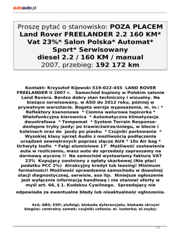 Proszę pytać o stanowisko: POZA PLACEM Land Rover FREELANDER 2.2 160 KM* Vat 23%* Salon Polska* Automat* Sport* Serwisowany diesel 2.2 / 160 KM / manual 2007, przebieg: 192 172 km Kontakt: Krzysztof Kijewski 519-022-455 LAND ROVER FREELANDER II 2007 r. Samochód kupiony w Polskim salonie Land Rovera. Bardzo dobry stan techniczny i wizualny. Na bieżąco serwisowany, w ASO do 2012 roku, później w prywatnym warsztacie. Bogata wersja wyposażenia, m. in.: * Reflektory ksenonowe * Ciemna welurowa tapicerka * Wielofunkcyjna kierownica * Automatyczna klimatyzacja dwustrefowa * Tempomat * System Terrain Responsedostępne tryby jazdy/ po trawie/żwirze/śniegu, w błocie i koleinach oraz do jazdy po piasku * Czujniki parkowania * Wysokiej klasy sprzęt Audio z możliwością podłączenia urządzeń zewnętrznych poprzez złącze AUX * 10x Air bag * Uchwyty Isofix * Felgi aluminiowe 17' Możliwość zostawienia auta w rozliczeniu, masz auto do sprzedaży zapraszamy na darmową wycenę !! Na samochód wystawiamy fakturę VAT 23% Kupujący zwolniony z opłaty skarbowej (Nie płaci podatku PCC 2%) Atrakcyjny kredyt lub leasing! Minimum formalności! Możliwość sprawdzenia samochodu w dowolnej stacji diagnostycznej, serwisie, aso itp. Niniejsze ogłoszenie jest wyłącznie informacją handlową i nie stanowi oferty w myśl art. 66, § 1. Kodeksu Cywilnego. Sprzedający nie odpowiada za ewentualne błędy lub nieaktualność ogłoszenia. 4x4; ABS; ESP; alufelgi; blokada dyferencjału; blokada skrzyni biegów; centralny zamek; czujniki cofania; el. lusterka; el.szyby; 1/2 immobiliser; kierownica wielofunkcyjna; komputer; ksenony; podgrzewane fotele; poduszka powietrzna; radio / CD; tempomat; welurowa tapicerka; wspomaganie kierownicy; światła przeciwmgłowe; elektryczne fotele; regulacja wysokości fotela; klimatronik Cena: 32 500 PLN netto Opiekun: Krzysztof Kijewski +48 519 022 455 Al. Krakowska 178, Punkt C 2/2