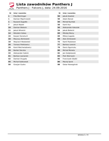 Lista zawodników Panthers J Panthers J - Falcons J, data: 24.09.2016 Nr Imię i nazwisko Nr Imię i nazwisko 1 Filip Blechinger 50 Jakub Kowkiel 1 Damian Majchrowski 50 Adam Banaś 1 Ryszard Żygadło 50 Michał Rychlak 7 Jakub Wąsiel 50 Kamil Kur 10 Damian Bielecki 50 Aleksander Kałuziak 11 Jakub Witwicki 54 Jakub Bielecki 14 Nikodem Kałwa 69 Mikołaj Marsy 15 Kacper Korzeluch 69 Miłosz Łagoda 16 Maurycy Borkowski 69 Alan Zimkowski 18 Wojciech Niedzielski 72 Kamil Radziwon 26 Tomasz Pietkiewicz 77 Bartosz Lewicki 29 Karol Niechwiadowicz 79 Davis Ogunruku 33 Bartek Sieczka 80 Michał Moneta 33 Aleksander Galicki 82 Jan Gołębiewski 41 Bartosz Leonarski 83 Piotr Biernacki 42 Damian Drygała 85 Franciszek Gładki 45 Michał Sobkowiak 86 Maciej Sprot 50 Gracjan Gudra 88 Oskar Nowogórski strona 1 / 4 Lista zawodników Panthers J Panthers J - Falcons J, data: 24.09.2016 Starterzy ATAK LT Starterzy OBRONA LE LG 54 Jakub Bielecki DT C 50 Kamil Kur RE RG 72 Kamil Radziwon LOLB RT ILB QB 11 Jakub Witwicki ROLB WR 7 Jakub Wąsiel CB 83 Piotr Biernacki RB 26 Tomasz Pietkiewicz CB 88 Oskar Nowogórski WR 80 Michał Moneta S 15 Kacper Korzeluch WR 85 Franciszek Gładki WR Pozycje SPECJALNE KR1 1 Filip Blechinger KR2 7 Jakub Wąsiel PR1 7 Jakub Wąsiel PR2 1 Filip Blechinger P 80 Michał Moneta K 80 Michał Moneta H 7 Jakub Wąsiel LS 50 Kamil Kur strona 2 / 4 Lista zawodników Falcons J Panthers J - Falcons J, data: 24.09.2016 Nr Imię i nazwisko Nr Imię i nazwisko 1 Mateusz Oleś 47 Wawrzyniec Piecha 12 Michał Gorczycki 49 Kacper Puczka 17 Bartosz Olczak 50 Damian Pieczka 18 Brzuchacz Kacper 55 Marek Syposz 20 Olaf Skutela 58 Rafał Papkala 27 Gabriel Kamiński 65 Beniamin Stępień 31 Eryk Wala 66 Patryk Krynicki 39 Mateusz Idczak 69 Daniel Siołek 41 Maciej Czeczukiewicz 72 Oskar Płachta 42 Patryk Myalski 77 Kevin Jabłoński 43 Grzegorz Sikorski 84 Marcin Pieczka 44 Adrian Marciniak 86 Grzegorz Grabowy 45 Kacper Saks 98 Miłosz Kozieł strona 3 / 4 Lista zawodników Falcons J Panthers J - Falcons J, data: 24.09.2016 Starterzy ATAK LT Starterzy OBRONA LE LG 66 Patryk Krynicki DT C 72 Oskar Płachta RE RG 98 Miłosz Kozieł LOLB RT ILB QB 65 Beniamin Stępień ROLB RB 12 Michał Gorczycki CB WR 18 Brzuchacz Kacper CB TE 39 Mateusz Idczak S WR 58 Rafał Papkala 98 Miłosz Kozieł 1 Mateusz Oleś WR Pozycje SPECJALNE KR1 77 Kevin Jabłoński KR2 84 Marcin Pieczka PR1 72 Oskar Płachta PR2 17 Bartosz Olczak P 42 Patryk Myalski K 58 Rafał Papkala H 1 Mateusz Oleś LS 72 Oskar Płachta strona 4 / 4