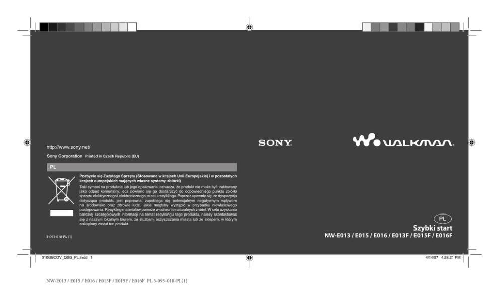 PL Pozbycie się Zużytego Sprzętu (Stosowane w krajach Unii Europejskiej i w pozostałych krajach europejskich mających własne systemy zbiórki) Taki symbol na produkcie lub jego opakowaniu oznacza, że produkt nie może być traktowany jako odpad komunalny, lecz powinno się go dostarczyć do odpowiedniego punktu zbiórki sprzętu elektrycznego i elektronicznego, w celu recyklingu. Poprzez upewnię się, że dyspozycja dotycząca produktu jest poprawna, zapobiega się potencjalnym negatywnym wpływom na środowisko oraz zdrowie ludzi, jakie mogłyby wystąpić w przypadku niewłaściwego postępowania. Recykling materiałów pomoże w ochronie naturalnych źródeł. W celu uzyskania bardziej szczegółowych informacji na temat recyklingu tego produktu, należy skontaktować się z naszym lokalnym biurem, ze służbami oczyszczania miasta lub ze sklepem, w którym zakupiony został ten produkt. 3-093-018-PL (1) 010GBCOV_QSG_PL.indd 1 NW-E013 / E015 / E016 / E013F / E015F / E016F PL.3-093-018-PL(1) PL Szybki start NW-E013 / E015 / E016 / E013F / E015F / E016F 4/14/07 4:53:21 PM Spis Informacja o instrukcji ˎ Posługiwanie się odtwarzaczem opisano w niniejszej instrukcji „Szybki start”, w „Instrukcji obsługi” (w pliku PDF) oraz w pomocy elektronicznej do programu SonicStage (dostępnej z menu „Help” programu SonicStage). – Szybki start: zawiera opis podstawowych funkcji odtwarzacza, między innymi importowania, przesyłania i odtwarzania utworów muzycznych. – Instrukcja obsługi: zawiera opis zaawansowanych funkcji odtwarzacza i rozwiązania ewentualnych problemów. – Pomoc do programu SonicStage: zawiera informacje o posługiwaniu się programem SonicStage. – Rozwiązywanie problemów: Opis objawów, przyczyn i rozwiązań problemów z odtwarzaczem. Poznawanie zaawansowanych funkcji odtwarzacza ˎ Zapoznaj się z Instrukcją obsługi (w pliku PDF). Aby wyświetlić Instrukcję obsługi: – Kliknij kolejno na wariantach [Start] – [Wszystkie programy] – [SonicStage] – [NW-E010 Series Operation Guide]. – W komputerze musi być zainstalowany program Adobe Acrobat Reader 5.0 lub nowszy albo Adobe Reader.Program Adobe Reader można za darmo pobrać z Internetu. Najświeższe informacje W przypadku pytań lub problemów związanych z odtwarzaczem, prosimy o odwiedzanie następujących stron www: Klienci z USA: http://www.sony.com/walkmansupport Klienci z Kanady: http://www.sony.ca/ElectronicsSupport/ Klienci z Europy: http://support.sony-europe.com/DNA Klienci z Ameryki Łacińskiej: http://www.sony-latin.com/pa/info/ Klienci z innych krajów i regionów: http://www.css.ap.sony.com Nabywcy modeli przeznaczonych dla krajów zamorskich: http://www.sony.co.jp/overseas/ support/ 010GB-QSG_PL.indd 2 NW-E013 / E015 / E016 / E013F / E015F / E016F PL.3-093-018-PL(1) 4/14/07 4:49:31 PM Wpro Czyn D Ł In Impo Przes Odtw W K Elem Infor Słuch (tylk Zalec Spis treści Instrukcji dostępnej mi wiązania ogramem Wprowadzenie .............................................................6 Czynności wstępne ......................................................8 Dostarczane wyposażenie................................................................................................ 8 Ładowanie akumulatora .................................................................................................... 9 Instalacja oprogramowania SonicStage ............................................................... 10 Importowanie muzyki .............................................. 12 ów Przesyłanie muzyki................................................... 14 i: age] – nowszy dzanie Odtwarzanie muzyki ................................................ 16 Włączanie i wyłączanie odtwarzacza ...................................................................... 17 Kasowanie utworów ......................................................................................................... 17 Elementy ................................................................... 18 Informacja o menu HOME ........................................ 22 Słuchanie radia UKF (tylko NW-E013F/E015F/E016F) ...............................................24 Zalecenia eksploatacyjne ........................................ 27 erseas/ 3 010GB-QSG_PL.indd 3 4/14/07 4:49:32 PM NW-E013 / E015 / E016 / E013F / E015F / E016F PL.3-093-018-PL(1) Uwaga dla klientów z krajów, w których obowiązują Dyrektywy UE Zgodnie z dyrektywą UE dotyczącą bezpieczeństwa produktu, zgodności elektromagnetycznej oraz emisji radiowej, producentem tego produktu jest Sony Corporation, 1-7-1 Konan, Minato-ku, Tokio, Japonia. Przedstawicielem producenta w Unii Europejskiej upoważnionym do dokonania i potwierdzenia oceny zgodności z wymaganiami zasadniczymi jest Sony Deutschland GmbH, Hedelfinger Strasse 61, 70327 Stuttgart, Niemcy. Nadzór nad dystrybucją na terytorium Rzeczypospolitej Polskiej sprawuje Sony Poland, 00-876 Warszawa, ul. Ogrodowa 58. W sprawach serwisowych i gwarancyjnych należy kontaktować się z podmiotami, których adresy podano w osobnych dokumentach gwarancyjnych lub serwisowych, albo z najbliższym sprzedawcą produktów Sony. Uwagi dla użytkowników Ładunki sta ˎ Nagraną muzykę można wykorzystywać tylko do celów prywatnych. Wykorzystanie muzyki do innych celów wymaga zgody posiadaczy praw autorskich. ˎ Sony nie będzie ponosić odpowiedzialności za niepełne nagranie / pobranie muzyki wynikające z problemów z odtwarzaczem lub komputerem. ˎ Języki, które można będzie wyświetlić w dostarczonym oprogramowaniu, zależą od systemu operacyjnego zainstalowanego w komputerze. Dla uzyskania lepszych wyników należy się upewnić, że zainstalowany system operacyjny obsługuje języki, które mają być wyświetlane. – Nie gwarantuje się możliwości prawidłowego wyświetlenia w programie SonicStage każdego języka. – Nie można wyświetlać znaków utworzonych przez użytkownika 