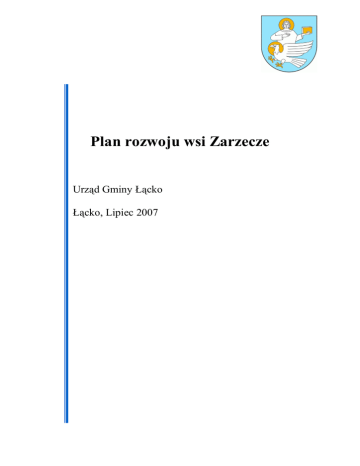 Plan rozwoju wsi Zarzecze Urząd Gminy Łącko Łącko, Lipiec 2007 Plan rozwoju wsi Zarzecze Spis treści 1. CHARAKTERYSTYKA OBECNEJ SYTUACJI...................................................................................5 1.1. PODSTAWOWE INFORMACJE .................................................................................................................5 1.1.1. Lokalizacja..................................................................................................................................5 1.1.2. Historia Zarzecza........................................................................................................................6 1.1.3. Charakterystyka Gminy Łącko oraz wsi Zarzecze ......................................................................7 Demografia ..................................................................................................................................................7 Bezrobocie....................................................................................................................................................7 Rolnictwo i Gospodarka...............................................................................................................................9 Infrastruktura na terenie wsi Zarzecze.......................................................................................................10 Atrakcyjność turystyczna ............................................................................................................................10 Dziedzictwo kulturowe ........................................................................................................................................... 10 Walory przyrodniczo krajobrazowe........................................................................................................................ 11 Kultura.................................................................................................................................................................... 11 Zabytki.................................................................................................................................................................... 12 Sport ....................................................................................................................................................................... 12 Turystyka ................................................................................................................................................................ 13 1.1.4. 2. Identyfikacja występujących problemów...................................................................................13 ANALIZA ZASOBÓW WSI ZARZECZE ............................................................................................14 2.1. INWENTARYZACJA ZASOBÓW WSI ZARZECZE SŁUśĄCA UJĘCIU STANU RZECZYWISTEGO ...................16 3. OCENA MOCNYCH I SŁABYCH STRON WSI ZARZECZE - ANALIZA SWOT........................18 4. KOMPLEMENTARNOŚĆ Z PROGRAMAMI / DZIAŁANIAMI/ DOKUMENTAMI STRATEGICZNYMI DOTYCZĄCYMI ROZWOJU WSI I REGIONU...................................................21 4.1. ZGODNOŚĆ Z NARODOWYM PLANEM ROZWOJU.................................................................................21 4.2. ZGODNOŚĆ Z ZAŁOśENIAMI DO KRAJOWEGO PROGRAMU ROZWOJU WSI ..........................................21 4.3. ZGODNOŚĆ Z PROGRAMEM AKTYWACJI OBSZARÓW WIEJSKICH WOJEWÓDZTWO MAŁOPOLSKIE 2000- 2005 ……………………………………………………………………………………………………….22 4.4. ZGODNOŚĆ ZE STRATEGIĄ ROZWOJU WOJEWÓDZTWA MAŁOPOLSKIEGO ..........................................22 4.5. ZGODNOŚĆ ZE STRATEGIĄ ROZWOJU WOJEWÓDZTWA MAŁOPOLSKIEGO NA LATA 2007-2013 .........23 4.6. ZGODNOŚĆ ZE STRATEGIĄ ROZWOJU POWIATU NOWOSĄDECKIEGO ..................................................24 4.7. ZGODNOŚĆ Z PLANEM ROZWOJU LOKALNEGO GMINY ŁĄCKO ..........................................................24 4.8. ZGODNOŚĆ ZE STRATEGIĄ ROZWOJU TURYSTYCZNEGO, ROLNICZEGO I GOSPODARCZEGO GMINY ŁĄCKO………………………………………………………………………………………………………...25 4.9. ZGODNOŚĆ ZE ZINTEGROWANYM PROGRAMEM OPERACYJNYM ROZWOJU REGIONALNEGO .............25 4.10. ZGODNOŚĆ Z PLANEM ZAGOSPODAROWANIE PRZESTRZENNEGO WOJEWÓDZTWA MAŁOPOLSKIEGO 26 4.11. ZGODNOŚĆ Z SEKTOROWYM PROGRAMEM OPERACYJNYM RESTRUKTURYZACJA I MODERNIZACJA SEKTORA śYWNOŚCIOWEGO I ROZWÓJ OBSZARÓW WIEJSKICH ........................................................................26 4.12. 5. PODSUMOWANIE ................................................................................................................................27 ZAŁOśENIA PLANU ROZWOJU WSI ZARZECZE ........................................................................28 2 Plan rozwoju wsi Zarzecze 6. KIERUNKI ROZWOJU MIEJSCOWOŚCI ZARZECZE - CELE STRATEGICZNE ...................29 7. KIERUNKI ROZWOJU MIEJSCOWOŚCI ZARZECZE - CELE OPERACYJNE ........................30 8. KIERUNKI ROZWOJU MIEJSCOWOŚCI ZARZECZE - ZADANIA REALIZACYJNE ............32 9. KATALOG ZADAŃ REALIZACYJNYCH..........................................................................................33 10. OCZEKIWANE REZULTATY PLANU ROZWOJU WSI ZARZECZE ..........................................36 11. SYSTEM WDRAśANIA, SPOSOBY MONITOROWANIA, OCENY I KOMUNIKACJI SPOŁECZNEJ ..................................................................................................................................................37 11.1. SYSTEM MONITOROWANIA PLANU ROZWOJU WSI ZARZECZE ................................................................37 11.2. SPOSÓB ZARZĄDZANIA PLANEM ROZWOJU WSI ..................................................................................37 12. WYKORZYSTANE MATERIAŁY ...................