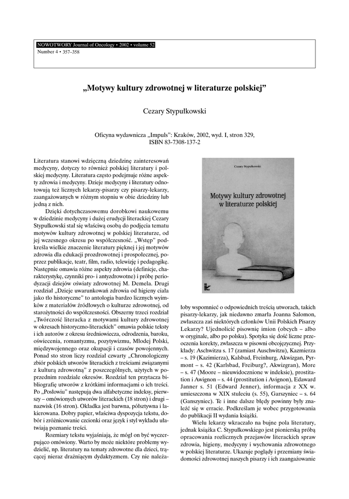 NOWOTWORY Journal of Oncology • 2002 • volume 52 Number 4 • 357–358 „Motywy kultury zdrowotnej w literaturze polskiej” Cezary Stypu∏kowski Oficyna wydawnicza „Impuls”: Kraków, 2002, wyd. I, stron 329, ISBN 83-7308-137-2 Literatura stanowi wdzi´cznà dziedzin´ zainteresowaƒ medycyny, dotyczy to równie˝ polskiej literatury i polskiej medycyny. Literatura cz´sto podejmuje ró˝ne aspekty zdrowia i medycyny. Dzieje medycyny i literatury odnotowujà te˝ licznych lekarzy-pisarzy czy pisarzy-lekarzy, zaanga˝owanych w ró˝nym stopniu w obie dziedziny lub jednà z nich. Dzi´ki dotychczasowemu dorobkowi naukowemu w dziedzinie medycyny i du˝ej erudycji literackiej Cezary Stypu∏kowski sta∏ si´ w∏aÊciwà osobà do podj´cia tematu motywów kultury zdrowotnej w polskiej literaturze, od jej wczesnego okresu po wspó∏czesnoÊç. „Wst´p” podkreÊla wielkie znaczenie literatury pi´knej i jej motywów zdrowia dla edukacji prozdrowotnej i prospo∏ecznej, poprzez publikacje, teatr, film, radio, telewizj´ i pedagogik´. Nast´pnie omawia ró˝ne aspekty zdrowia (definicje, charakterystyk´, czynniki pro- i antyzdrowotne) i prób´ periodyzacji dziejów oÊwiaty zdrowotnej M. Demela. Drugi rozdzia∏ „Dzieje uwarunkowaƒ zdrowia od higieny cia∏a jako t∏o historyczne” to antologia bardzo licznych wyimków z materia∏ów êród∏owych o kulturze zdrowotnej, od staro˝ytnoÊci do wspó∏czesnoÊci. Obszerny trzeci rozdzia∏ „TwórczoÊç literacka z motywami kultury zdrowotnej w okresach historyczno-literackich” omawia polskie teksty i ich autorów z okresu Êredniowiecza, odrodzenia, baroku, oÊwiecenia, romantyzmu, pozytywizmu, M∏odej Polski, mi´dzywojennego oraz okupacji i czasów powojennych. Ponad sto stron liczy rozdzia∏ czwarty „Chronologiczny zbiór polskich utworów literackich z treÊciami zwiàzanymi z kulturà zdrowotnà” z poszczególnych, u˝ytych w poprzednim rozdziale okresów. Rozdzia∏ ten przytacza bibliografi´ utworów z krótkimi informacjami o ich treÊci. Po „Pos∏owiu” nast´pujà dwa alfabetyczne indeksy, pierwszy – omówionych utworów literackich (18 stron) i drugi – nazwisk (16 stron). Ok∏adka jest barwna, pó∏sztywna i lakierowana. Dobry papier, w∏aÊciwa dyspozycja tekstu, dobór i zró˝nicowanie czcionki oraz j´zyk i styl wyk∏adu u∏atwiajà poznanie treÊci. Rozmiary tekstu wyjaÊniajà, ˝e móg∏ on byç wyczerpujàco omówiony. Warto by mo˝e niektóre problemy wydzieliç, np. literatury na tematy zdrowotne dla dzieci, tràcàcej nieraz dra˝niàcym dydaktyzmem. Czy nie nale˝a- ∏oby wspomnieç o odpowiednich treÊcià utworach, takich pisarzy-lekarzy, jak niedawno zmar∏a Joanna Salomon, zw∏aszcza zaÊ niektórych cz∏onków Unii Polskich Pisarzy Lekarzy? Ujednoliciç pisowni´ imion (obcych – albo w oryginale, albo po polsku). Spotyka si´ doÊç liczne przeoczenia korekty, zw∏aszcza w pisowni obcoj´zycznej. Przyk∏ady: Aschwitzu s. 17 (zamiast Auschwitzu), Kazmierza – s. 19 (Kazimierza), Kalsbad, Freinhurg, Akwizgan, Pyrmont – s. 42 (Karlsbad, Freiburg?, Akwizgran), More – s. 47 (Moore – nieuwidocznione w indeksie), prostitation i Awignon – s. 44 (prostitution i Avignon), Edaward Janner s. 51 (Edward Jenner), informacja z XX w. umieszczona w XIX stuleciu (s. 55), Garszyniec – s. 64 (Ganszyniec). Te i inne dalsze b∏´dy powinny by∏y znaleêç si´ w erracie. PodkreÊlam je wobec przygotowania do publikacji II wydania ksià˝ki. Wielu lekarzy wkracza∏o na bujne pola literatury, jednak ksià˝ka C. Stypu∏kowskiego jest pionierskà próbà opracowania rozlicznych przejawów literackich spraw zdrowia, higieny, medycyny i wychowania zdrowotnego w polskiej literaturze. Ukazuje poglàdy i przemiany ÊwiadomoÊci zdrowotnej naszych pisarzy i ich zaanga˝owanie 358 w problematyk´ zdrowotnà. Tekst i indeksy ksià˝ki otwierajà Êwietne mo˝liwoÊci dalszych medyczno-literackich badaƒ i opracowaƒ literaturoznawcom i medykom. Z ksià˝ki mogà równie˝ czerpaç wiedz´ historycy medycyny i literatury, a przyk∏ady i wzorce nasi pedagodzy i wychowawcy (zw∏aszcza poloniÊci). U∏atwi to te˝ dalsza monografia C. Stypu∏kowskiego „Wychowanie zdrowotne w nauczaniu przedmiotowym”, drukowana w tej samej oficynie. Ksià˝ki C. Stypu∏kowskiego mo˝na poleciç te˝ czytelnikom, którzy interesujà si´ zagadnieniami rozwoju poglàdów na zdrowie, zapobieganie i ochron´ Êrodowiska w polskiej literaturze. Prof. Henryk Gaertner Kraków Ksià˝k´ do recenzji przekaza∏ wydawca