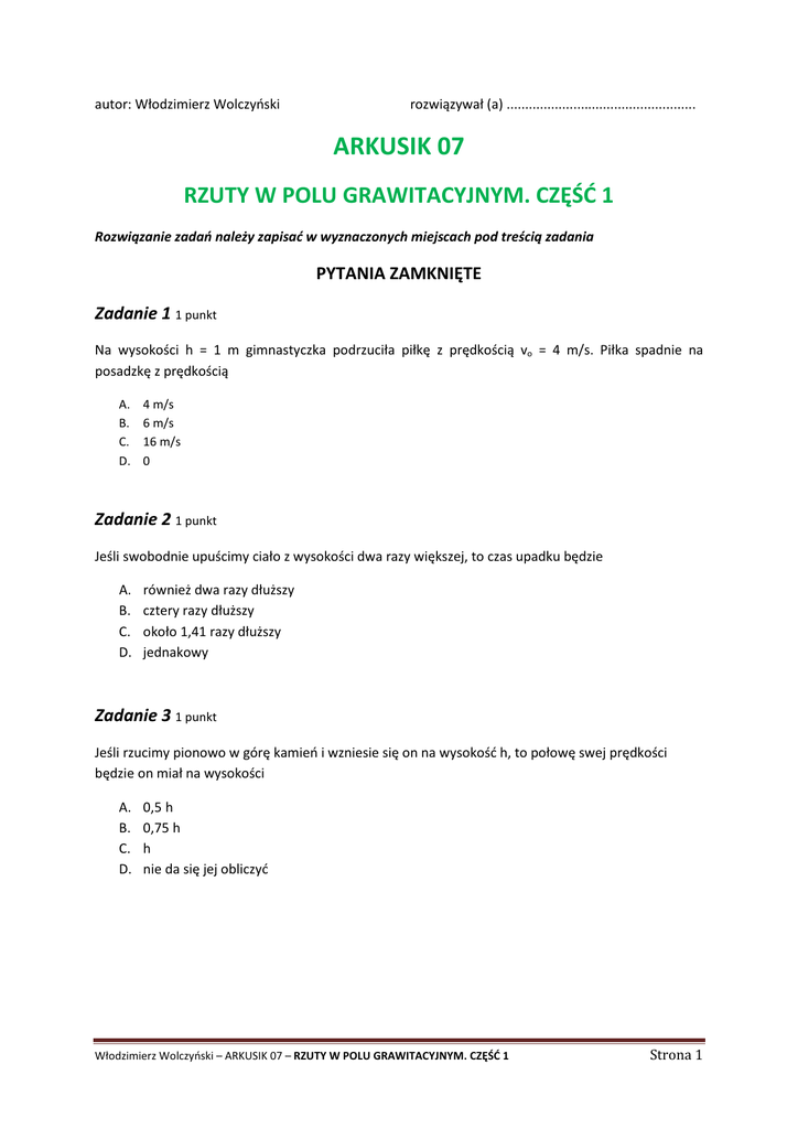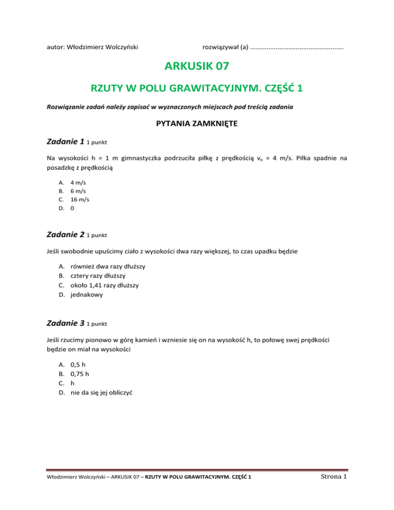 autor: Włodzimierz Wolczyński rozwiązywał (a) ................................................... ARKUSIK 07 RZUTY W POLU GRAWITACYJNYM. CZĘŚĆ 1 Rozwiązanie zadań należy zapisać w wyznaczonych miejscach pod treścią zadania PYTANIA ZAMKNIĘTE Zadanie 1 1 punkt Na wysokości h = 1 m gimnastyczka podrzuciła piłkę z prędkością vo = 4 m/s. Piłka spadnie na posadzkę z prędkością A. B. C. D. 4 m/s 6 m/s 16 m/s 0 Zadanie 2 1 punkt Jeśli swobodnie upuścimy ciało z wysokości dwa razy większej, to czas upadku będzie A. B. C. D. również dwa razy dłuższy cztery razy dłuższy około 1,41 razy dłuższy jednakowy Zadanie 3 1 punkt Jeśli rzucimy pionowo w górę kamień i wzniesie się on na wysokość h, to połowę swej prędkości będzie on miał na wysokości A. B. C. D. 0,5 h 0,75 h h nie da się jej obliczyć Włodzimierz Wolczyński – ARKUSIK 07 – RZUTY W POLU GRAWITACYJNYM. CZĘŚĆ 1 Strona 1 PYTANIA OTWARTE Zadanie 4 5 punktów Zaznacz krzyżykiem PRAWDA FAŁSZ Na Księżycu, z tej samej wysokości rzucono dwa kamienie, jeden w górę, drugi w dół. Oba spadły z tą samą prędkością. Na Ziemi, gdyby wykonać czynność zawartą w poprzednim zdaniu będzie bardzo podobnie, a dokładnie byłoby tak wówczas, gdyby nie było oporu powietrza. Również czasy lotu obu kamieni na Księżycu byłoby równe. Kamień rzucony pionowo w górę, jeśli pominąć opór powietrza, na wysokości równej połowie maksymalnej ma prędkość równą także połowie prędkości początkowej. Kamień rzucony pionowo w górę, jeśli pominąć opór powietrza, z prędkością początkową dwukrotnie większą, wzniesie się cztery razy wyżej Zadanie 5 8 punktów Na wysokości 10 m nad ziemią, rzucono pionowo w górę kamień, z prędkością 10 m/s. Opór powietrza pominąć. a. Wykaż, że ponad ziemię wzniesie się on na wysokość 15 m (2 pkt.) b. Po jakim czasie wzniesie się kamień na maksymalną wysokość? (2 pkt.) Włodzimierz Wolczyński – ARKUSIK 07 – RZUTY W POLU GRAWITACYJNYM. CZĘŚĆ 1 Strona 2 c. Po jakim czasie licząc od chwili wyrzutu kamień spadnie na ziemię? (2 pkt.) d. Z jaką prędkością kamień uderzy w ziemię? (2 pkt.) Zadanie 6 15 punktów Na wysokości h = 20 m oderwała się z dachu domu kropla wody. Po jednej sekundzie oderwała się druga kropla. W zadaniu pomiń opór powietrza. a. Przyjmij jako początek układu współrzędnych ziemię i napisz równania ruchu, czyli zależność współrzędnej położenia od czasu dla pierwszej i drugiej kropli (3 pkt.) dla pierwszej 1 pkt. dla drugiej 2 pkt. b. Wykaż, że w chwili gdy zaczyna spadać druga kropla, obie krople dzieli odległość 5 m (2 pkt.) Włodzimierz Wolczyński – ARKUSIK 07 – RZUTY W POLU GRAWITACYJNYM. CZĘŚĆ 1 Strona 3 c. Jakim ruchem poruszają się krople względem siebie? (1 pkt.) d. Po jakim czasie odległość kropel będzie równa 10 m? (3 pkt.) e. Po jakim czasie spadła na ziemię pierwsza kropla? (1 pkt.) f. Z jaką prędkością krople osiągną ziemię? (1 pkt.) Włodzimierz Wolczyński – ARKUSIK 07 – RZUTY W POLU GRAWITACYJNYM. CZĘŚĆ 1 Strona 4 g. Przedstaw zależności wysokości obu kropli od czasu na wykresie poniżej. By wykres był w miarę dokładny możesz posłużyć się tabelką. (4 pkt.) h[ m] 0 0,5 1,0 1,5 2,0 2,5 3,0 Ocena l. p. temat ZDOBYTYCH PKT. ZADANIA ZAMKNIĘTE MAX 3 4 Zaznacz krzyżykiem 5 5 Na wysokości 10 m 8 6 Na wysokości h = 20 m RAZEM ZADANIA OTWARTE RAZEM Włodzimierz Wolczyński – ARKUSIK 07 – RZUTY W POLU GRAWITACYJNYM. CZĘŚĆ 1 15 28 31 Strona 5 t[ s]