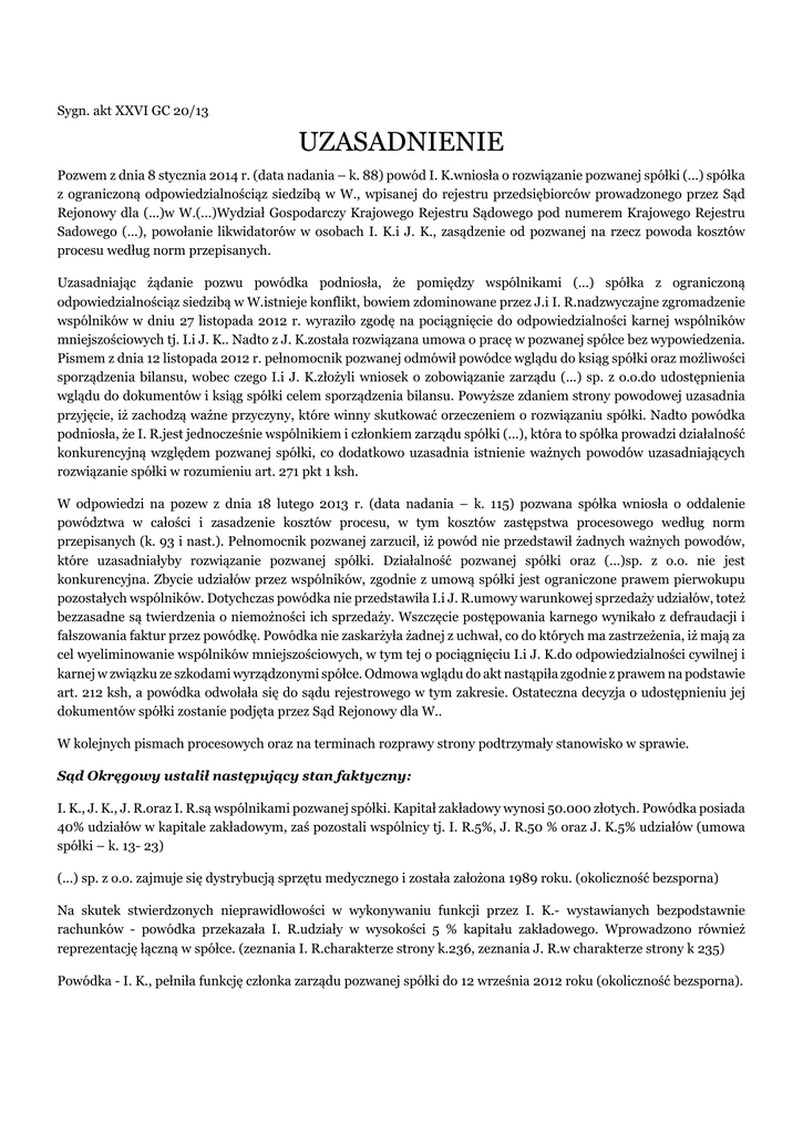 Sygn. akt XXVI GC 20/13 UZASADNIENIE Pozwem z dnia 8 stycznia 2014 r. (data nadania – k. 88) powód I. K.wniosła o rozwiązanie pozwanej spółki (...) spółka z ograniczoną odpowiedzialnościąz siedzibą w W., wpisanej do rejestru przedsiębiorców prowadzonego przez Sąd Rejonowy dla (...)w W.(...)Wydział Gospodarczy Krajowego Rejestru Sądowego pod numerem Krajowego Rejestru Sadowego (...), powołanie likwidatorów w osobach I. K.i J. K., zasądzenie od pozwanej na rzecz powoda kosztów procesu według norm przepisanych. Uzasadniając żądanie pozwu powódka podniosła, że pomiędzy wspólnikami (...) spółka z ograniczoną odpowiedzialnościąz siedzibą w W.istnieje konflikt, bowiem zdominowane przez J.i I. R.nadzwyczajne zgromadzenie wspólników w dniu 27 listopada 2012 r. wyraziło zgodę na pociągnięcie do odpowiedzialności karnej wspólników mniejszościowych tj. I.i J. K.. Nadto z J. K.została rozwiązana umowa o pracę w pozwanej spółce bez wypowiedzenia. Pismem z dnia 12 listopada 2012 r. pełnomocnik pozwanej odmówił powódce wglądu do ksiąg spółki oraz możliwości sporządzenia bilansu, wobec czego I.i J. K.złożyli wniosek o zobowiązanie zarządu (...) sp. z o.o.do udostępnienia wglądu do dokumentów i ksiąg spółki celem sporządzenia bilansu. Powyższe zdaniem strony powodowej uzasadnia przyjęcie, iż zachodzą ważne przyczyny, które winny skutkować orzeczeniem o rozwiązaniu spółki. Nadto powódka podniosła, że I. R.jest jednocześnie wspólnikiem i członkiem zarządu spółki (...), która to spółka prowadzi działalność konkurencyjną względem pozwanej spółki, co dodatkowo uzasadnia istnienie ważnych powodów uzasadniających rozwiązanie spółki w rozumieniu art. 271 pkt 1 ksh. W odpowiedzi na pozew z dnia 18 lutego 2013 r. (data nadania – k. 115) pozwana spółka wniosła o oddalenie powództwa w całości i zasadzenie kosztów procesu, w tym kosztów zastępstwa procesowego według norm przepisanych (k. 93 i nast.). Pełnomocnik pozwanej zarzucił, iż powód nie przedstawił żadnych ważnych powodów, które uzasadniałyby rozwiązanie pozwanej spółki. Działalność pozwanej spółki oraz (...)sp. z o.o. nie jest konkurencyjna. Zbycie udziałów przez wspólników, zgodnie z umową spółki jest ograniczone prawem pierwokupu pozostałych wspólników. Dotychczas powódka nie przedstawiła I.i J. R.umowy warunkowej sprzedaży udziałów, toteż bezzasadne są twierdzenia o niemożności ich sprzedaży. Wszczęcie postępowania karnego wynikało z defraudacji i fałszowania faktur przez powódkę. Powódka nie zaskarżyła żadnej z uchwał, co do których ma zastrzeżenia, iż mają za cel wyeliminowanie wspólników mniejszościowych, w tym tej o pociągnięciu I.i J. K.do odpowiedzialności cywilnej i karnej w związku ze szkodami wyrządzonymi spółce. Odmowa wglądu do akt nastąpiła zgodnie z prawem na podstawie art. 212 ksh, a powódka odwołała się do sądu rejestrowego w tym zakresie. Ostateczna decyzja o udostępnieniu jej dokumentów spółki zostanie podjęta przez Sąd Rejonowy dla W.. W kolejnych pismach procesowych oraz na terminach rozprawy strony podtrzymały stanowisko w sprawie. Sąd Okręgowy ustalił następujący stan faktyczny: I. K., J. K., J. R.oraz I. R.są wspólnikami pozwanej spółki. Kapitał zakładowy wynosi 50.000 złotych. Powódka posiada 40% udziałów w kapitale zakładowym, zaś pozostali wspólnicy tj. I. R.5%, J. R.50 % oraz J. K.5% udziałów (umowa spółki – k. 13- 23) (...) sp. z o.o. zajmuje się dystrybucją sprzętu medycznego i została założona 1989 roku. (okoliczność bezsporna) Na skutek stwierdzonych nieprawidłowości w wykonywaniu funkcji przez I. K.- wystawianych bezpodstawnie rachunków - powódka przekazała I. R.udziały w wysokości 5 % kapitału zakładowego. Wprowadzono również reprezentację łączną w spółce. (zeznania I. R.charakterze strony k.236, zeznania J. R.w charakterze strony k 235) Powódka - I. K., pełniła funkcję członka zarządu pozwanej spółki do 12 września 2012 roku (okoliczność bezsporna). Od września 2012 roku pomiędzy powódką i jej małżonkiem oraz pozostałymi wspólnikami istnieje konflikt (okoliczność bezsporna). Po rezygnacji z pełnienia funkcji członka zarządu przez I. K., zarówno z powódką jak i jej mężem została rozwiązana umowa o pracę w trybie art. 52 k.p. Nadzwyczajne zgromadzenie wspólników w dniu 27 listopada 2012 r. wyraziło zgodę na pociągnięcie do odpowiedzialności karnej wspólników mniejszościowych tj. I.i J. K.(uchwała walnego zgromadzenia wspólników - k. 27-32). Pismem z dnia 12 listopada 2012 r. zarząd odmówił powódce wglądu do ksiąg spółki (pismo z dnia 12 listopada 2013 r. – k. 43-44). I.i J. K.złożyli do sądu rejestrowego wniosek o zobowiązanie zarządu (...) sp. z o.o.do udostępnienia wglądu do dokumentów i ksiąg spółki celem sporządzenia bilansu (k. 38-39). I. R.jest wspólnikiem i członkiem zarządu spółki E. sp. z o.o. z siedzibą w W.. (wydruki ze stron internetowych – k. 51-59, wyciąg KRS spółki E. sp. z o.o. z siedzibą w W.– k. 69-75). (...) sp. z o.o.współpracowała ze spółką (...)sp. z o.o. od 2011 roku, również w okresie kiedy funkcję członka zarządu pełniła I.K.. Spółka (...) również zajmuje się dystrybucją sprzętu medycznego, lecz jest to sprzęt innych producentów niż dystrybuowany przez (...)(zeznania świadka S. K.k.233- 234.) Na zgromadzeniu wspólników pozwanej spółki z 21 sierpnia 2013 roku powódka głosowała przeciwko uchwale o niekontynuowaniu działalności przez spółkę i zgłosiła sprzeciwu do uchwały nr 8 (uchwała nr 8 k.200). Na tym samym zgromadzeniu wspólników powódka wstrzymała się od głosu odnośnie do uchwały o rozwiązaniu spółki – postanowieniu w stan likwidacji (uchwała nr (...) - okoliczność bezsporna) Za 2012 rok spółka (...) osiągnęła strat