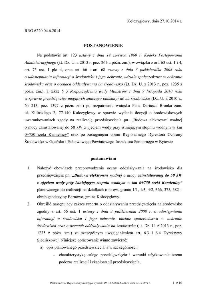 Kołczygłowy, dnia 27.10.2014 r. RRG.6220.04.6.2014 POSTANOWIENIE Na podstawie art. 123 ustawy z dnia 14 czerwca 1960 r. Kodeks Postępowania Administracyjnego (j.t. Dz. U. z 2013 r. poz. 267 z późn. zm.), w związku z art. 63 ust. 1 i 4, art. 75 ust. 1 pkt 4, oraz art. 66 i art. 68 ustawy z dnia 3 października 2008 roku o udostępnianiu informacji o środowisku i jego ochronie, udziale społeczeństwa w ochronie środowiska oraz o ocenach oddziaływania na środowisko (j.t. Dz. U. z 2013 r., poz. 1235 z późn. zm.), a także § 3 Rozporządzenia Rady Ministrów z dnia 9 listopada 2010 roku w sprawie przedsięwzięć mogących znacząco oddziaływać na środowisko (Dz. U. z 2010 r., Nr 213, poz. 1397 z późn. zm.) po rozpatrzeniu wniosku Pana Dariusza Bronka zam. ul. Kilińskiego 2, 77-140 Kołczygłowy w sprawie wydania decyzji o środowiskowych uwarunkowaniach zgody na realizację przedsięwzięcia pn. „Budowa elektrowni wodnej o mocy zainstalowanej do 50 kW z ujęciem wody przy istniejącym stopniu wodnym w km 0+750 rzeki Kamienicy” oraz po zasięgnięciu opinii Regionalnego Dyrektora Ochrony Środowiska w Gdańsku i Państwowego Powiatowego Inspektora Sanitarnego w Bytowie postanawiam 1. Nałożyć obowiązek przeprowadzenia oceny oddziaływania na środowisko dla przedsięwzięcia pn. „Budowa elektrowni wodnej o mocy zainstalowanej do 50 kW z ujęciem wody przy istniejącym stopniu wodnym w km 0+750 rzeki Kamienicy” planowanego do realizacji na działkach o nr ew. gruntu 1/1, 1/3, 4/2, 366, 375, 382 – obręb geodezyjny Barnowo, gmina Kołczygłowy. 2. Określić następujący zakres raportu o oddziaływaniu przedsięwzięcia na środowisko zgodny z art. 66 ust. 1 ustawy z dnia 3 października 2008 r. o udostępnianiu informacji o środowisku i jego ochronie, udziale społeczeństwa w ochronie środowiska oraz o ocenach oddziaływania na środowisko (j.t. Dz. U. z 2013 r., poz. 1235 z późn. zm.) ze szczególnym uwzględnieniem art. 6.3 i 6.4 Dyrektywy Siedliskowej. Niniejsze opracowanie winno zawierać: a) opis planowanego przedsięwzięcia, a w szczególności: charakterystykę całego przedsięwzięcia i warunki użytkowania terenu podczas realizacji i eksploatacji przedsięwzięcia, Postanowienie Wójta Gminy Kołczygłowy znak: RRG.6220.04.6.2014 z dnia 27.10.2014 r. 1 z 10 wskazania, które istniejące elementy zabudowy i w jaki sposób będą adaptowane w ramach realizacji przedsięwzięcia, główne cechy charakterystyczne procesów technologicznych, przewidywane rodzaje i ilości zanieczyszczeń, wynikających z realizacji i eksploatacji; b) opis elementów przyrodniczych środowiska objętych zakresem przewidywanego oddziaływania planowanego przedsięwzięcia na środowiska, w tym elementów środowiska objętych ochroną na podstawie ustawy z dnia 16 kwietnia 2004 r. o ochronie przyrody (j.t. Dz. U. z 2013 r., poz. 627 z późn. zm.), gatunków i siedlisk przyrodniczych z załącznika I i II Dyrektywy Rady 92/43/EWG oraz gatunków ptaków z załącznika I Dyrektywy Rady 2009/147/WE (wraz z waloryzacją przyrodniczą terenu inwestycji) w tym m.in.: objętych zakresem przewidywanego bezpośredniego jak i pośredniego oddziaływania planowanego przedsięwzięcia na obszar Natura 2000, w tym opis elementów przyrodniczych warunkujących właściwy stan ochrony siedlisk przyrodniczych i gatunków stanowiących przedmiot ochrony w w/w obszarach Natura 2000, opis siedlisk przyrodniczych z załącznika I Dyrektywy Rady 92/43/EWG, dokładną charakterystykę szaty roślinnej i siedlisk przyrodniczych, skład gatunkowy flory i fauny występujących w obszarze przeznaczonym pod planowaną inwestycje i na terenach bezpośrednio sąsiadujących z planowanym przedsięwzięciem. Informację należy również przedstawić na załącznikach kartograficznych, rozmieszczenie przestrzenne siedlisk przyrodniczych, gatunków roślin i zwierząt oraz ptaków objętych ochroną na podstawie przepisów ustawy o ochronie przyrody, załączniki I i II Dyrektywy Rady 92/43/EWG oraz załącznika I Dyrektywy Rady 2009/147/WE, wraz z ich analizą ilościową i jakościową na terenie objętym inwestycją i na obszarze objętym zasięgiem jej oddziaływania; c) charakterystykę oddziaływania przedsięwzięcia na środowisko, w szczególności na siedliska przyrodnicze oraz gatunki roślin i zwierząt podlegające ochronie w granicach w/w obszarów Natura 2000; Postanowienie Wójta Gminy Kołczygłowy znak: RRG.6220.04.6.2014 z dnia 27.10.2014 r. 2 z 10 d) ocenę wpływu bezpośredniego i pośredniego na cele ochrony Parku Krajobrazowego Dolina Słupi; e) opis realizowanych wariantów, w tym: wariantu proponowanego przez wnioskodawcę oraz racjonalnego wariantu alternatywnego, wariantu najkorzystniejszego dla przedmiotu ochrony w w/w obszarze Natura 2000 wraz z uzasadnieniem ich wyboru; f) uzasadnienie proponowanego przez wnioskodawcę wariantu, ze wskazaniem jego oddziaływania na przedmiotu ochrony obszarów Natura 2000, w tym w szczególności: na integralność obszaru i spójność sieci Natura 2000 jako całości, na gatunki i siedliska gatunków będących przedmiotem ochrony na obszarze Natura 2000; g) określenie przewidywanego oddziaływania na obszar Natura 2000 analizowanych wariantów; h) skumulowane oddziaływanie planowanego zamierzenia ze znajdującymi się w sąsiedztwie inwestycjami o takiej samej bądź podobnej działalności na środowisko, w tym na gatunki objęte ochroną oraz siedliska przyrodnicze oraz gatunki roślin i zwierząt stanowiące przedmioty ochrony w obszarze Natura 2000 Dolina Słupi PLH220032 oraz gatunki ptaków stanowiące przedmiot ochrony w obszarze Natura 2000 Dolina Słupi PLB 220002; i) opis przewidywanych działań mających na celu zapobieganie i ograniczanie negatywnych oddziaływań przedsięwzięcia na środowisko w tym na przedmiot ochrony w obszarach Natura 2000; j) przedstawienie zagadnień w formie kartograficznej w skali odpowiada