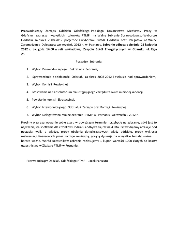 Przewodniczący Zarządu Oddziału Gdańskiego Polskiego Towarzystwa Medycyny Pracy w Gdańsku zaprasza wszystkich członków PTMP na Walne Zebranie Sprawozdawczo-Wyborcze Oddziału za okres 2008-2012 połączone z wyborami władz Oddziału oraz Delegatów na Walne Zgromadzenie Delegatów we wrześniu 2012 r. w Poznaniu. Zebranie odbędzie się dnia 26 kwietnia 2012 r. ok. godz. 14.00 w sali wykładowej Zespołu Szkół Energetycznych w Gdańsku ul. Reja 25. Porządek Zebrania: 1. Wybór Przewodniczącego i Sekretarza Zebrania, 2. Sprawozdanie z działalności Oddziału za okres 2008-2012 i dyskusja nad sprawozdaniem, 3. Wybór Komisji Rewizyjnej, 4. Głosowanie nad absolutorium dla ustępującego Zarządu za okres minionej kadencji, 5. Powołanie Komisji Skrutacyjnej, 6. Wybór Przewodniczącego Oddziału i Zarządu oraz Komisji Rewizyjnej, 7. Wybór Delegatów na Walne Zebranie PTMP w Poznaniu we wrześniu 2012 r. Prosimy o zarezerwowanie sobie czasu w powyższym terminie i przybycie na zebranie, gdyż jest to najważniejsze spotkanie dla członków Oddziału i odbywa się raz na 4 lata. Przewidujemy atrakcje pod postacią: walki o władzę, próby obalenia dotychczasowych władz oddziału, próby wykrycia malwersacji finansowych przez komisje rewizyjną, gorącą dyskusję na wszystkie tematy ważne i … bardzo ważne. Wśród uczestników zebrania rozlosujemy 1 kupon wartości 1000 złotych na koszty uczestnictwa w Zjeździe PTMP w Poznaniu. Przewodniczący Oddziału Gdańskiego PTMP - Jacek Parszuto