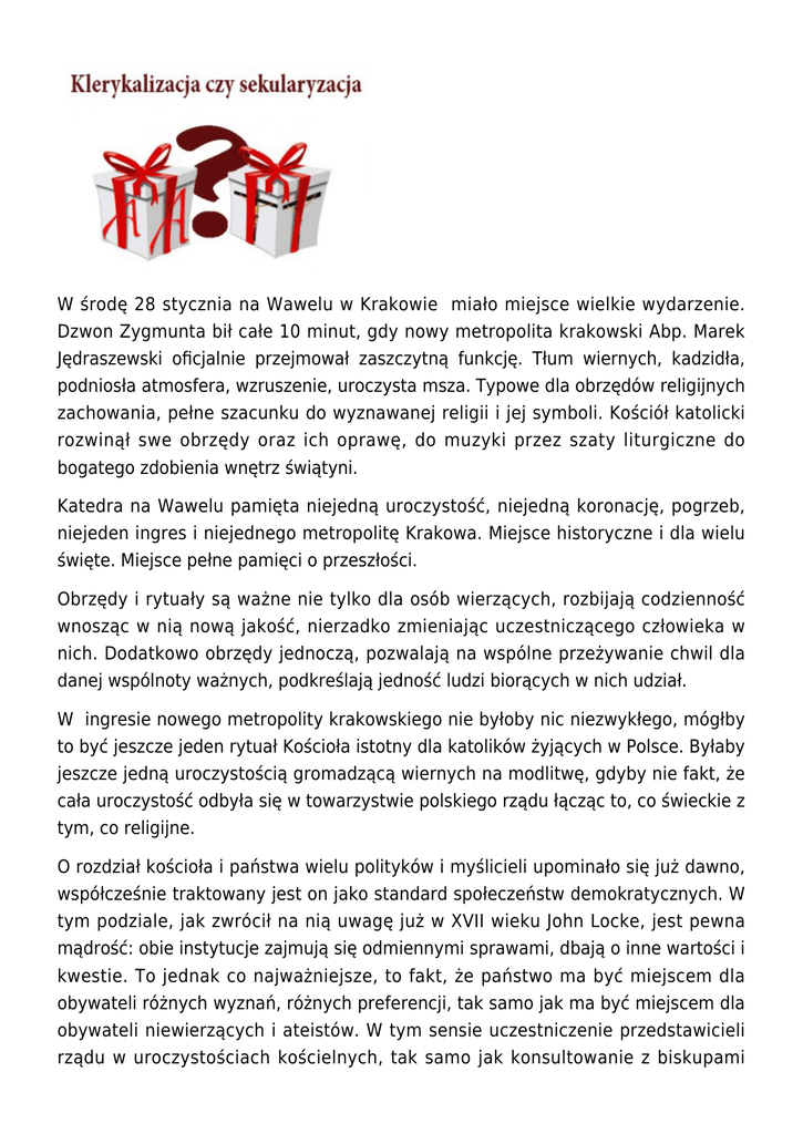 W środę 28 stycznia na Wawelu w Krakowie miało miejsce wielkie wydarzenie. Dzwon Zygmunta bił całe 10 minut, gdy nowy metropolita krakowski Abp. Marek Jędraszewski oficjalnie przejmował zaszczytną funkcję. Tłum wiernych, kadzidła, podniosła atmosfera, wzruszenie, uroczysta msza. Typowe dla obrzędów religijnych zachowania, pełne szacunku do wyznawanej religii i jej symboli. Kościół katolicki rozwinął swe obrzędy oraz ich oprawę, do muzyki przez szaty liturgiczne do bogatego zdobienia wnętrz świątyni. Katedra na Wawelu pamięta niejedną uroczystość, niejedną koronację, pogrzeb, niejeden ingres i niejednego metropolitę Krakowa. Miejsce historyczne i dla wielu święte. Miejsce pełne pamięci o przeszłości. Obrzędy i rytuały są ważne nie tylko dla osób wierzących, rozbijają codzienność wnosząc w nią nową jakość, nierzadko zmieniając uczestniczącego człowieka w nich. Dodatkowo obrzędy jednoczą, pozwalają na wspólne przeżywanie chwil dla danej wspólnoty ważnych, podkreślają jedność ludzi biorących w nich udział. W ingresie nowego metropolity krakowskiego nie byłoby nic niezwykłego, mógłby to być jeszcze jeden rytuał Kościoła istotny dla katolików żyjących w Polsce. Byłaby jeszcze jedną uroczystością gromadzącą wiernych na modlitwę, gdyby nie fakt, że cała uroczystość odbyła się w towarzystwie polskiego rządu łącząc to, co świeckie z tym, co religijne. O rozdział kościoła i państwa wielu polityków i myślicieli upominało się już dawno, współcześnie traktowany jest on jako standard społeczeństw demokratycznych. W tym podziale, jak zwrócił na nią uwagę już w XVII wieku John Locke, jest pewna mądrość: obie instytucje zajmują się odmiennymi sprawami, dbają o inne wartości i kwestie. To jednak co najważniejsze, to fakt, że państwo ma być miejscem dla obywateli różnych wyznań, różnych preferencji, tak samo jak ma być miejscem dla obywateli niewierzących i ateistów. W tym sensie uczestniczenie przedstawicieli rządu w uroczystościach kościelnych, tak samo jak konsultowanie z biskupami ustaw sprawia, że równowaga zostaje zaburzona. Uroczystości na Wawelu można potraktować w kategoriach religijnych, estetycznych, ale nie państwowych – państwo bowiem to prawo, instytucje, które mają nam wszystkim niezależnie od potrzeb, wyznania i przekonań zapewnić równość i poczucie bezpieczeństwa niezależnie od wyznania bądź ateizmu. Od dłuższego już czasu możemy obserwować to zaburzenie relacji pomiędzy instytucją kościelną a instytucją świecką, religia w szkołach, tak samo jak obecność polityków w kościele rozmywają granice tych dwóch instytucji, sugerują wagę religii i to tej konkretnej ponad wagę innych wyznań czy bezwyznaniowych przekonań. Religia powinna być sprawą prywatną, wierzący polityk nie powinien się afiszować, tak samo jak nie powinien działać w imię religijnych zasad. Zaburzenie tej relacji może prowadzić do przemieszczania wartości, gdzie w życie świeckie zaczną wkradać religijne zasady. Niebezpieczeństwo takiego przemieszczenia ujawnia się wówczas gdy spojrzymy na nasze życie codzienne. Kwestie in vitro, aborcji, czy eutanazji, tak samo jak wiedza dotycząca historii czy biologii nie powinny wiązać się z wiarą, czy być rozstrzygane na drodze religijnych rozważań. Prawo powinno działać niezależnie od religijnych przekonań, tak samo jak nauka powinna posiadać swoje jasno wyznaczone granice. Przemieszczenie czy rozmycie granic może powodować napięcia w życiu społecznym – dlaczego bowiem niewierzący mają przestrzegać zasad danego Kościoła? Dlaczego w publicznych instytucjach ludzie mają się deklarować ze swoją wiarą lub jej brakiem? Rozmycie granic instytucji, porządku świeckości i religijności, powoduje narastanie napięcia pomiędzy obywatelami. Konflikty o symbole religijne w miejscach publicznych (Proces Grażyny Juszczyk, nauczycielki, która „odważyła się” ściągnąć ze ściany krzyż w nauczycielskim pokoju), konflikty o miejsce religii w szkole, o zawłaszczanie przestrzeni publicznej przez osoby wierzące – to wszystko nie powinno mieć miejsca w świeckim państwie, a więc państwie wszystkich obywateli. Zrobić z naszego kraju państwo wyznaniowe jest bardzo łatwo, wystarczy utrzymać politykę rządu konsultującego się z hierarchami kościelnymi w sprawach ustaw i świeckiego prawa, wystarczy wspierać religijne instytucje (dotacje finansowe kościoła stanowią niemały procent budżetu państwa), pojawia się jednak wobec takiej tendencji pytanie: czy będziemy wówczas realnie wszyscy równi wobec prawa? Czy może okaże się, że ateiści będą dyskryminowani jako zagrażający głównej religii państwa? Obrońcy ważności religii dla życia społecznego czy nawet politycznego państwa często podnoszą kwestię wartości, które ma dawać kościół. Taka postawa zakrywa jednak fakt istnienia wartości na innym poziomie niż tylko religijnym. Człowiek nie czekał na religię by stworzyć moralność – ta bowiem wynikała z jego ewolucji, z jego konieczności życia w świecie społecznym. Budowanie wartości na relacjach pozareligijnych, świeckich i obywatelskich może przynieść o wiele trwalszy porządek i dać o wiele mocniejszą płaszczyznę do wzajemnych relacji – gdyż nie będzie ona obciążona głosem jednej religii, jednego systemu przekonań. Co najważniejsze jednak pozwoli zachować pluralizm społeczny, dając tym samym możliwość rozwoju wszystkich obywateli. Pamiętajmy, że żadna kultura nie jest homogenicznym tworem, dlatego w każdym państwie mamy przedstawicieli różnych wyznań, światopoglądów, a współcześnie coraz mocniejszą grupę osób świeckich i ateistów. Dlatego niech dzwon Zygmunta Starego w Krakowie dzwoni bo brzmi pięknie, niech ludzie, którzy wierzą spotykają się w swoich kościołach, n
