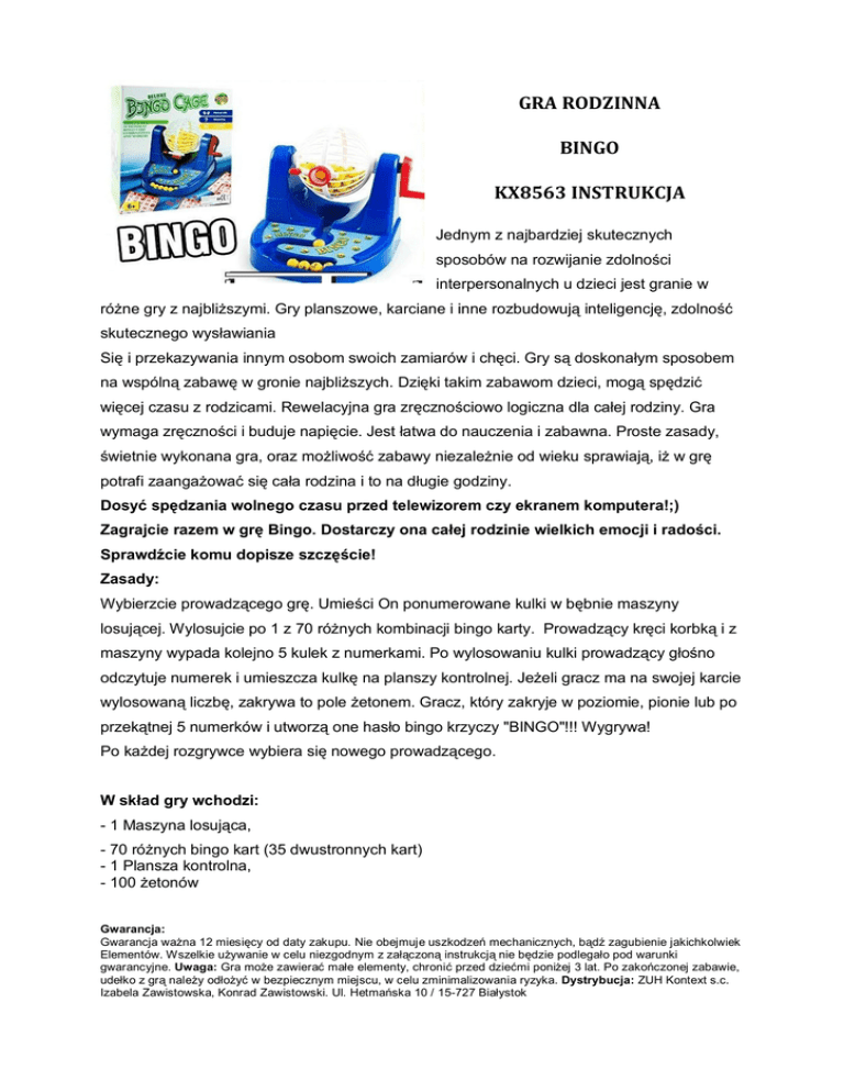 GRA RODZINNA BINGO KX8563 INSTRUKCJA Jednym z najbardziej skutecznych sposobów na rozwijanie zdolności interpersonalnych u dzieci jest granie w różne gry z najbliższymi. Gry planszowe, karciane i inne rozbudowują inteligencję, zdolność skutecznego wysławiania Się i przekazywania innym osobom swoich zamiarów i chęci. Gry są doskonałym sposobem na wspólną zabawę w gronie najbliższych. Dzięki takim zabawom dzieci, mogą spędzić więcej czasu z rodzicami. Rewelacyjna gra zręcznościowo logiczna dla całej rodziny. Gra wymaga zręczności i buduje napięcie. Jest łatwa do nauczenia i zabawna. Proste zasady, świetnie wykonana gra, oraz możliwość zabawy niezależnie od wieku sprawiają, iż w grę potrafi zaangażować się cała rodzina i to na długie godziny. Dosyć spędzania wolnego czasu przed telewizorem czy ekranem komputera!;) Zagrajcie razem w grę Bingo. Dostarczy ona całej rodzinie wielkich emocji i radości. Sprawdźcie komu dopisze szczęście! Zasady: Wybierzcie prowadzącego grę. Umieści On ponumerowane kulki w bębnie maszyny losującej. Wylosujcie po 1 z 70 różnych kombinacji bingo karty. Prowadzący kręci korbką i z maszyny wypada kolejno 5 kulek z numerkami. Po wylosowaniu kulki prowadzący głośno odczytuje numerek i umieszcza kulkę na planszy kontrolnej. Jeżeli gracz ma na swojej karcie wylosowaną liczbę, zakrywa to pole żetonem. Gracz, który zakryje w poziomie, pionie lub po przekątnej 5 numerków i utworzą one hasło bingo krzyczy "BINGO"!!! Wygrywa! Po każdej rozgrywce wybiera się nowego prowadzącego. W skład gry wchodzi: - 1 Maszyna losująca, - 70 różnych bingo kart (35 dwustronnych kart) - 1 Plansza kontrolna, - 100 żetonów Gwarancja: Gwarancja ważna 12 miesięcy od daty zakupu. Nie obejmuje uszkodzeń mechanicznych, bądź zagubienie jakichkolwiek Elementów. Wszelkie używanie w celu niezgodnym z załączoną instrukcją nie będzie podlegało pod warunki gwarancyjne. Uwaga: Gra może zawierać małe elementy, chronić przed dziećmi poniżej 3 lat. Po zakończonej zabawie, udełko z grą należy odłożyć w bezpiecznym miejscu, w celu zminimalizowania ryzyka. Dystrybucja: ZUH Kontext s.c. Izabela Zawistowska, Konrad Zawistowski. Ul. Hetmańska 10 / 15-727 Białystok