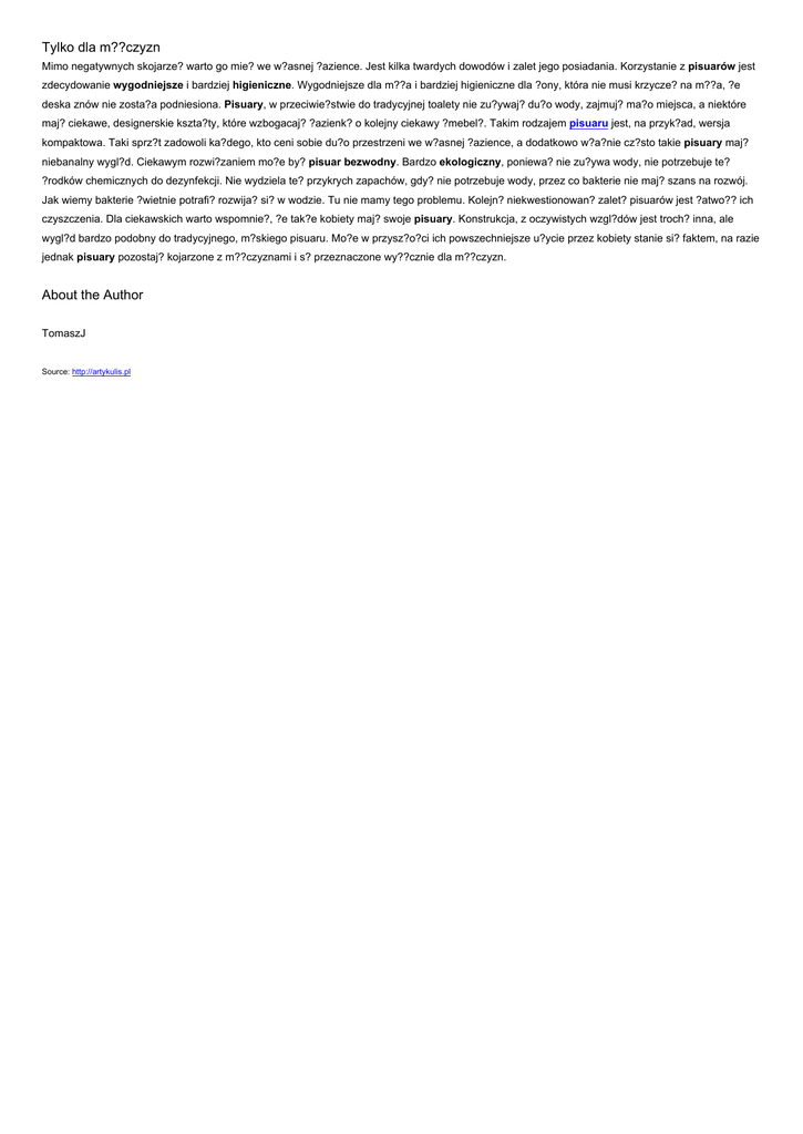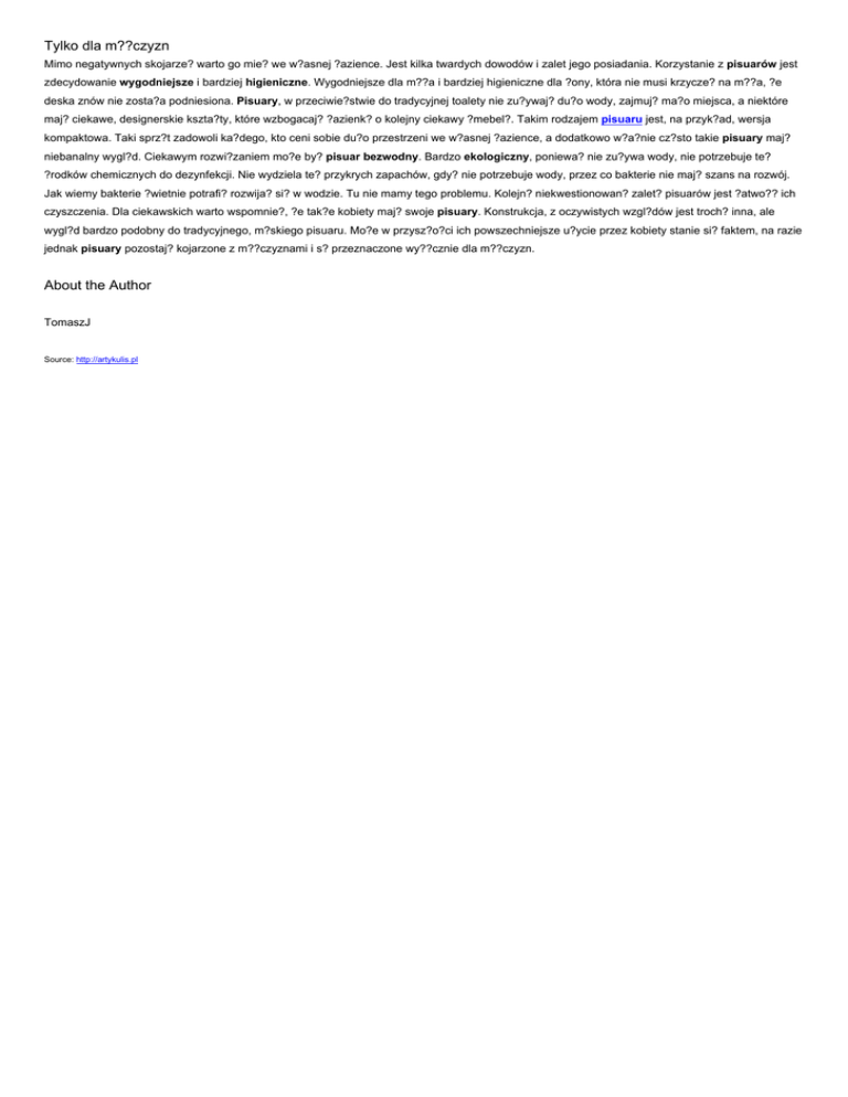 Tylko dla m??czyzn Mimo negatywnych skojarze? warto go mie? we w?asnej ?azience. Jest kilka twardych dowodów i zalet jego posiadania. Korzystanie z pisuarów jest zdecydowanie wygodniejsze i bardziej higieniczne. Wygodniejsze dla m??a i bardziej higieniczne dla ?ony, która nie musi krzycze? na m??a, ?e deska znów nie zosta?a podniesiona. Pisuary, w przeciwie?stwie do tradycyjnej toalety nie zu?ywaj? du?o wody, zajmuj? ma?o miejsca, a niektóre maj? ciekawe, designerskie kszta?ty, które wzbogacaj? ?azienk? o kolejny ciekawy ?mebel?. Takim rodzajem pisuaru jest, na przyk?ad, wersja kompaktowa. Taki sprz?t zadowoli ka?dego, kto ceni sobie du?o przestrzeni we w?asnej ?azience, a dodatkowo w?a?nie cz?sto takie pisuary maj? niebanalny wygl?d. Ciekawym rozwi?zaniem mo?e by? pisuar bezwodny. Bardzo ekologiczny, poniewa? nie zu?ywa wody, nie potrzebuje te? ?rodków chemicznych do dezynfekcji. Nie wydziela te? przykrych zapachów, gdy? nie potrzebuje wody, przez co bakterie nie maj? szans na rozwój. Jak wiemy bakterie ?wietnie potrafi? rozwija? si? w wodzie. Tu nie mamy tego problemu. Kolejn? niekwestionowan? zalet? pisuarów jest ?atwo?? ich czyszczenia. Dla ciekawskich warto wspomnie?, ?e tak?e kobiety maj? swoje pisuary. Konstrukcja, z oczywistych wzgl?dów jest troch? inna, ale wygl?d bardzo podobny do tradycyjnego, m?skiego pisuaru. Mo?e w przysz?o?ci ich powszechniejsze u?ycie przez kobiety stanie si? faktem, na razie jednak pisuary pozostaj? kojarzone z m??czyznami i s? przeznaczone wy??cznie dla m??czyzn. About the Author TomaszJ Source: http://artykulis.pl