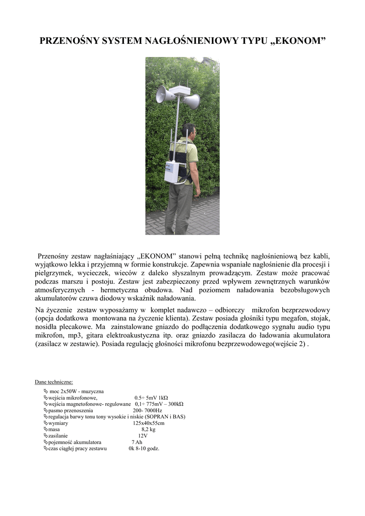 PRZENOŚNY SYSTEM NAGŁOŚNIENIOWY TYPU „EKONOM” Przenośny zestaw nagłaśniający „EKONOM” stanowi pełną technikę nagłośnieniową bez kabli, wyjątkowo lekka i przyjemną w formie konstrukcje. Zapewnia wspaniałe nagłośnienie dla procesji i pielgrzymek, wycieczek, wieców z daleko słyszalnym prowadzącym. Zestaw może pracować podczas marszu i postoju. Zestaw jest zabezpieczony przed wpływem zewnętrznych warunków atmosferycznych - hermetyczna obudowa. Nad poziomem naładowania bezobsługowych akumulatorów czuwa diodowy wskaźnik naładowania. Na życzenie zestaw wyposażamy w komplet nadawczo – odbiorczy mikrofon bezprzewodowy (opcja dodatkowa montowana na życzenie klienta). Zestaw posiada głośniki typu megafon, stojak, nosidła plecakowe. Ma zainstalowane gniazdo do podłączenia dodatkowego sygnału audio typu mikrofon, mp3, gitara elektroakustyczna itp. oraz gniazdo zasilacza do ładowania akumulatora (zasilacz w zestawie). Posiada regulację głośności mikrofonu bezprzewodowego(wejście 2) . Dane techniczne: moc 2x50W - muzyczna wejścia mikrofonowe, 0.5÷ 5mV 1kΏ wejścia magnetofonowe- regulowane 0,1÷ 775mV – 300kΏ pasmo przenoszenia 200- 7000Hz regulacja barwy tonu tony wysokie i niskie (SOPRAN i BAS) wymiary 125x40x55cm masa 8,2 kg zasilanie 12V pojemność akumulatora 7 Ah czas ciągłej pracy zestawu 0k 8-10 godz. Ze względu bezpieczeństwa, podczas transportu, zestaw mikrofonowy bezprzewodowy jest zapakowany w oddzielnym kartonie (anteny – uszkodzenia, złamania). W celu poprawnego działania zestawu nagłaśniającego i mikrofonu bezprzewodowego należy odbiornik zamontować zgodnie z poniższym schematem. W górnej części zestawu zamontowano hermetyczny pojemnik do montażu urządzenia nadawczoodbiorczego (odbiornika zestawu mikrofonowego bezprzewodowego). Odkręcić sześć sztuk śrub mocujących pokrywę górną obudowy hermetycznej. W pojemniku zamontowano przewód wejściowy do podłączenia sygnału z odbiornika bezprzewodowego wtyk JACK (nr 4) ) ze wzmacniaczem układu, oraz przewód zasilający 12V napięcia stałego do zasilania odbiornika bezprzewodowego – wtyk DC2,3/5.5(nr5). Po zakończeniu podłączeń załączyć wzmacniacz i odbiornik , włączyć również nadajniki mikrofonowe i ustawić pokrętłami regulacji odbiornika oraz pokrętłem wzmocnienia na wejściu nr 2 poziom sygnału wejściowego ( przed wysyłaniem towaru sygnał jest dopasowywany w siedzibie firmy ECHO AQUSTIC – wyrób nie powinien wymagać ustawiania regulacji ). Ostatni etap montażu to montaż anten do do pokrywy i odbiornika za pomocą rzepów. W praktyce montaż mikrofonu bezprzewodowego polega na dobraniu wielkości odbiornika który można umieścić w hermetycznym pojemniku , odpowiednim zasilaniu (12V). Po zakończeniu pracy z zestawem EKONOM można w prosty sposób wymontować odbiornik z zestawu EKONOM ( w pojemniku hermetycznym odkręcić 6 śrub mocujących pokrywę, odłączyć przewód zasilający i sygnałowy ) i używać go do bieżących potrzeb – np. do pracy bezpośrednio w kościele, szkole itp. R o zmieszczenie elementów i gniazd. 1. 2. 3. 4. 5. 6. 7. 8. 9. 10. Regulacja wzmocnienia sygnału audio na WEJŚCIE 1 Regulacja wzmocnienia sygnału audio na WEJŚCIE 2 (mikrofon bezprzewodowy) Regulacja barwy tonów niskich (BAS) Regulacja barwy tonów wysokich (SOPRAN) Przełącznik czułości wejścia MIC/LINE Sygnalizator diodowy stopnia naładowania akumulatora Włącznik zasilania zestawu (załączenia) Bezpiecznik 1,6A Gniazdo wejściowe do podłączenia zasilacza układu ładowania akumulatora – zasilacz w zestawie Gniazdo wejściowe typu XLR (WEJSCIE 1) Opis zestawu mikrofonowego bezprzewodowego Dwukanałowy, 2 mikrofony Zasilacz 13,5V Częstotliwość 174-216Mhz Zasięg działania do 50m Czułość 3uV dla 30dB Pasmo 50Hz - 15Khz Zasilanie odbiornika 13,5V Zasilanie mikrofonu bateria 9V Temperatura pracy od -10 stopni do 40 stopni Wymiary odbiornika 227mm x 127mm x 34mm Opis ładowarka do akumulatorów żelowych 12V Zasilanie: 100-240V 50/60Hz Napięcie ładowania: 10-15V DC Ładowanie: w trzech etapach Do akumulatorów: 12V, 4-7Ah Przybliżony czas ładowania: 8h Max. moc wyjściowa: 14W Skuteczność: >75% Kontrola diodowa stanu ładowania („ładowanie” kolor czerwony, „naładowane” kolor zielony) produ k cja: E C H O A Q U S T I C S. C. 89-620 C H O J N I C E U L. Łuzy c k a 3 tel/fax 052 3951182 w w w.in st ala cje.e cho a qu sti c.co m.pl