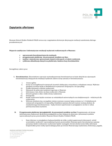 Zapytanie ofertowe Muzeum Historii Żydów Polskich POLIN zwraca się z zapytaniem ofertowym dotyczącym realizacji zamówienia, którego przedmiotem jest: Wsparcie analityczne i informatyczne ewaluacji wydarzeń realizowanych w Muzeum : opracowanie kwestionariusza do ewaluacji, przygotowanie platformy do prezentacji wyników on-line; analiza i statystyczne opracowanie danych zebranych w trakcie wydarzeń, cykliczna aktualizacja danych na platformie, budowa bazy benchmarków Szczegółowy zakres prac: I. Kwestionariusz. Zleceniobiorca opracuje wystandaryzowany kwestionariusz na bazie dotychczas używanych kwestionariuszy służących do ewaluacji wydarzeń. Zakres oceny zawarty w kwestionariuszu: i. ii. iii. iv. v. vi. vii. viii. ix. II. Ocena ogólna Ocena na szczegółowych wymiarach (wartość edukacyjna, rozrywkowa, wzbudzane emocje. Wybrane działania oceniane będą na dodatkowych wymiarach związanych z ich specyfiką) Źródła informacji o danym wydarzeniu Skłonność do polecenia wydarzeń tego typu w Muzeum Informacja o tym, która raz dana osoba jest w Muzeum Otwarte pytanie o silne i słabe strony wydarzenia Demografia Każde wydarzenie będzie oceniane na wskaźnikach uniwersalnych oraz dedykowanych – właściwych dla wydarzenia. Wybrane działania (np. szczególnie istotne wystawy czasowe będą oceniane na 1-2 dodatkowych wymiarach związanych z ich specyfiką. Dodatkowe pytania dla tych wystaw zostaną dodane do standardowego kwestionariusza – będą również raportowane w przeglądarce on-line w sekcji poświęconej danej wystawie. Przygotowanie platformy (przeglądarki) do prezentacji wyników on-line Przygotowanie, od strony informatycznej, badawczej i graficznej przeglądarki on-line służącej do zbierania i prezentacji wyników wprowadzonych przez pracowników Muzeum Historii Żydów Polskich POLIN. i. Dane zbierane w przeglądarce będą pochodziły nie tylko z ankiet papierowych zbieranych wśród uczestników wydarzeń i wprowadzanych przez pracowników Muzeum (patrz kwestionariusz opisany powyżej). Każde ewaluowane wydarzenie będzie wymagało również dostarczenia kilku informacji bezpośrednio przez osobę wprowadzającą dane po stronie Muzeum (typ wydarzenia, frekwencja, pogoda, ii. iii. iv. v. vi. vii. viii. ix. x. xi. III. promocja, ewentualnie ważne wydarzenie w Warszawie mogące stanowić istotną konkurencję dla wydarzenia ewaluowanego) Przeglądarka będzie umożliwiała wizualizację i prezentację danych Dostęp do przeglądarki będą mieli wybrani pracownicy Muzeum (ok. 10 osób). Przeglądarka będzie dawała możliwość dostosowania jej do przyszłych ewentualnych modyfikacji kwestionariusza. Dane w przeglądarce będą zaprezentowane w atrakcyjnej i klarownej formie graficznej. Dane z przeglądarki będą mogły być łatwo eksportowane do pliku (np. pdf lub ppt) Jeśli przeglądarka będzie rozwiązaniem dedykowanym dla Muzeum, a nie zrobionym w oparciu o istniejące rozwiązania, Zleceniobiorca jest zobowiązany przekazać Zleceniodawcy licencję na jej użytkowanie, kody źródłowe oraz pełną dokumentację techniczną w takiej formie, aby Muzeum Historii Żydów Polskich POLIN mogło, po wygaśnięciu umowy ze Zleceniobiorcą dalej z przeglądarki korzystać, jak również powierzyć jej rozwój innemu Zleceniobiorcy. Jednocześnie Zleceniobiorca ma prawo, po niezbędnych modyfikacjach, zaproponować przeglądarkę innemu klientowi. Zleceniobiorca zorganizuje szkolenie z korzystania z przeglądarki dla jej użytkowników w Muzeum. Przeglądarka musi mieć czytelny i przyjazny dla użytkowników interfejs. Jeśli przeglądarka będzie rozwiązaniem dedykowanym dla Muzeum, jej hosting może leżeć po stronie Muzeum Historii Żydów Polskich POLIN. W takiej sytuacji przeglądarka musi być oparta na rozwiązaniach open source. Analiza i statystyczne opracowanie danych zebranych w trakcie wydarzeń; cykliczna aktualizacja danych na platformie, budowa bazy benchmarków i. Ankiety w formie papierowej będą samodzielnie wypełniane przez uczestników wydarzeń organizowanych przez Muzeum. Zbieranie ankiet papierowych, wprowadzanie danych z ankiet do przeglądarki oraz wprowadzanie dodatkowych informacji dot. wydarzeń (np. frekwencja, pogoda, etc. ) leżeć będzie po stronie Muzeum. Ewaluacji będzie podlegać 5 standardowych wydarzeń miesięcznie. Dodatkowo w okresie od 1 września do 31 grudnia 2016 ewaluacji podlegać będą 4 wydarzenia specjalne ii. Dane z ewaluacji będą przekazywane przez Muzeum Zleceniobiorcy w ustalonym formacie, po każdym ewaluowanym wydarzeniu. iii. Po stronie Zleceniobiorcy będzie cykliczne analizowane danych zebranych w ramach ewaluacji wydarzeń i ich statystyczne opracowanie iv. Po stronie Zleceniobiorcy będzie cykliczna aktualizacja danych i prezentacja w przeglądarce online. Wyniki dotyczące wydarzenia będą umieszczane w przeglądarce maksymalnie w ciągu kilkunastu dni od danego wydarzenie v. Po stronie Zleceniobiorcy leży również budowa bazy benchmarków, powstała dzięki zbieraniu danych z kolejnych wydarzeń. W konsekwencji każdą wystawę lub wydarzenie będzie można ocenić na tle średniej z kolejnych miesięcy i kwartałów. Umożliwi to formułowanie bardziej ogólnych rekomendacji na temat tego, co dobrze działa, co wpływa na wysoką ocenę, a co na niską. Kryteria oceny ofert: 1) Cena (netto): 70 proc. Oferta o najniższej cenie otrzymuje maksymalną liczbę 70 pkt. Ocenie będzie podlegać łączna cena netto za opracowanie kwestionariusza i dostosowanej przeglądarki internetowej oraz ewaluację 6 aktywności w miesiącu (5 standardowych i jedno specjalne) w okresie od 1 września do 31 grudnia 2016. W przypadku wykorzystania przeglądarki opartej na gotowych rozwiązaniach wycena powinna dodatkowo zawierać koszty licencji za użytkowanie w roku 2017 (do 10 stanowisk) 2) Portfolio: 20 proc. Za to kryterium oferta może otrzymać maksymalnie 20 pkt. Oferent proszony